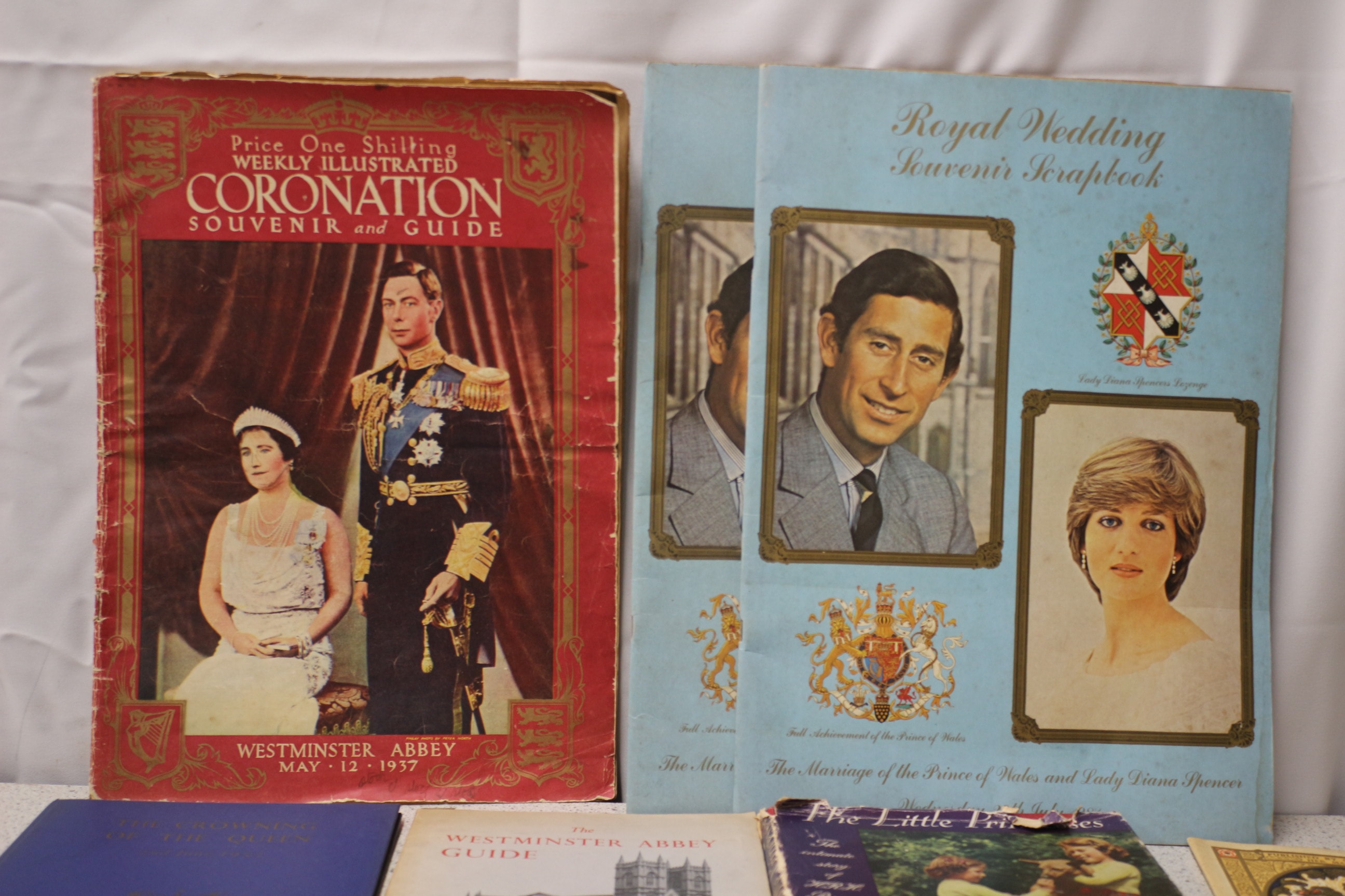 A collection of multiple commemorative books, magazines, newspapers, booklets, envelopes, and two coins, featuring royal themes including the 1937 Coronation, 1981 Royal Wedding, Queen Mother, Queen Elizabeth II, and a 1978 Guernsey First Day Cover.