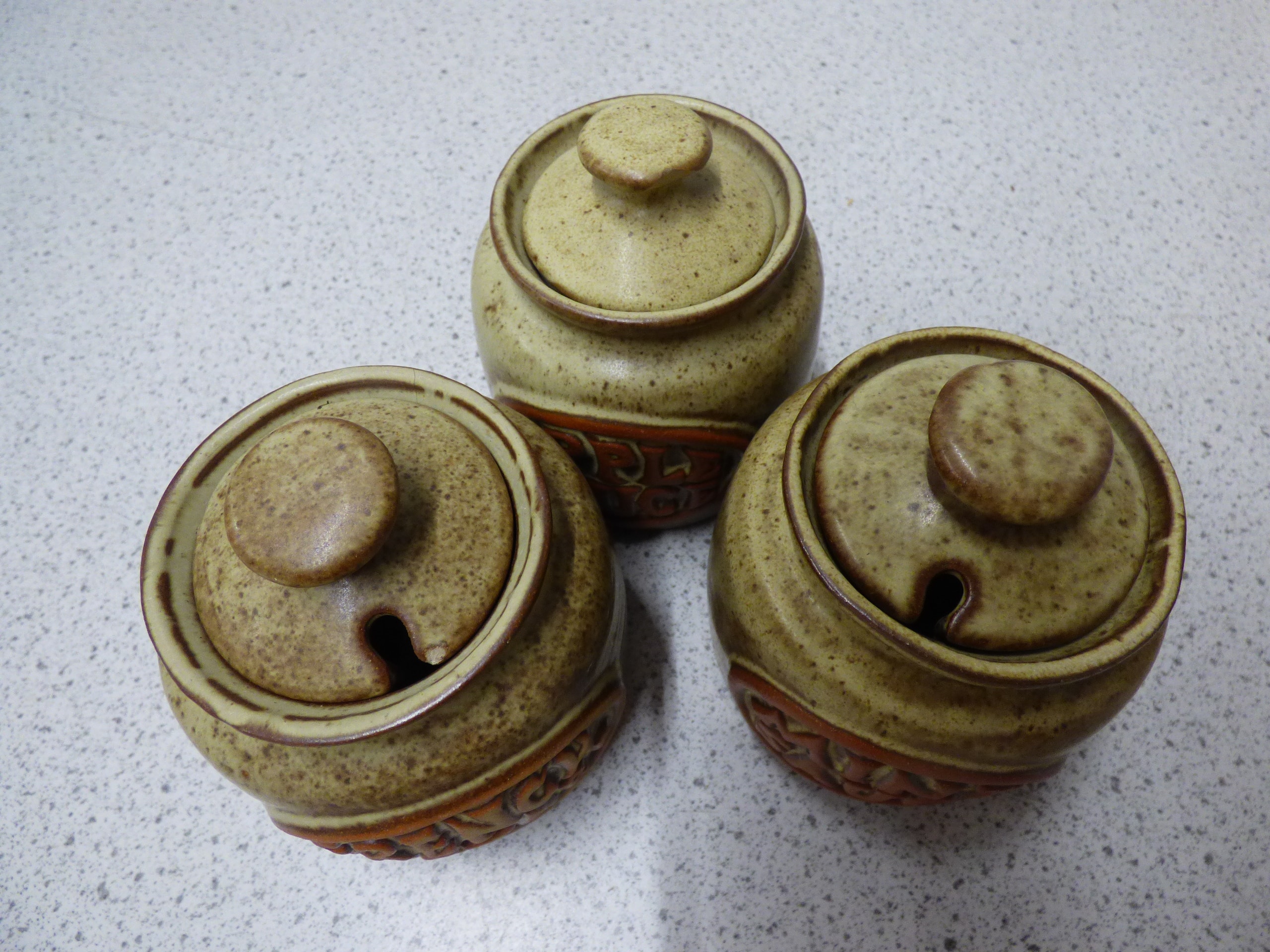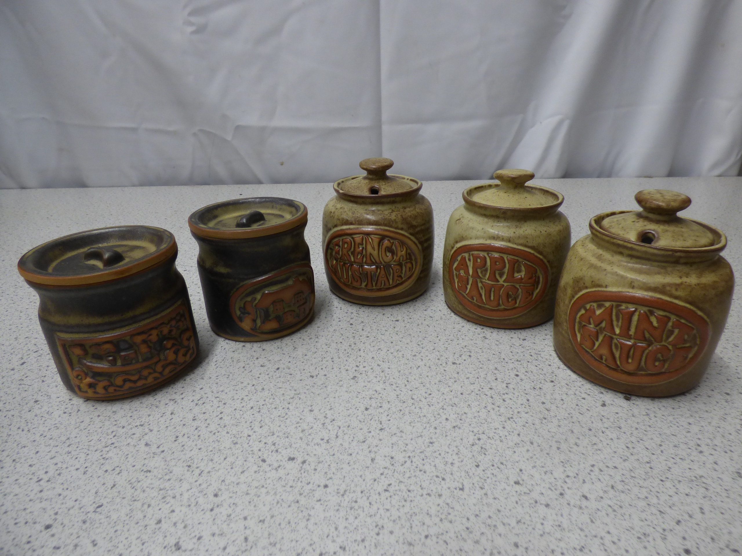 A collection of five vintage studio pottery lidded jars, three Tremar Pots labelled “French Mustard, ” “Apple Sauce, ” and “Mint Sauce, ” and two with embossed designs.