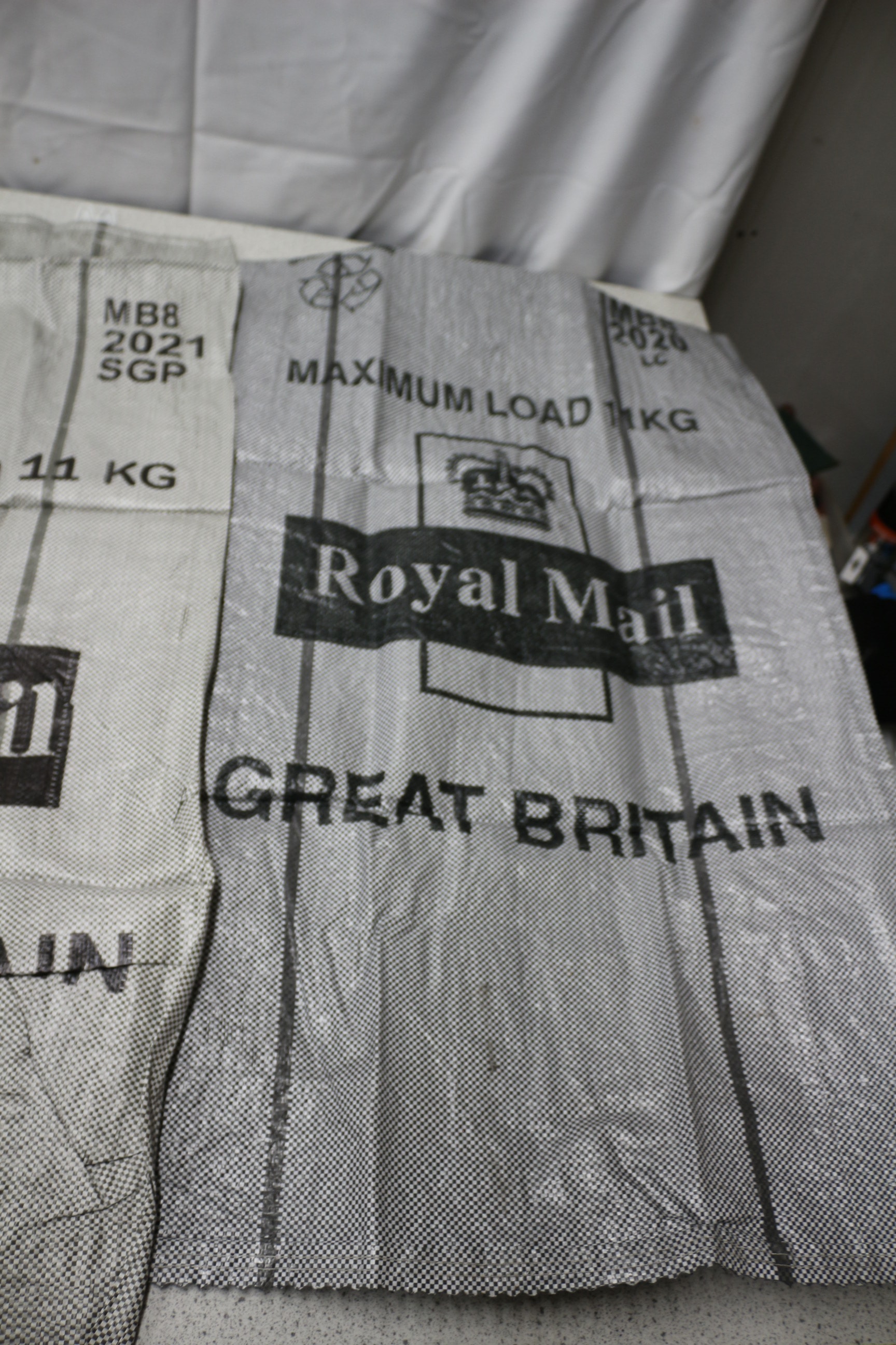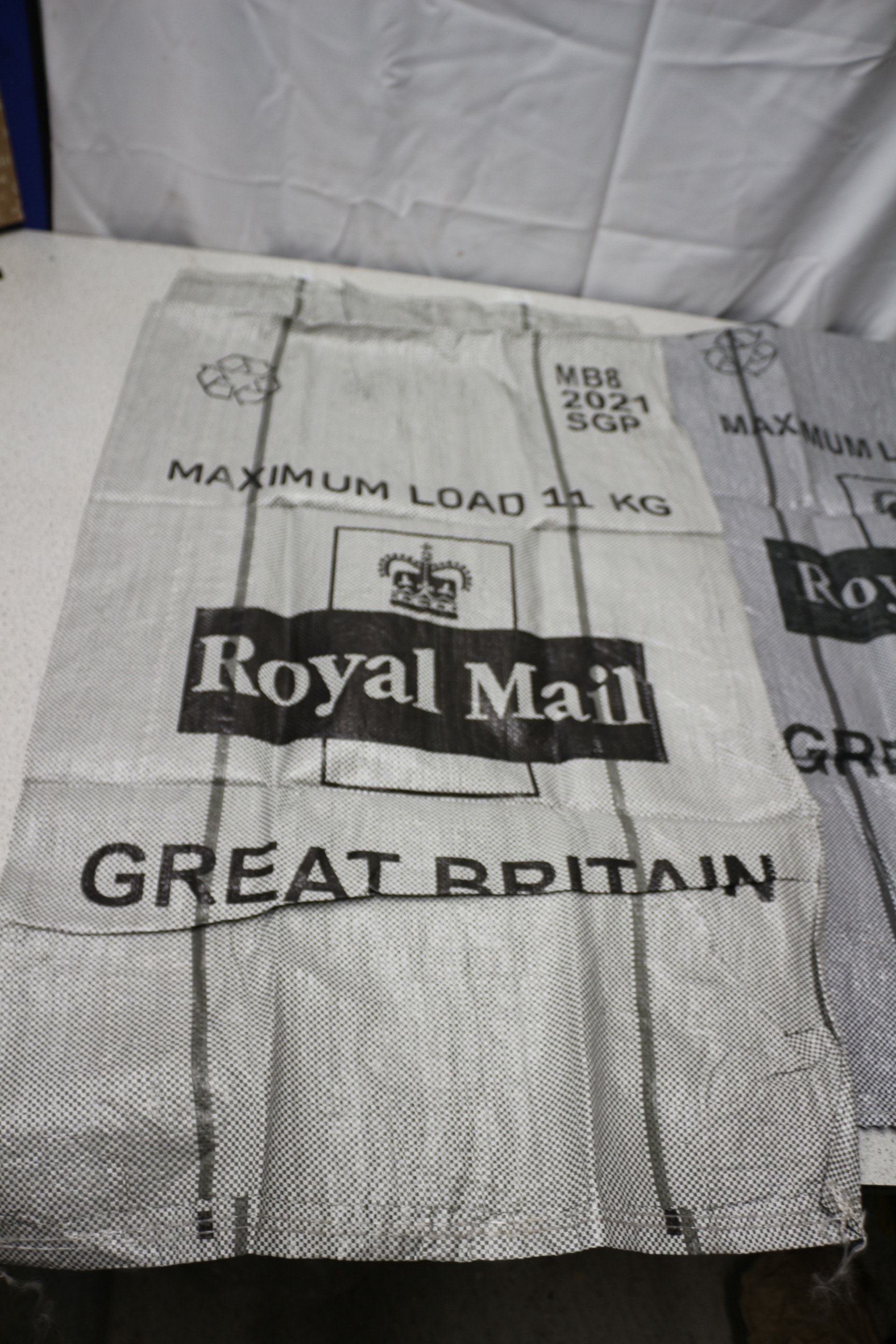 A pair of grey and white Royal Mail sacks, each printed with a crown logo, ‘Royal Mail’, ‘GREAT BRITAIN’, and ‘MAXIMUM LOAD 11 KG’, with one dated 2021 and the other 2020.