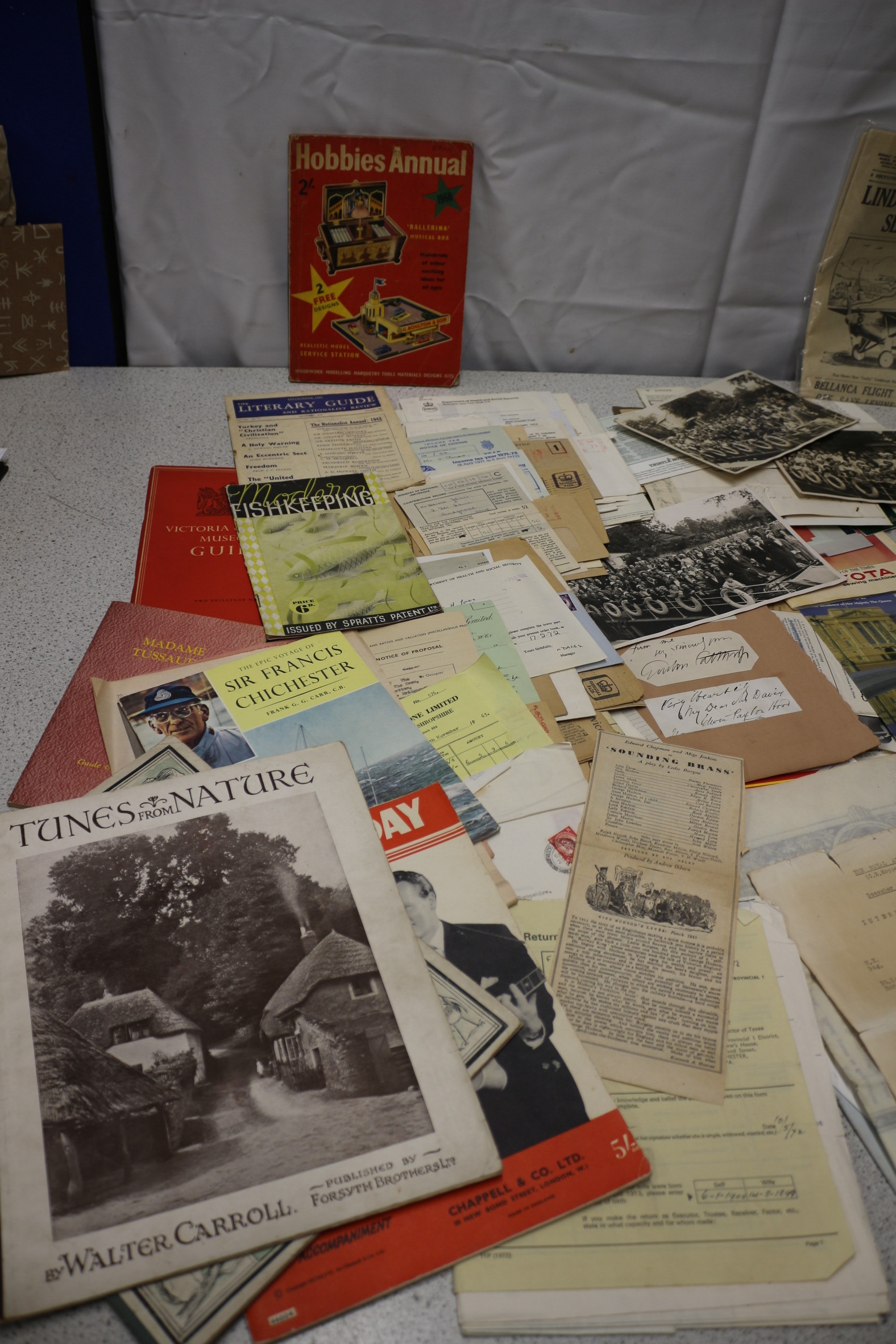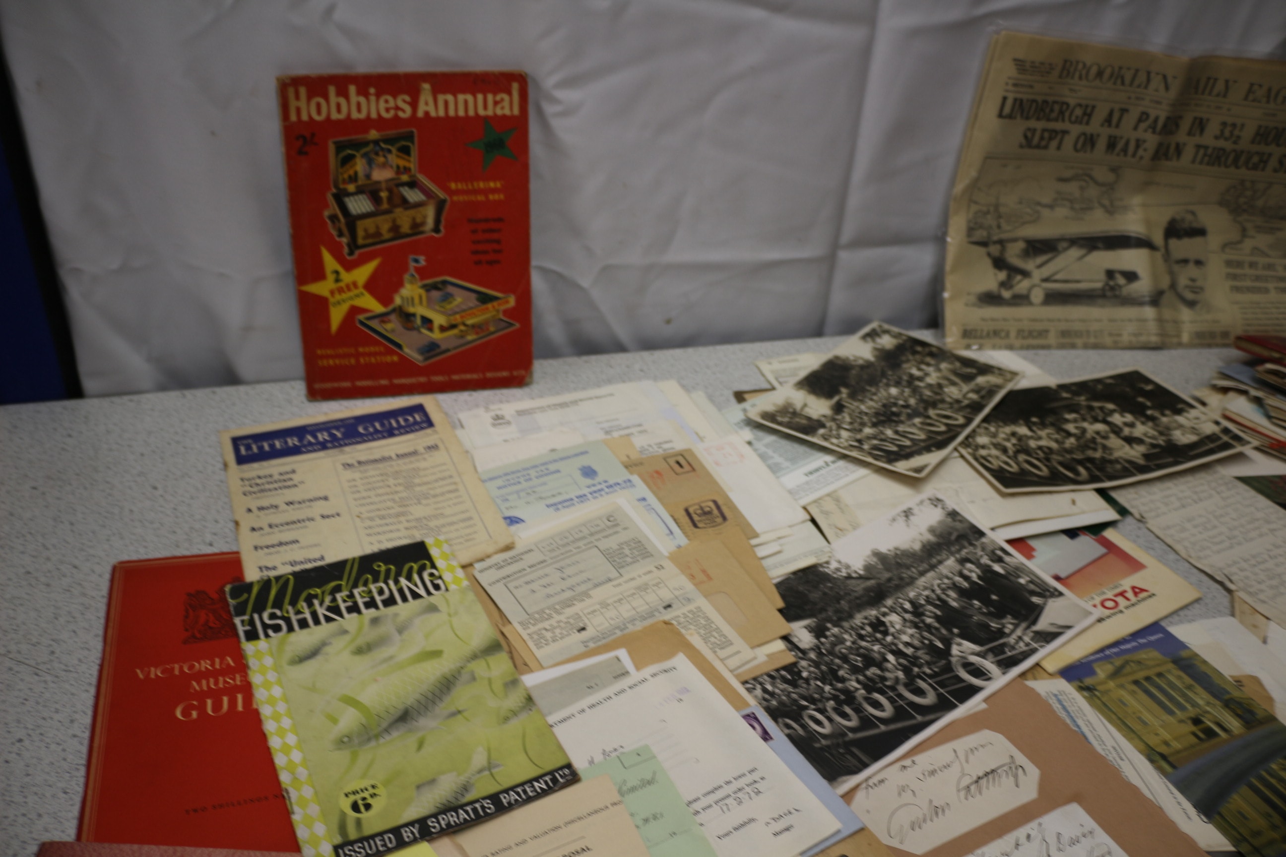 A large collection of miscellaneous paper ephemera, including numerous books, magazines, pamphlets, documents, and black and white photographs, predominantly in white, cream, and yellowed tones, with visible labels such as ‘Hobbies Annual’, ‘BROOKLYN DAILY EAGLE’, ‘FISHKEEPING’, and various handwritten inscriptions.