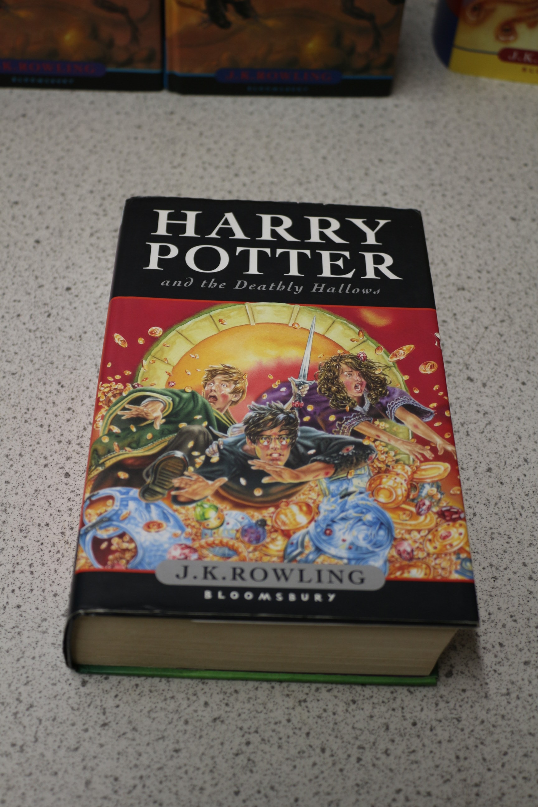 A collection of eight Harry Potter books by J.K. Rowling, published by Bloomsbury, including one dark grey and gold ‘Order of the Phoenix’, two ‘Goblet of Fire’, two yellow ‘Order of the Phoenix’, one ‘Philosopher’s Stone’, one ‘Deathly Hallows’, and one ‘Prisoner of Azkaban’.