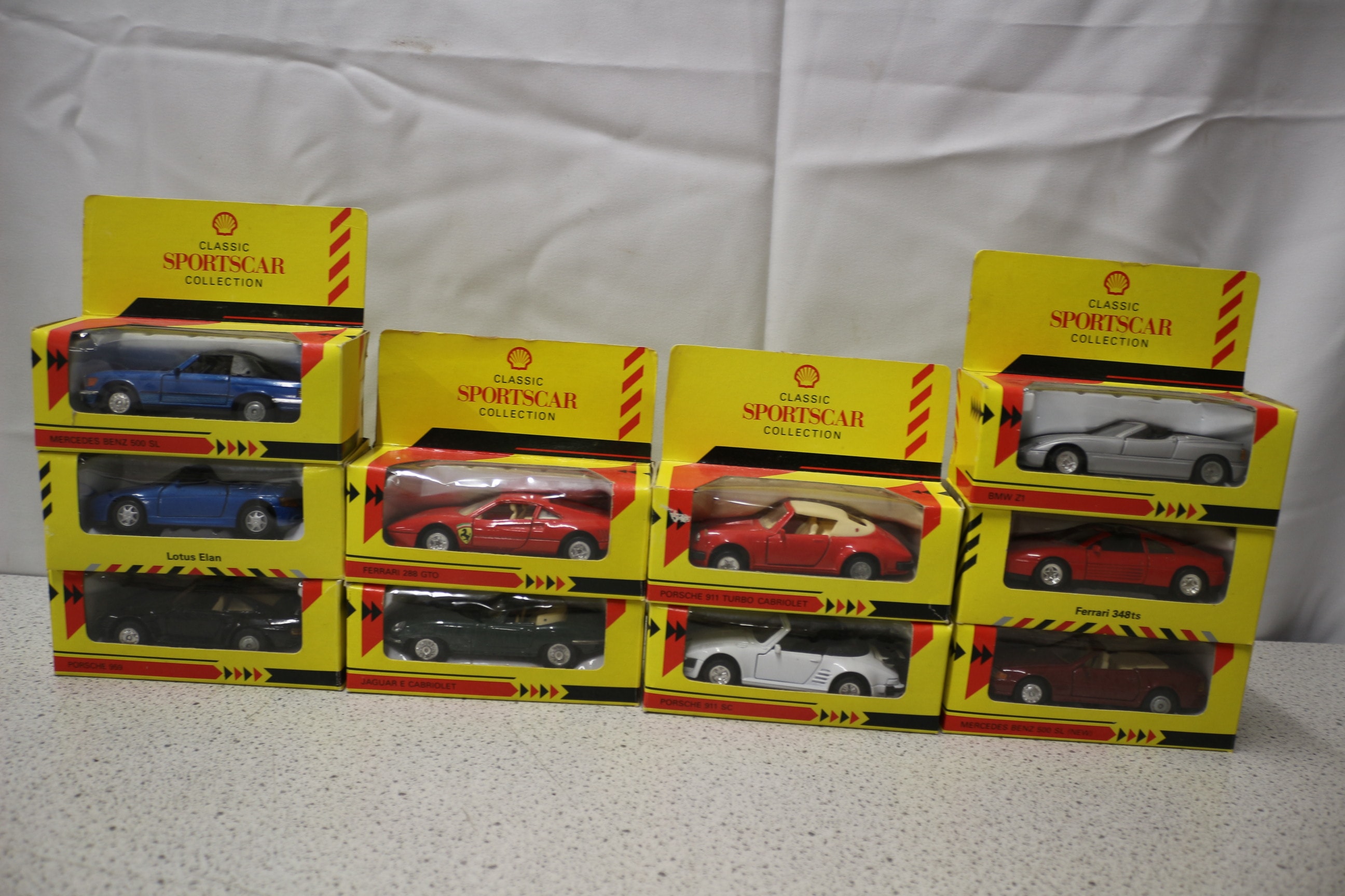 A collection of ten Shell Classic Sportscar Collection 1:43 scale diecast model cars, each in original packaging.