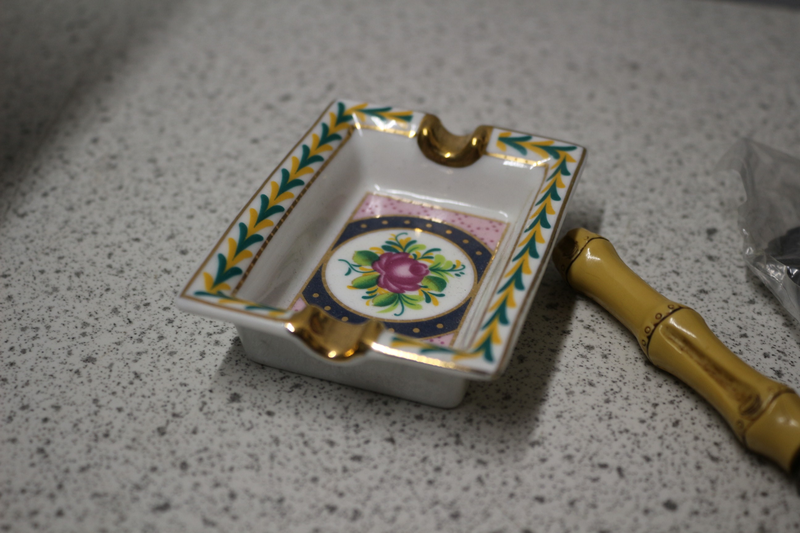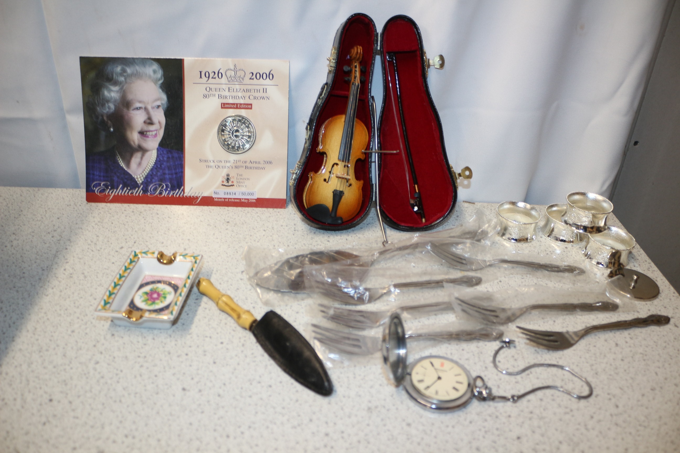 The lot includes a Queen Elizabeth II 80th Birthday Crown coin by THE LONDON MINT OFFICE, a miniature brown violin with bow in case, silver-coloured forks, four silver-coloured embossed napkin rings, a SEKONDA 18 JEWELS pocket watch, a ceramic dish, and a small black-bladed knife.