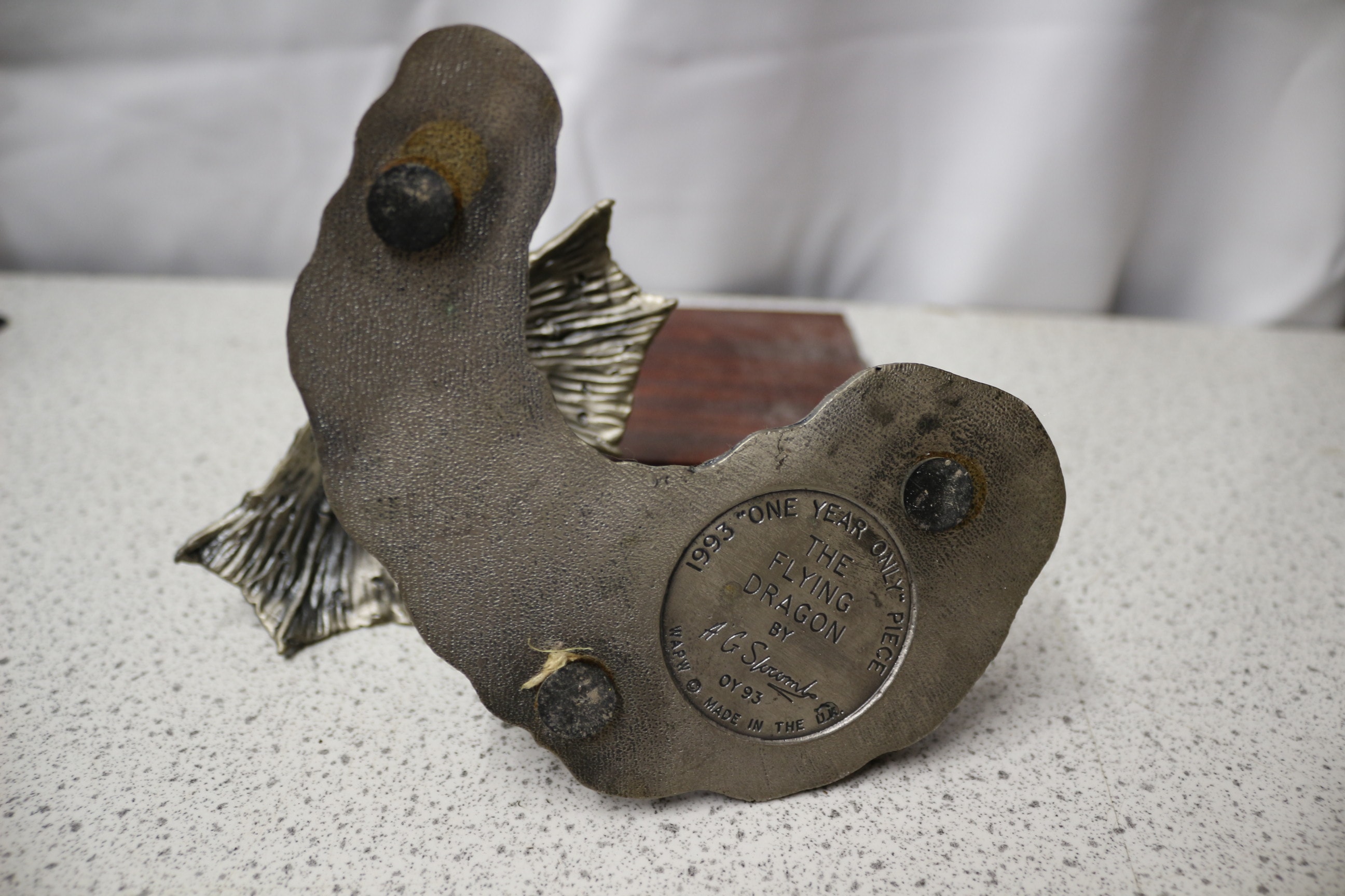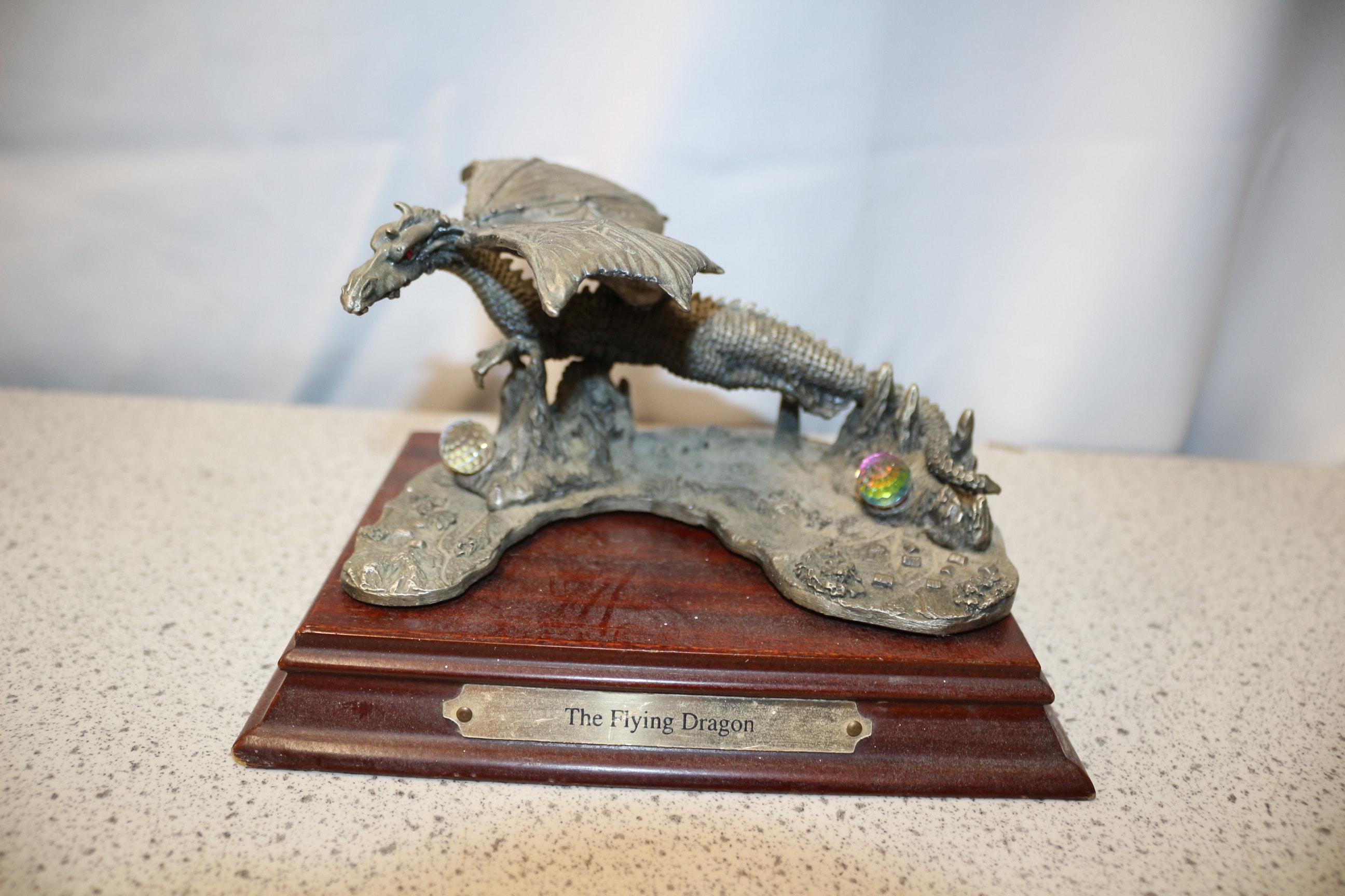 A metallic silver/pewter dragon figurine with red eyes, titled ‘The Flying Dragon’, designed by H. G. Schoonraab in 1993 as a ‘ONE YEAR ONLY’ PIECE (OY93), made in the USA, and mounted on a dark brown wooden base adorned with two iridescent orbs. 16cm tall