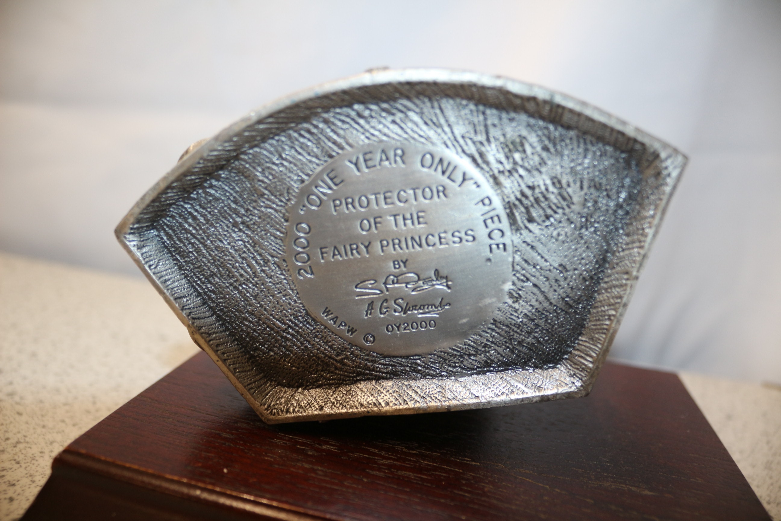 A silver-coloured pewter figurine depicting a dragon protecting a reclining fairy princess, mounted on a dark reddish-brown wooden base with a multi-coloured gem, inscribed ‘2000 ONE YEAR ONLY PIECE’ and ‘PROTECTOR OF THE FAIRY PRINCESS’.