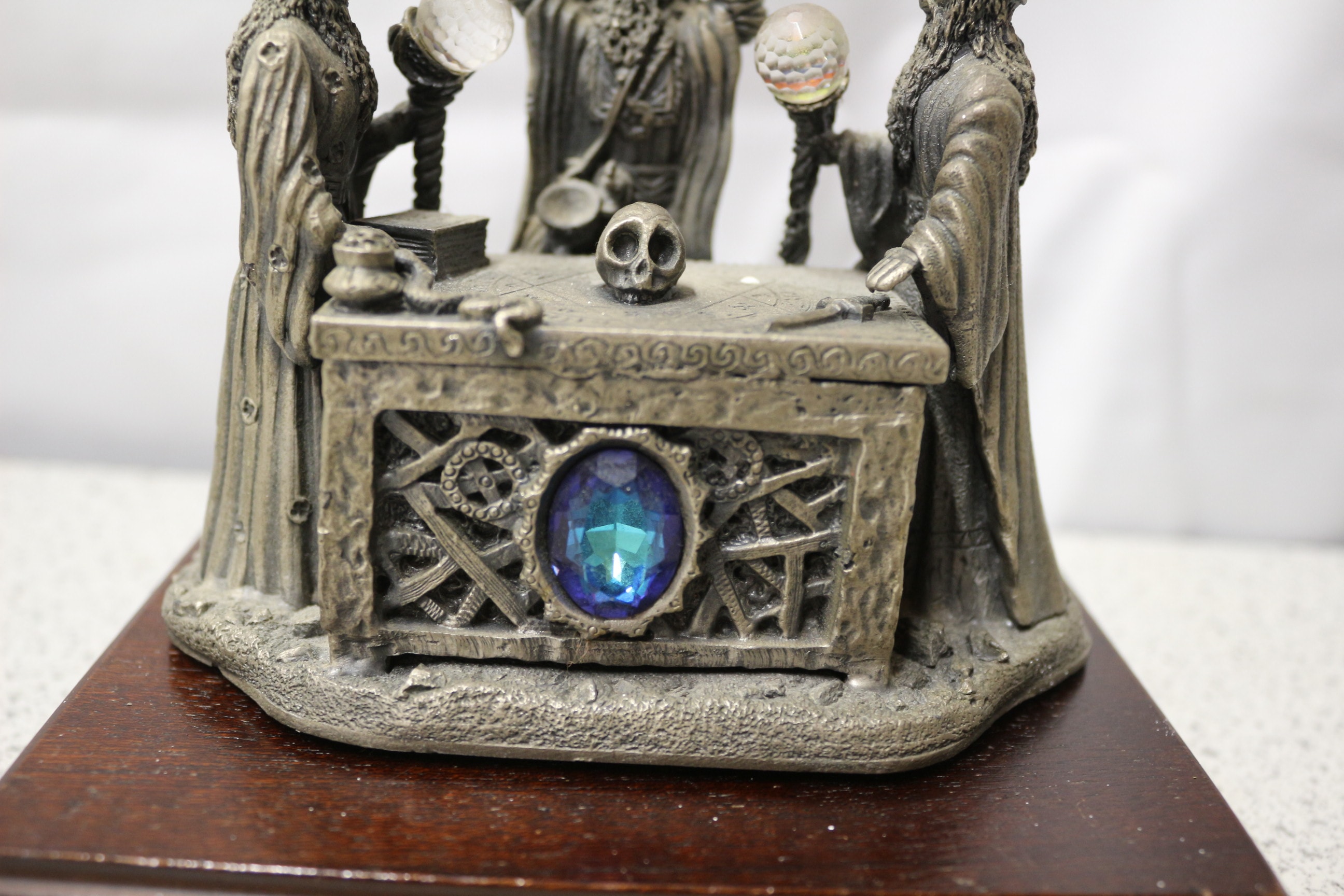 A metallic grey/silver pewter figurine, ‘The Altar of Enlightenment’ by Mark Zöker, depicting three robed figures around an altar with a blue gem and iridescent orbs on a dark brown wooden base. 13cm tall