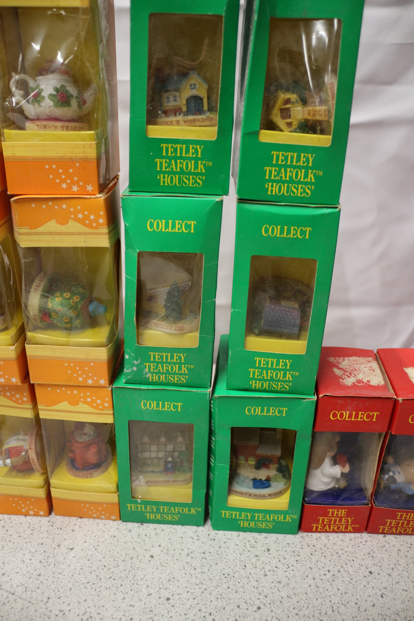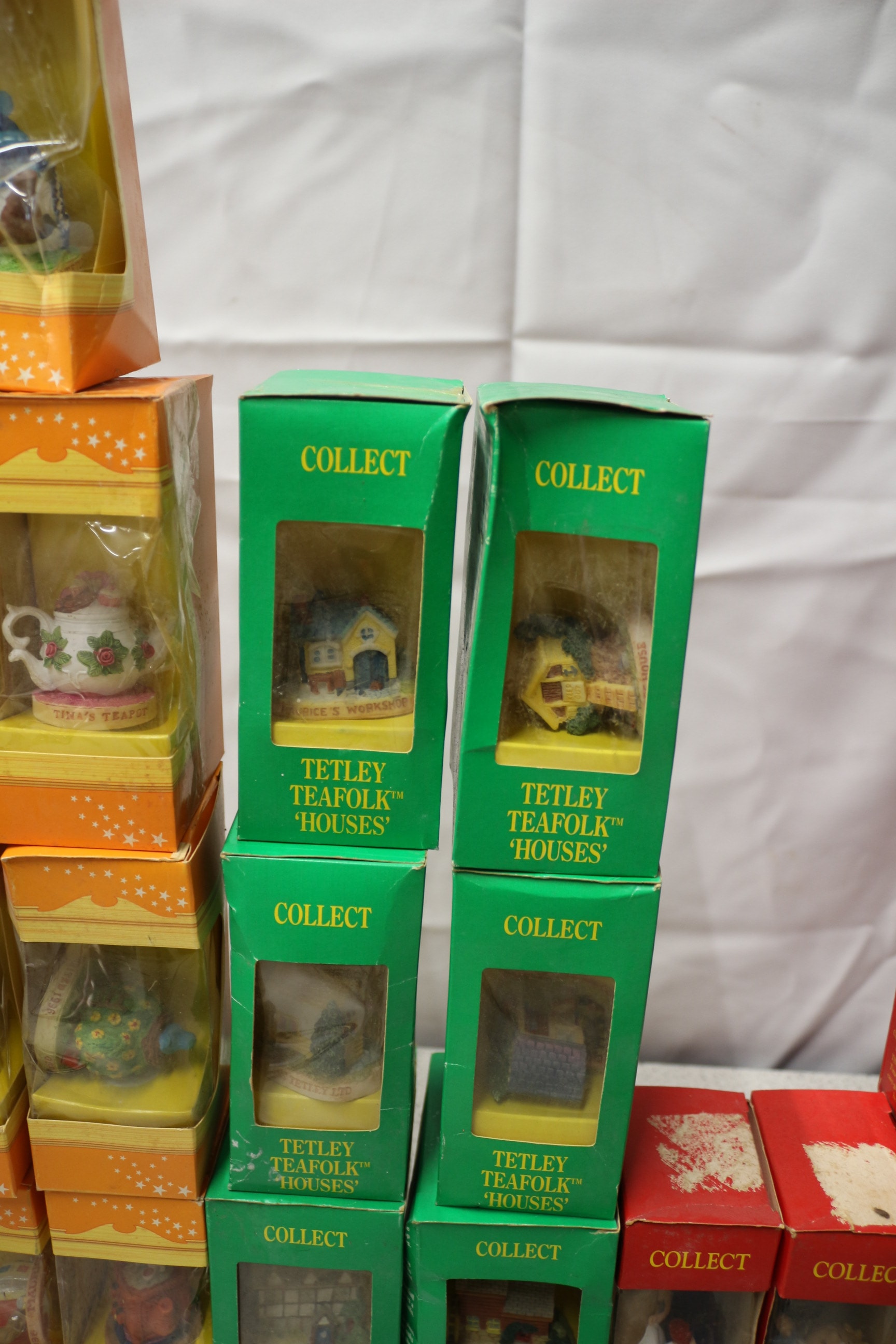 A collection of 27 assorted Tetley Teafolk™ collectible miniature figurines and houses, presented in orange, green, red, and pink “COLLECT” display boxes, including “TINA’S TEAPOT”, “ALICE’S WORKSHOP”, “THE TETLEY TEAFOLK™”, and “TETLEY TEAFOLK™ MUSIC STARS” series, with multi-coloured figurines.