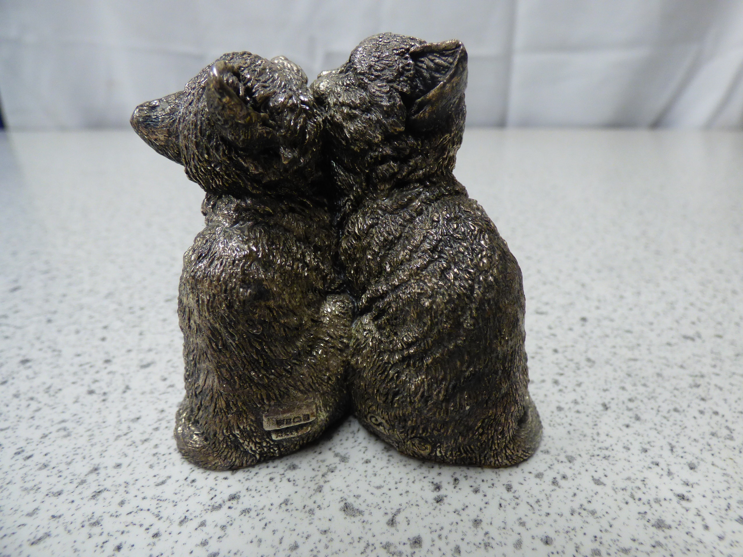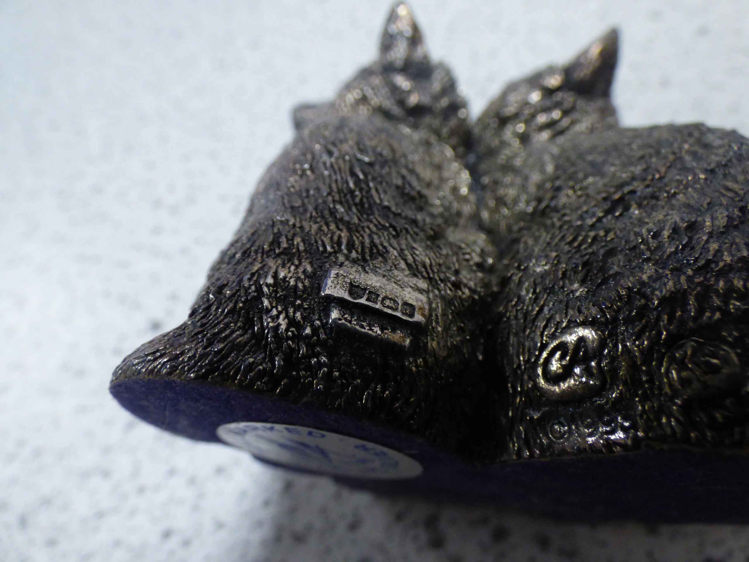 A dark metallic sculpture depicting two kittens, marked ‘HH & S’, lion passant, anchor, ‘s’, ‘CA’, and ‘HALLMARKED SILVER FILLED STERLING’, weighing 174.36g.