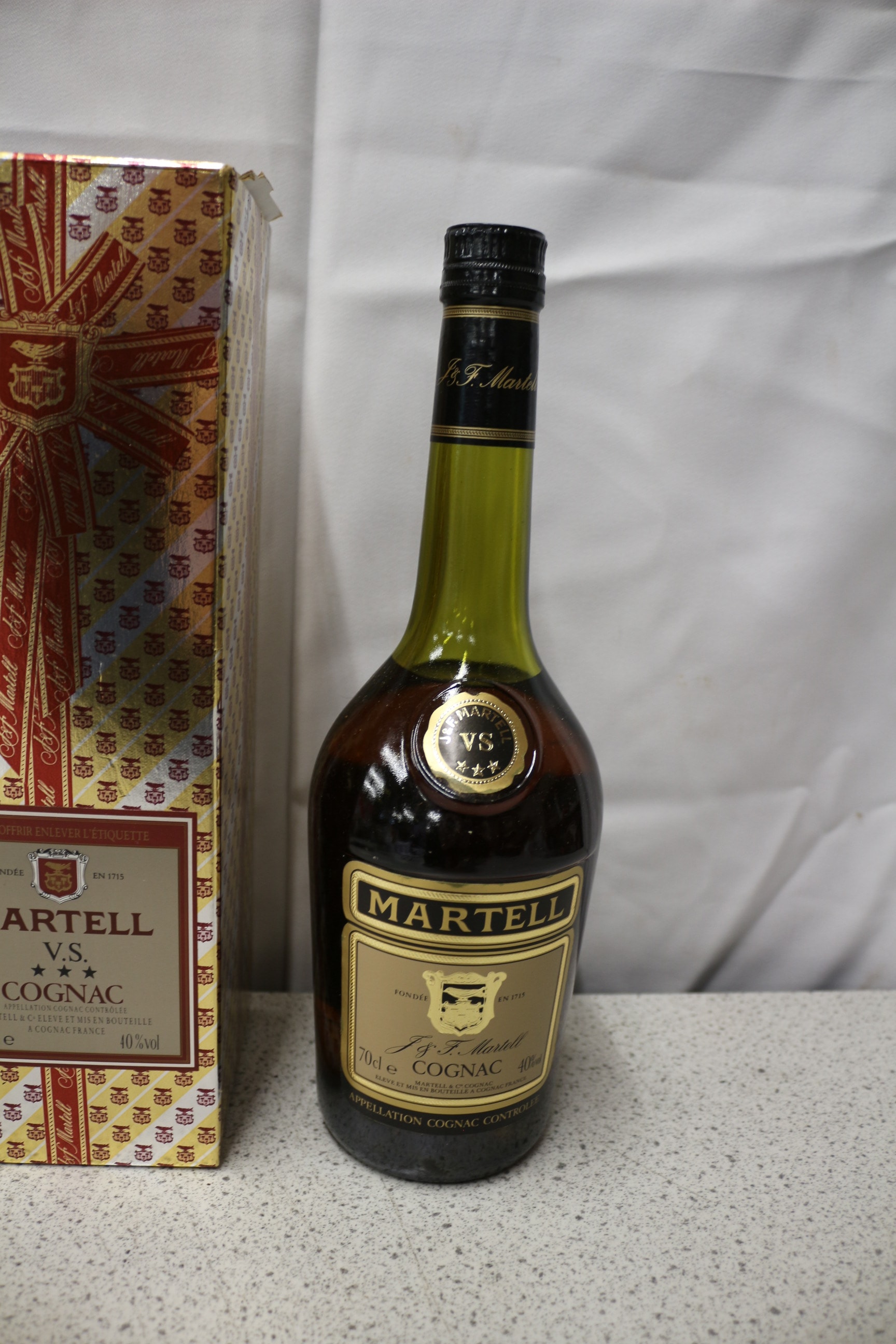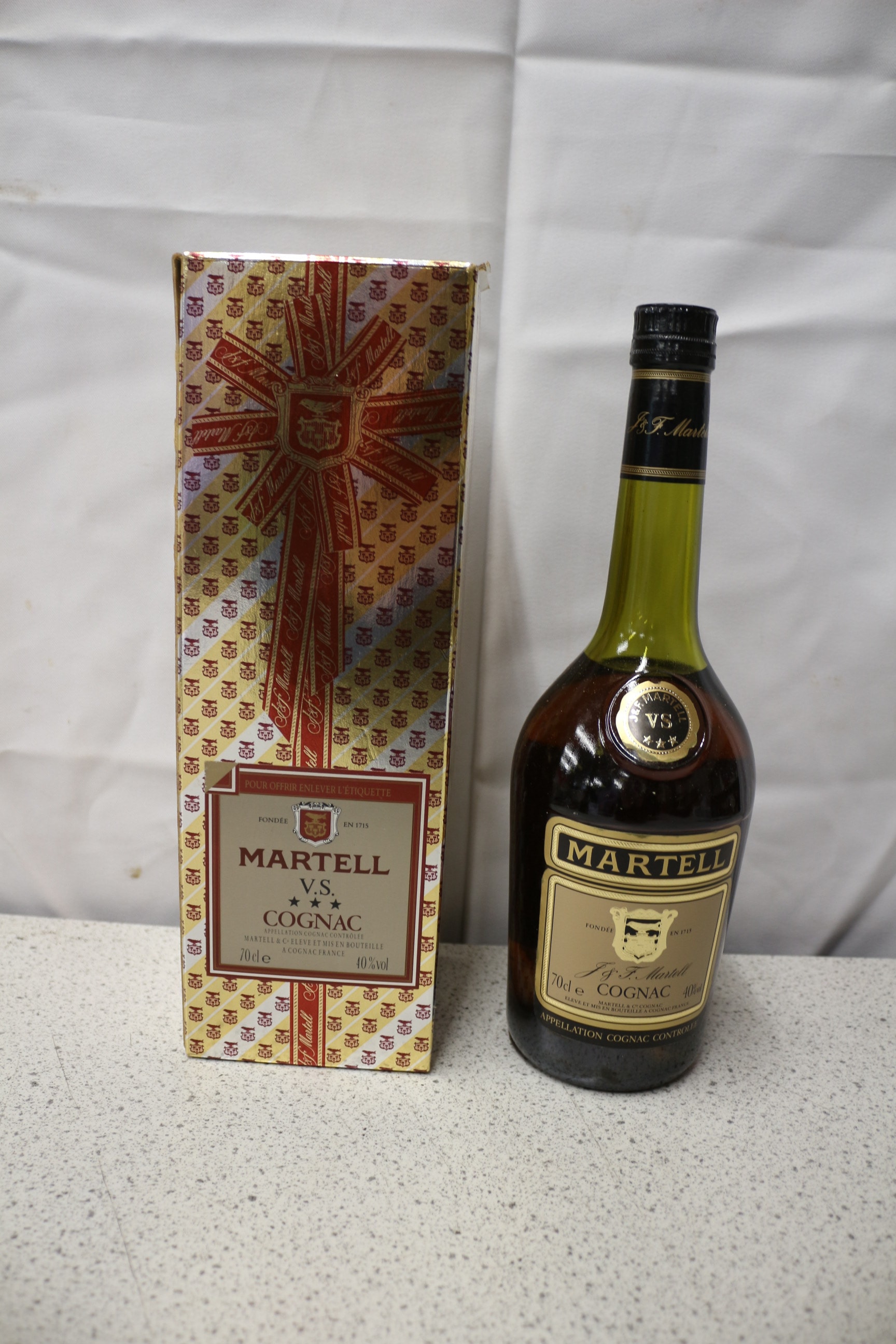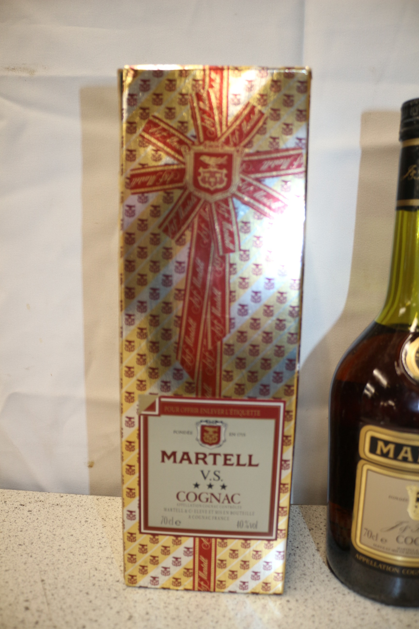 A Martell V.S. Cognac green glass bottle (70cl e, 40% vol) with its gold and red presentation box.