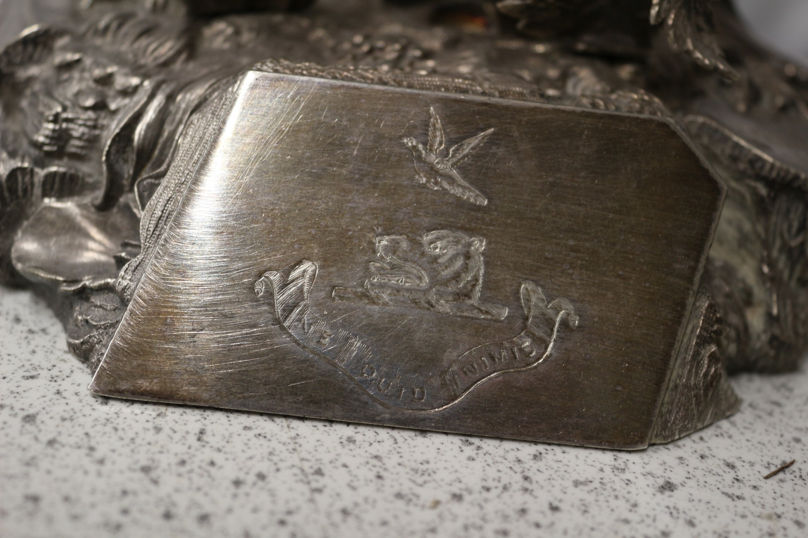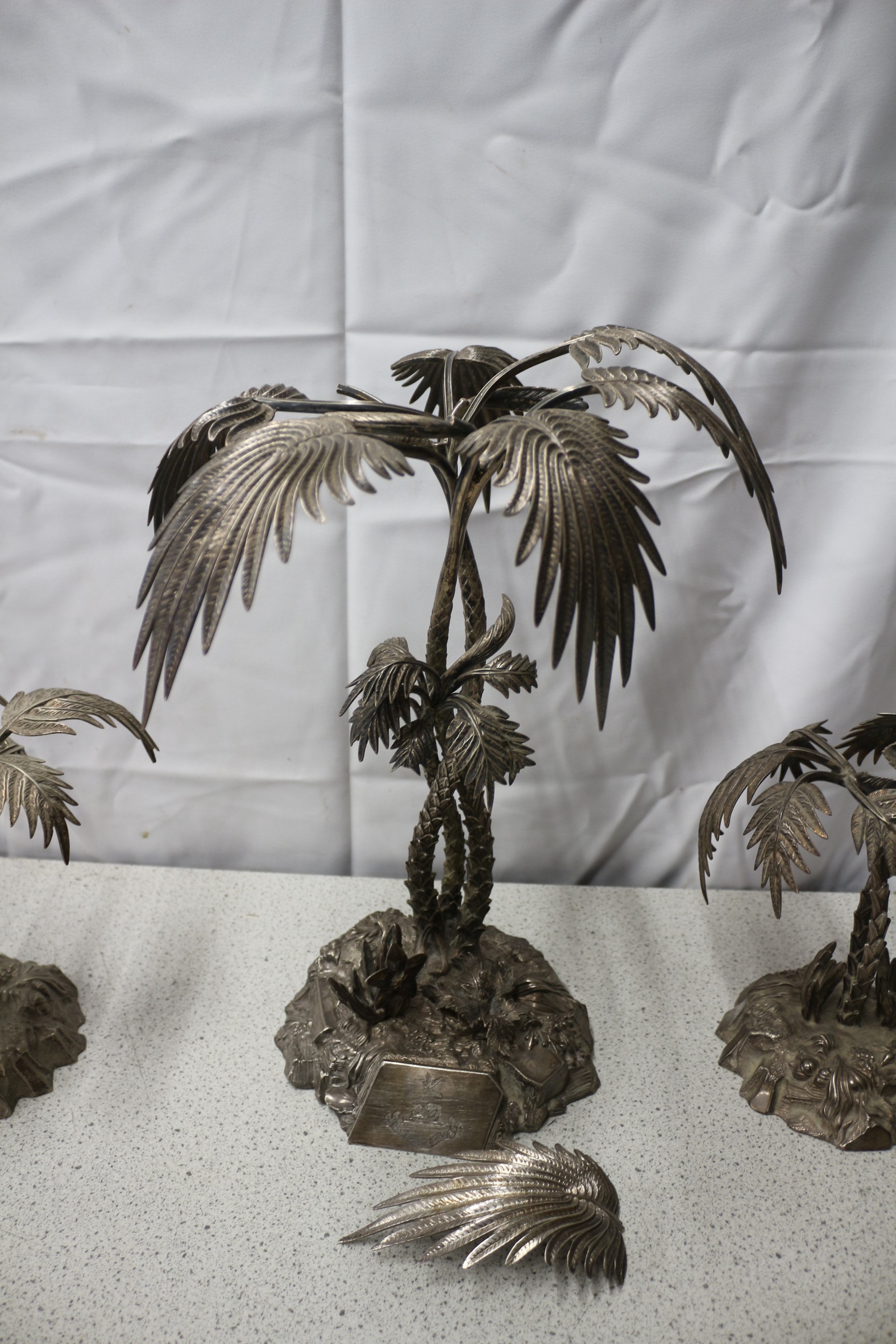 Three heavy silver-plated metal palm tree sculptures and one loose frond, the largest featuring a plaque inscribed with Latin and a Boars head and a bird above. The platers marks are hallmarked on each piece. Tallest 44cm. One in need of repair