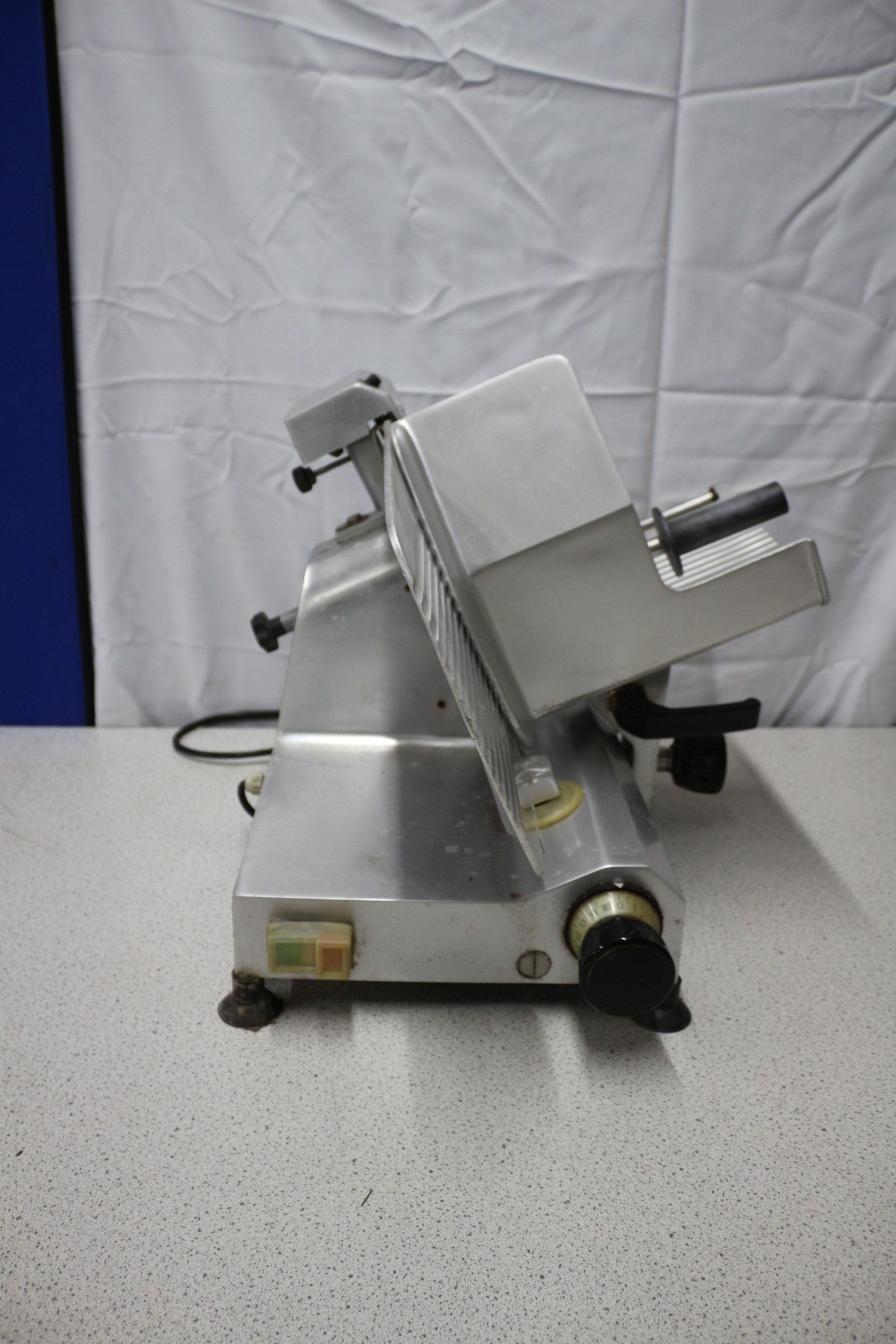 A stainless steel commercial food slicer by OMEGA FOODTECH, Type 300-AM, manufactured 03/2012 in Italy with a CE mark. Untested