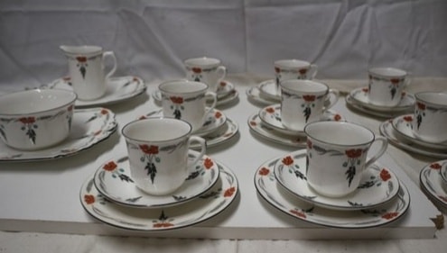 A 40-piece Shelley porcelain tea/coffee service, primarily white with an orange poppy, black foliage, and grey wheat stalk pattern, comprising 12 cups, 12 saucers, 12 plates, one creamer, and one serving bowl, marked ‘Shelley ENGLAND’ and pattern number ‘11326’.