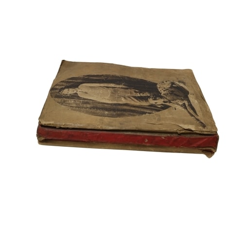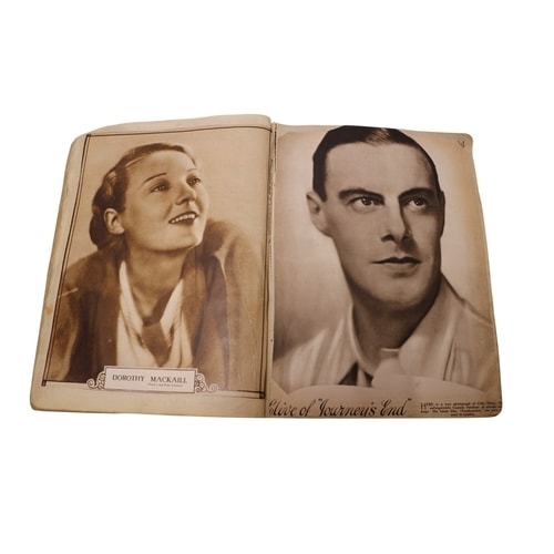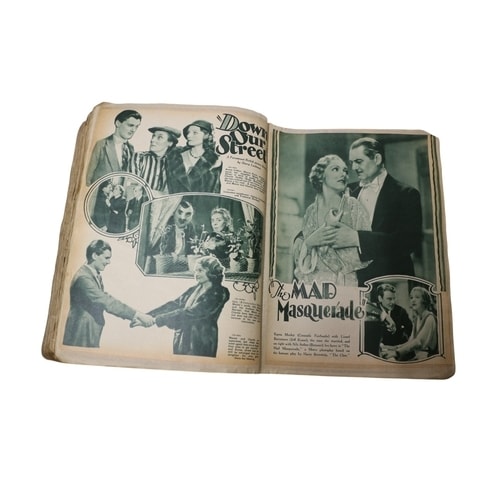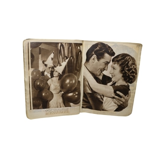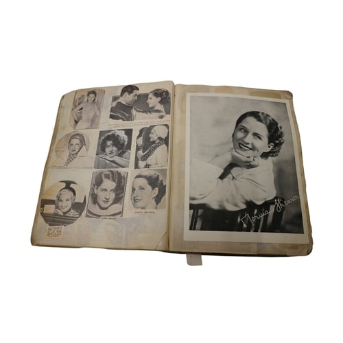 A vintage scrapbook, sepia-toned/black and white images, a brown/tan cover, and a red spine, featuring articles and images of Hollywood stars including Norma Shearer and Charlie Farrell.