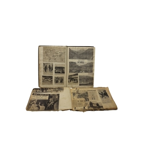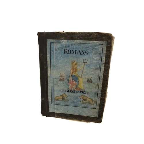 A collection comprising an open, dark-bound scrapbook with clippings and images, a stack of newspaper clippings, a page of multicoloured postage stamps, and a closed dark-bound book titled ‘ROMANS GEOGRAPHY’.