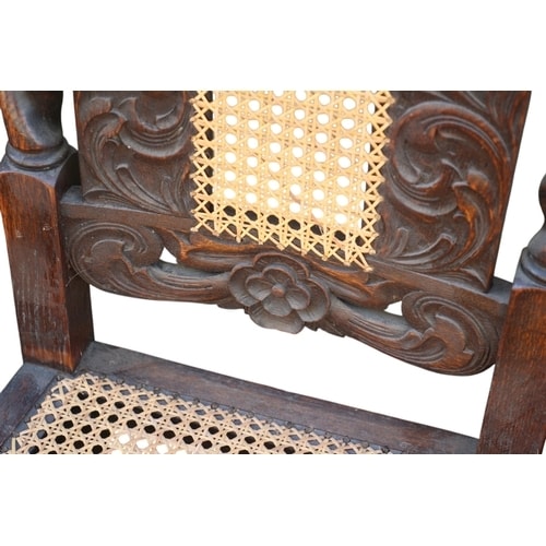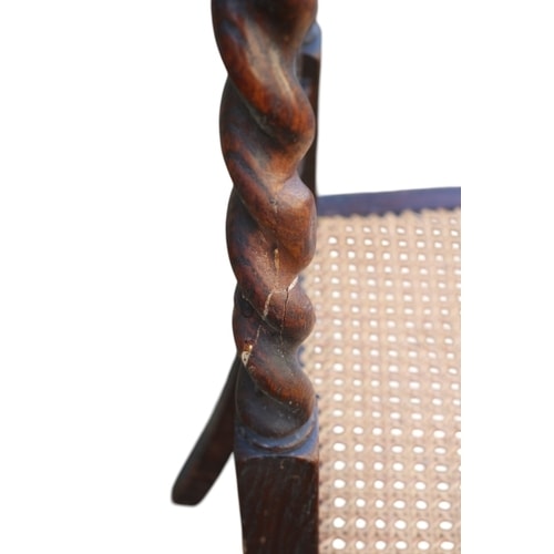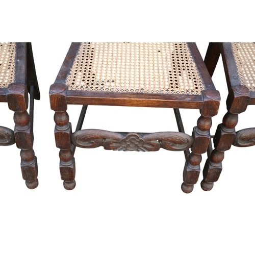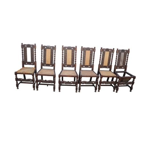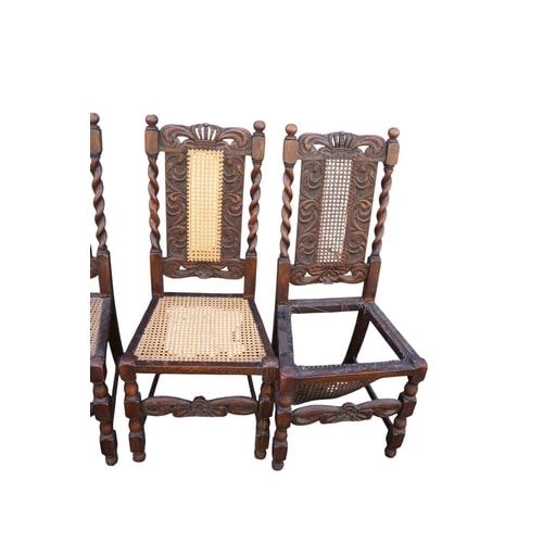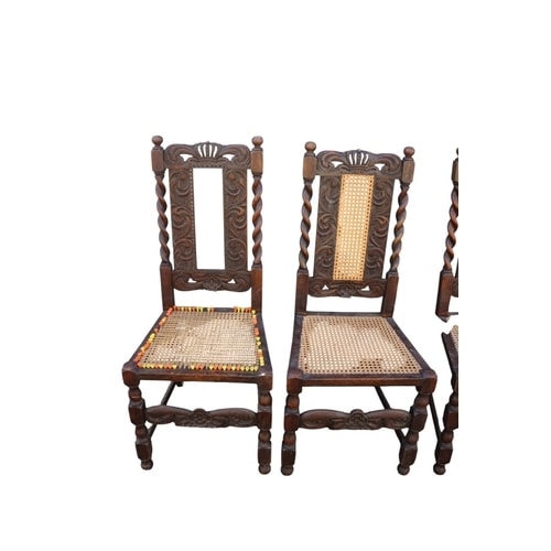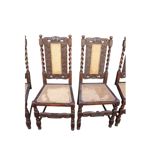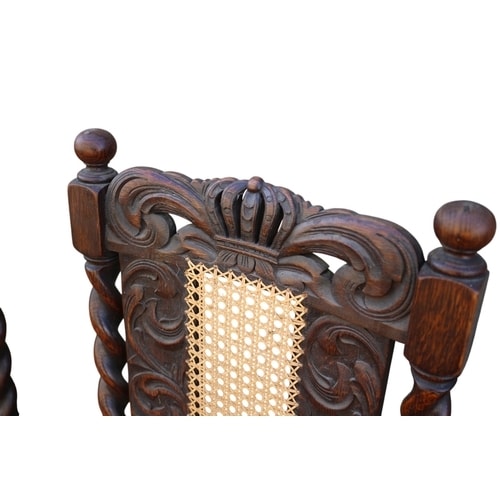 Set of Six Antique Barley Twists chairs with cane seats and backs, showcasing carved details including twisted posts and decorative backrests. Unusual Crown design to the top. 2 x Chairs in need of repair