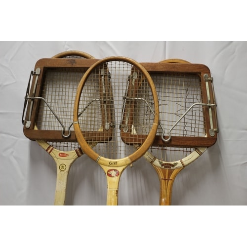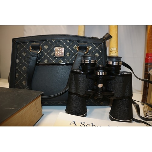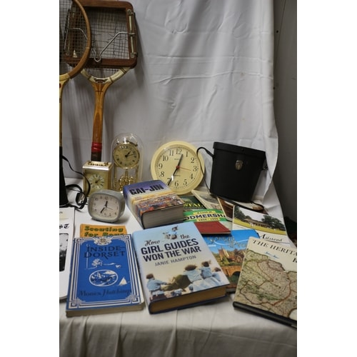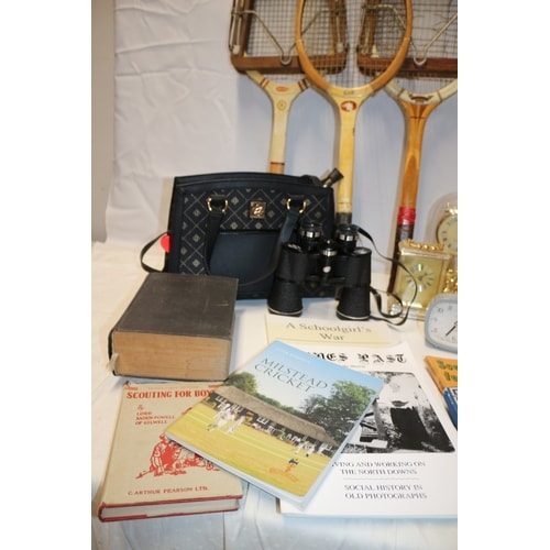 Three vintage wooden tennis rackets (one ‘DUNLOP’, one ‘Girl’), a black patterned handbag with a square metallic emblem, a pair of black binoculars, a collection of four assorted clocks, one black hard case, and a collection of books including ‘SCOUTING FOR BOYS’ and ‘HOW THE GIRL GUIDES WON THE WAR’.
