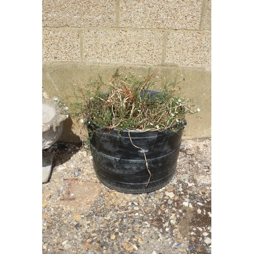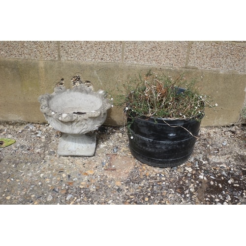 A grey decorative concrete bird bath/planter and a black round plastic planter containing green plants, with no visible labels or markings.
