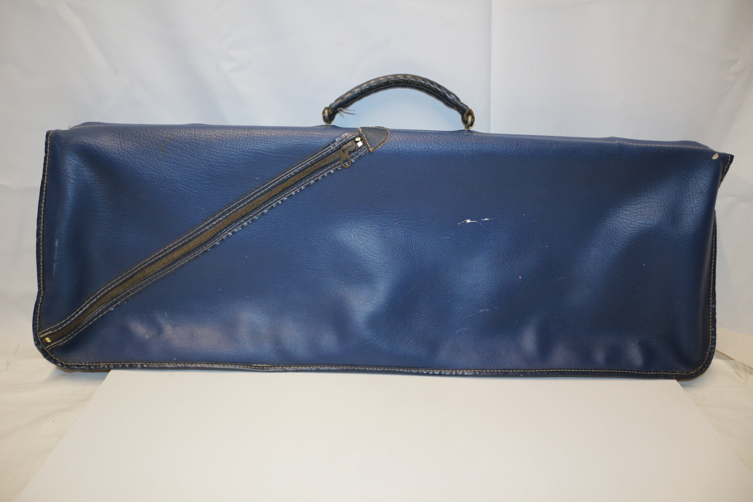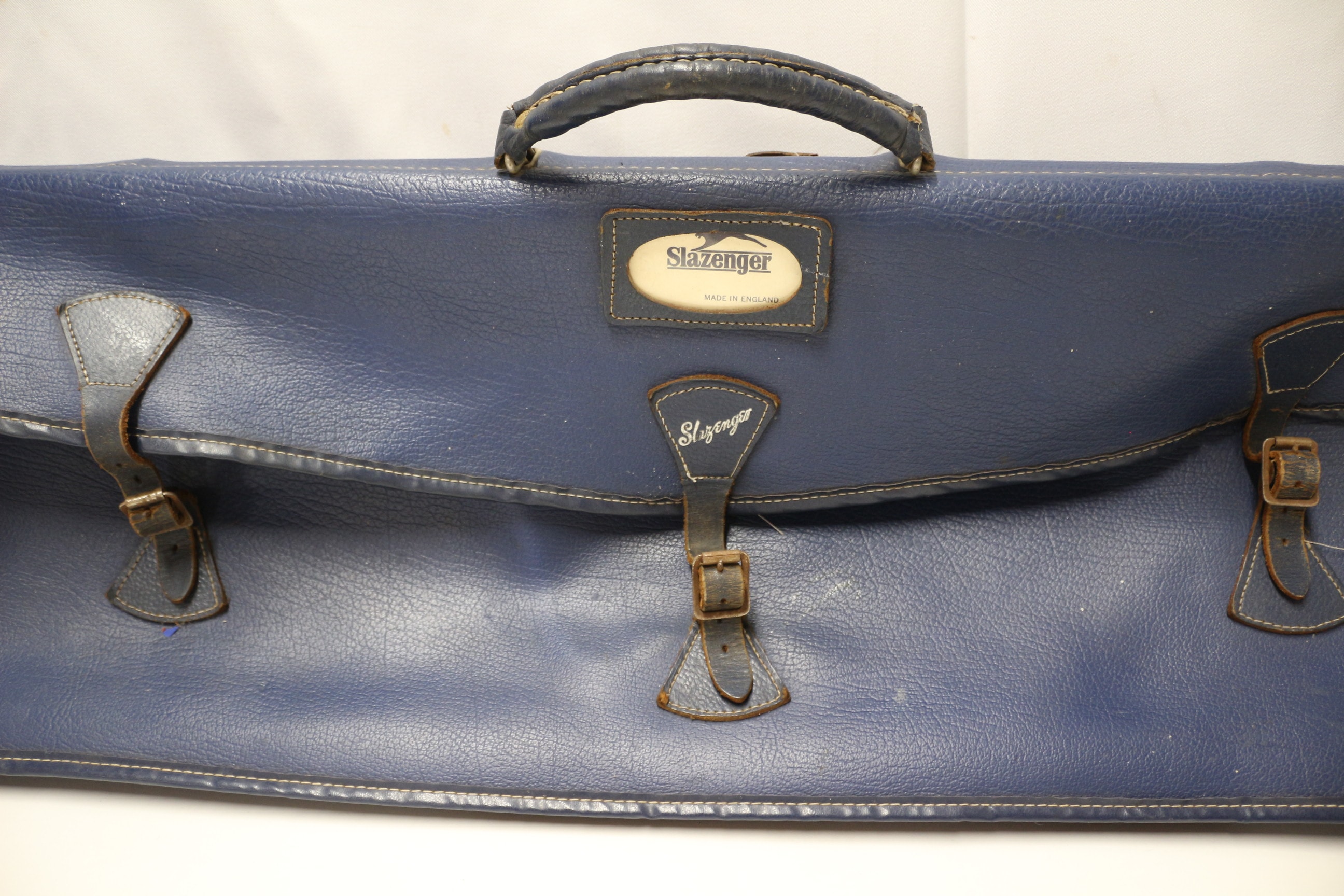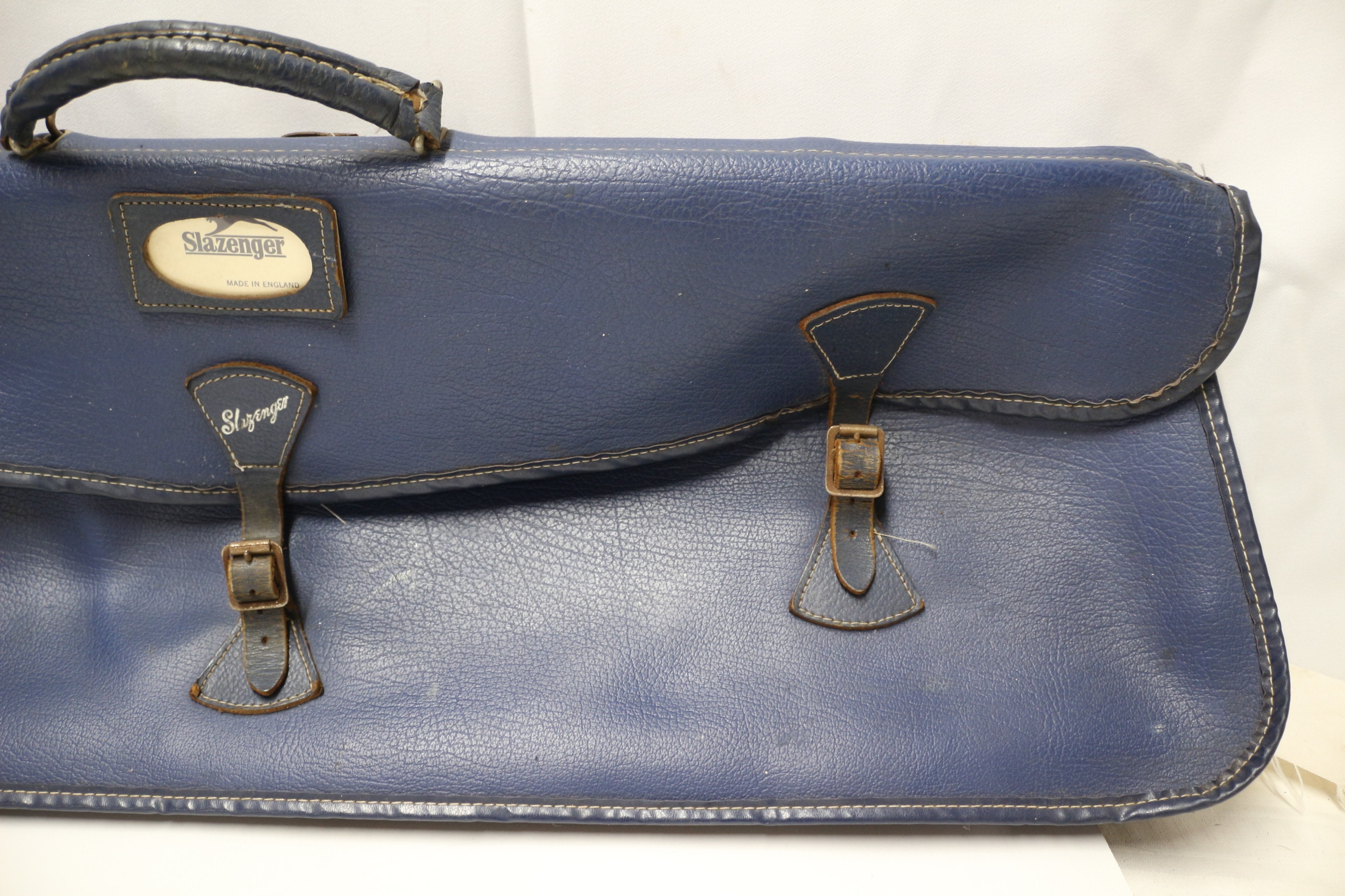 A Vintage blue Slazenger tennis bag with dark brown/black straps and handle, featuring labels that read “Slazenger” and “MADE IN ENGLAND”.