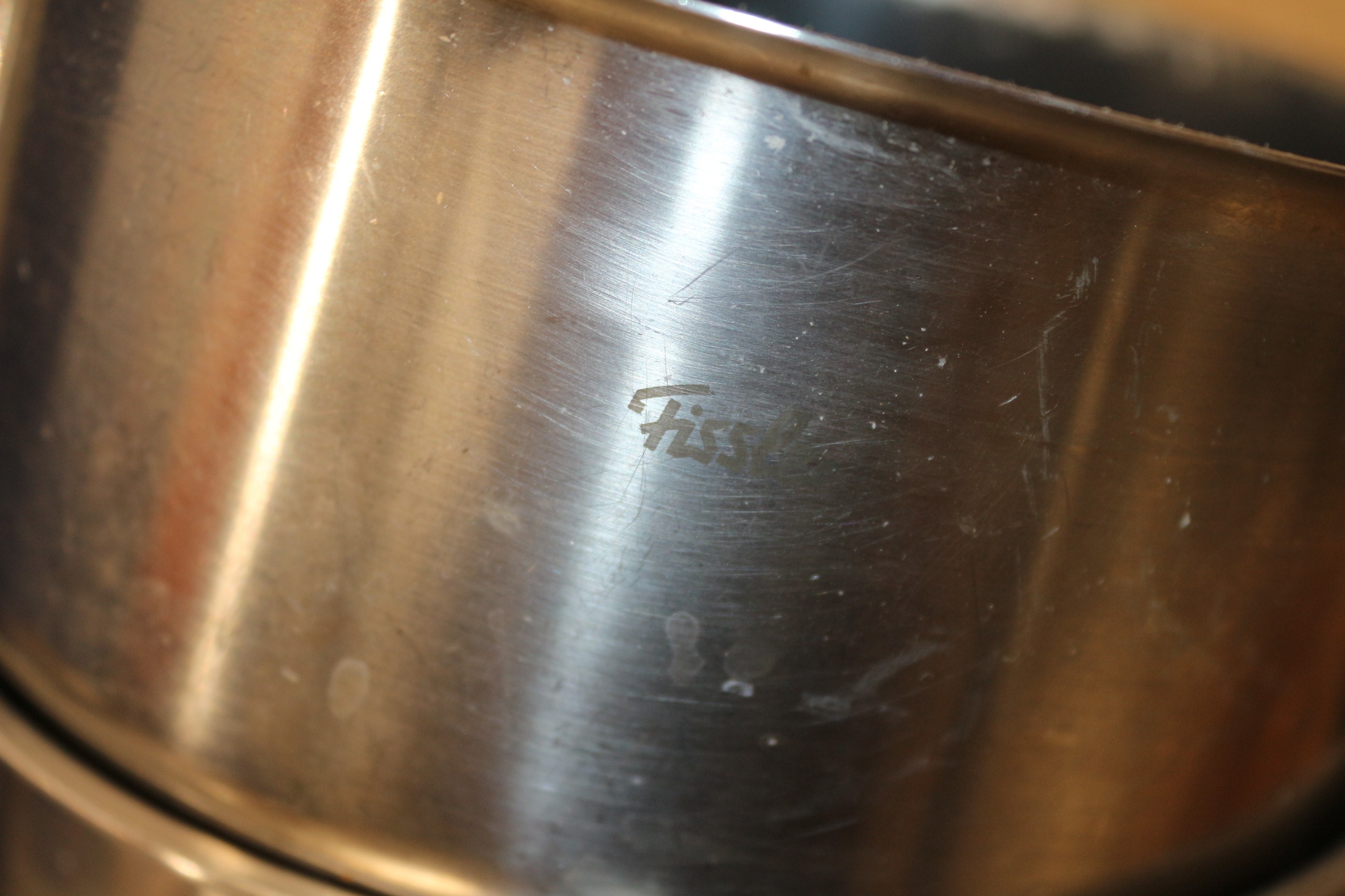 A silver Sharp microwave, a chrome Russell Hobbs toaster, three Fissler stainless steel pots, a light brown woven bowl, a multi-tone wooden segmented bowl on a tray, two dark brown carved wooden goblets with a label stating “From Malawi the Warm heart of africa Made at Bungcraft”, two clear glass bowls, a white ceramic bowl, a small dark wooden bowl, a stack of woven straw mats, a multi-colored decorated wooden trivet, and one white light bulb in a green and white box are included in this lot.