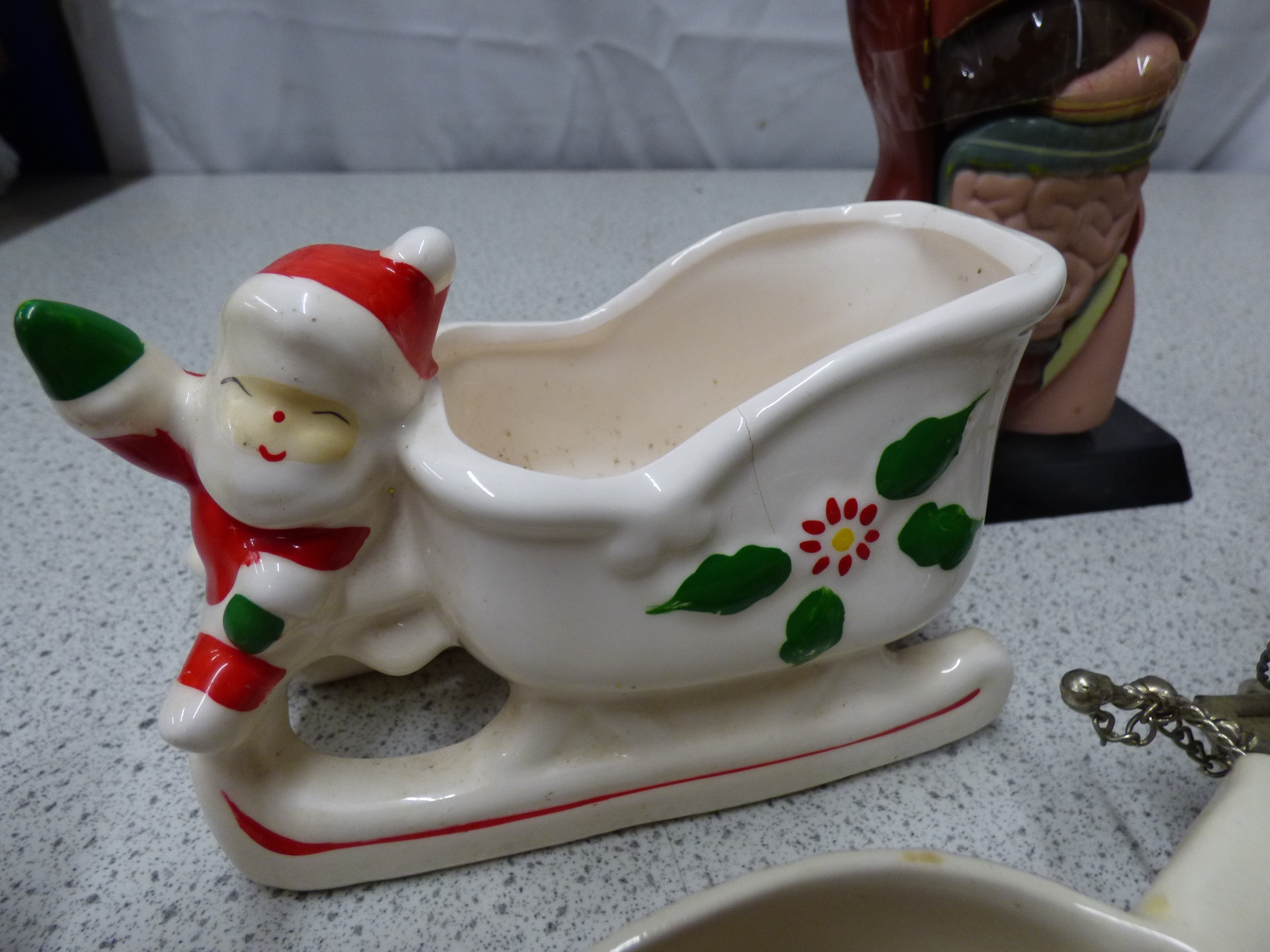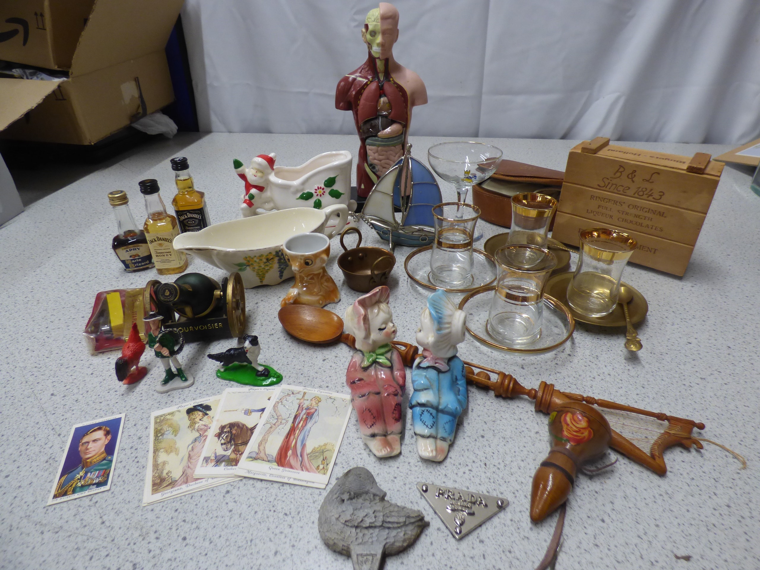 A collection of vintage items including an anatomical model, miniature liquor bottles, ceramic figurines, and more