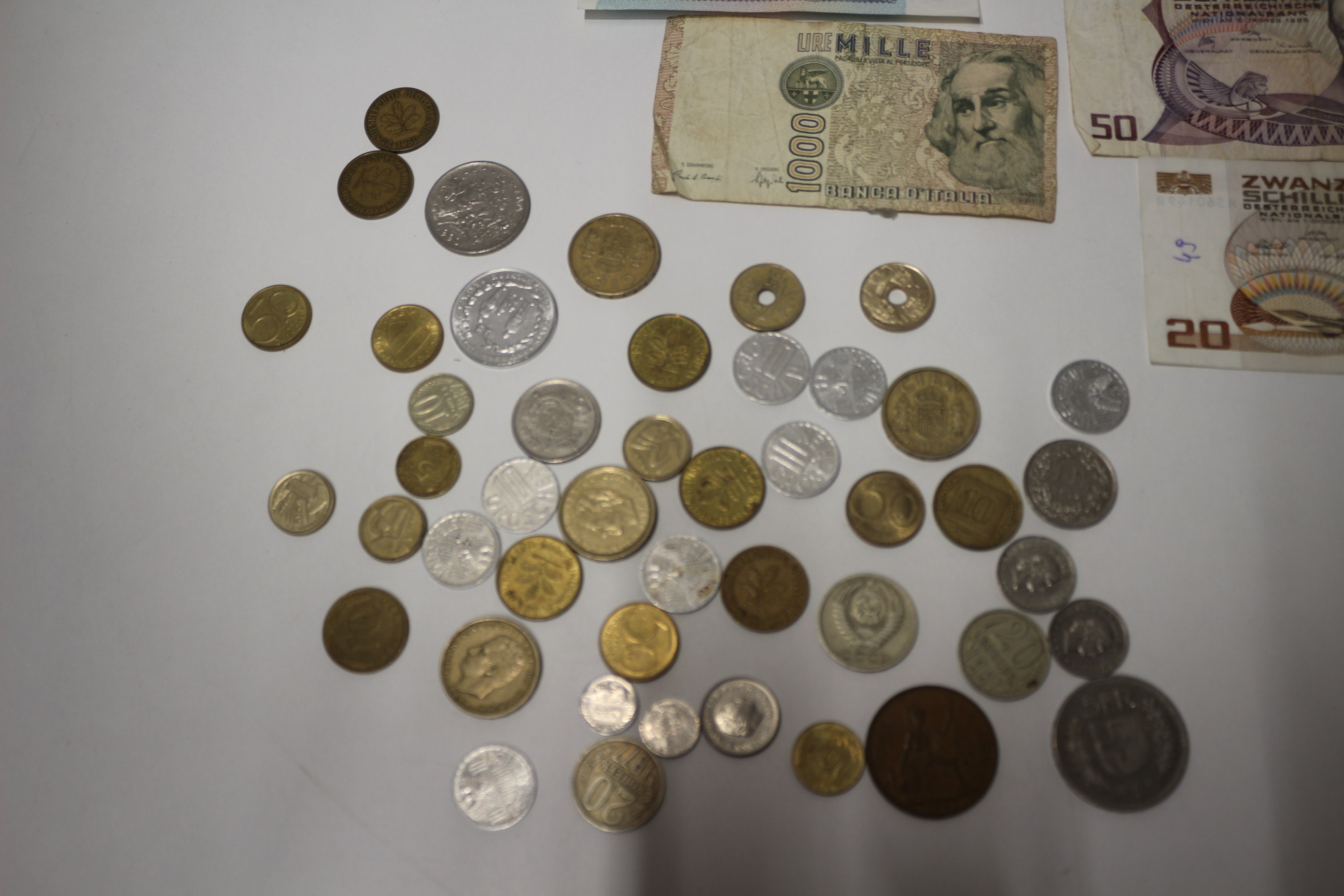 This lot contains three 1961 Soviet Union ruble banknotes: a red/orange 10 Rubles featuring Lenin, a green 3 Rubles featuring a building, and a light blue/purple 5 Rubles featuring the Kremlin, along with four Austrian 100 Schilling banknotes, one Austrian 50 Schilling banknote, one Austrian 20 Schilling banknote, one Italian 1000 Lire Marco Polo banknote, and a group of various world coins.