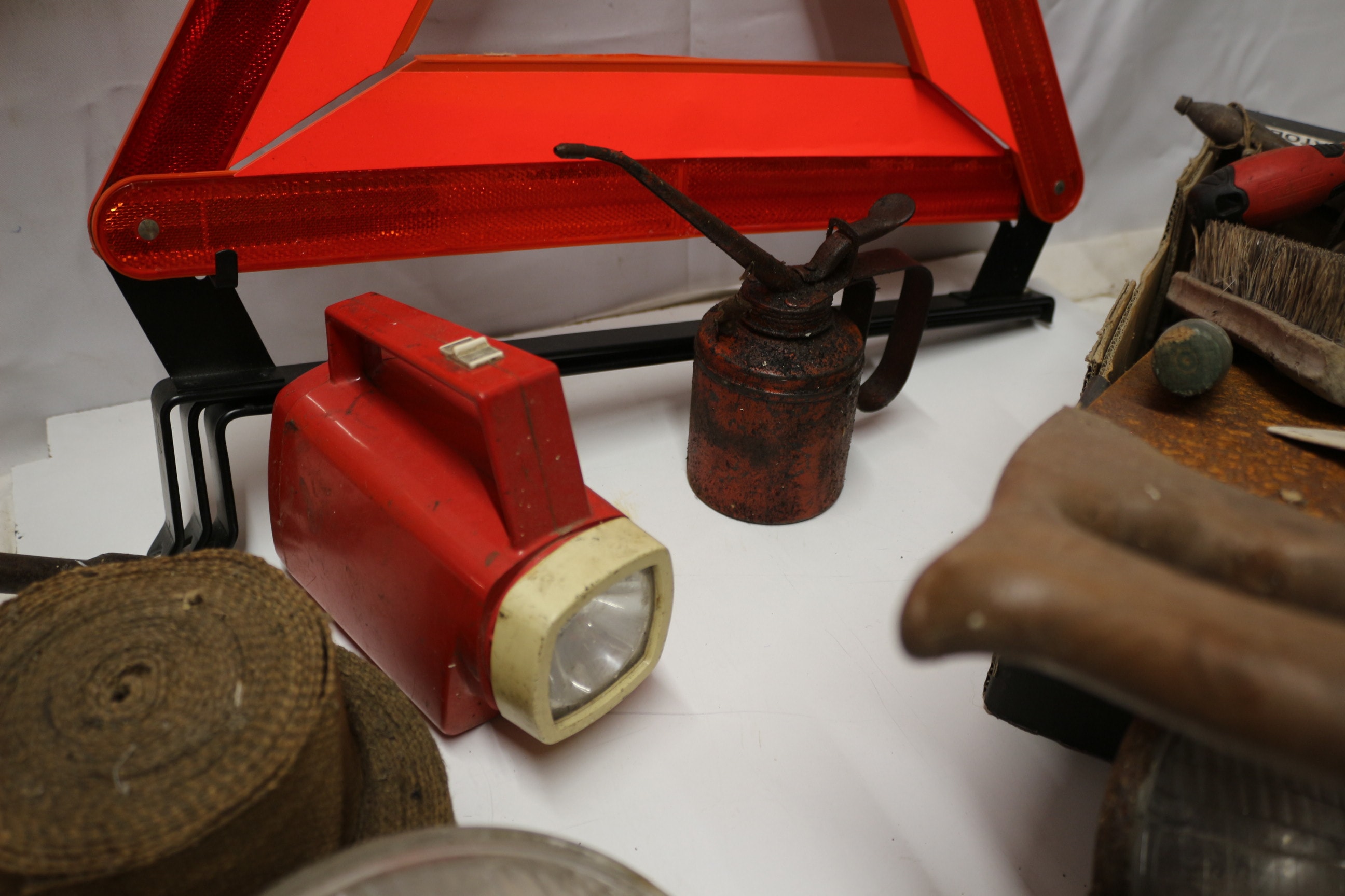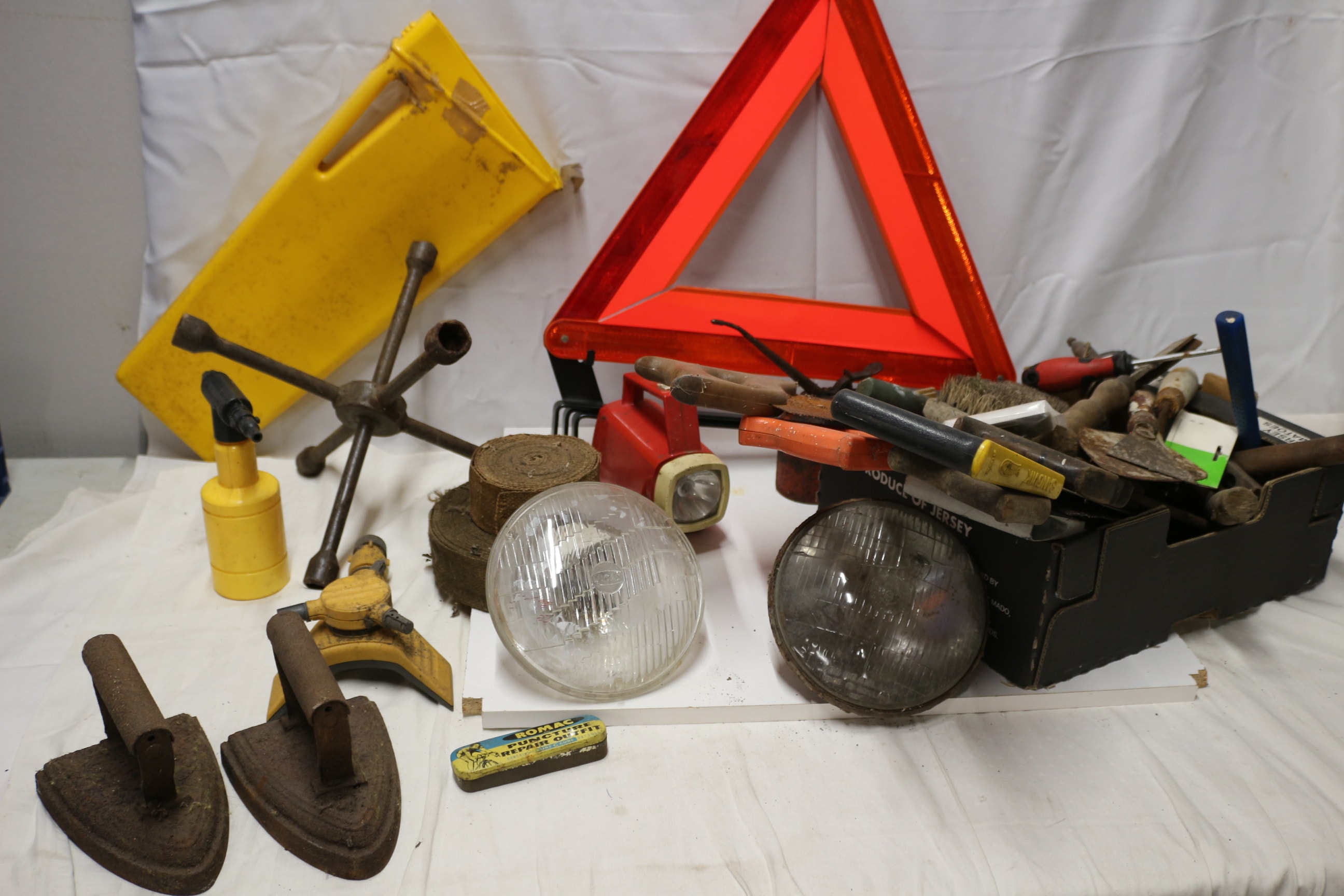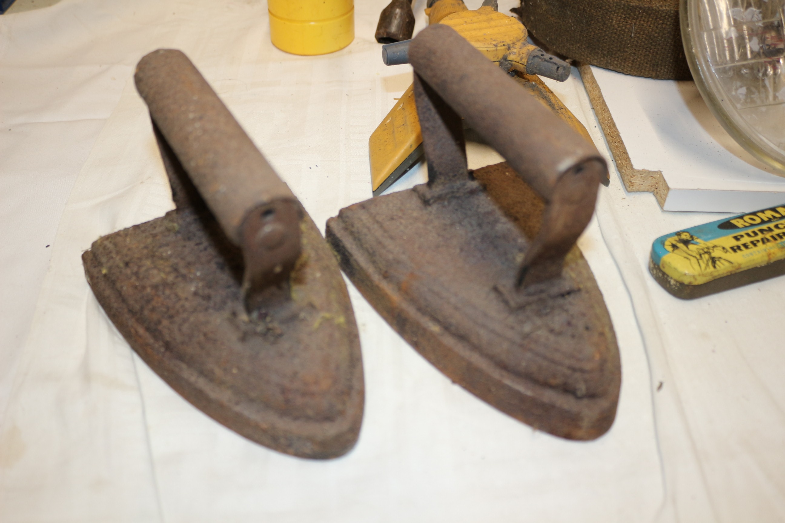 Mixed Lot of rusty, dark brown cast iron flat irons, Tools and Car Parts