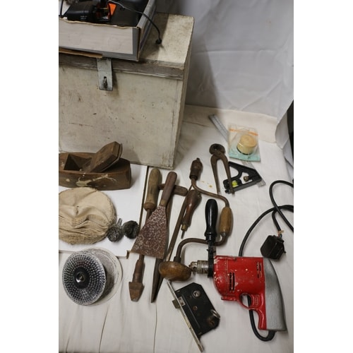 A collection including two dark green camping chairs, an aluminium three-compartment cooking pot, a tan digging tool, a D-Cut measuring tool, a white wooden chest, a BLACK+DECKER 9043 9.6V 8mm black and orange cordless drill with charger, a red corded drill, a wooden hand plane, several cream polishing pads, a silver grinding disc, various metal and wood-handled hand tools, a black carry bag, and two yellow/black flat objects.