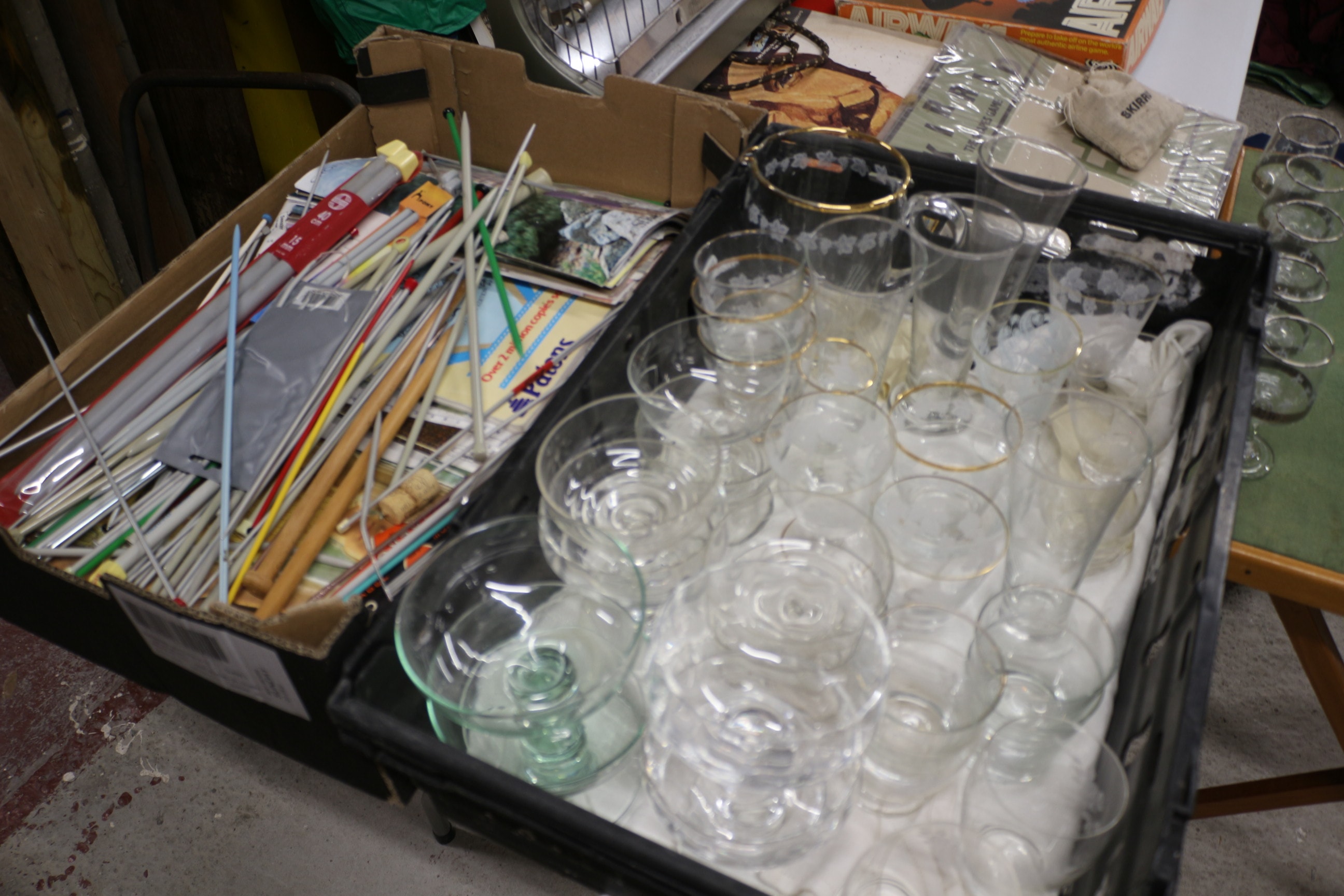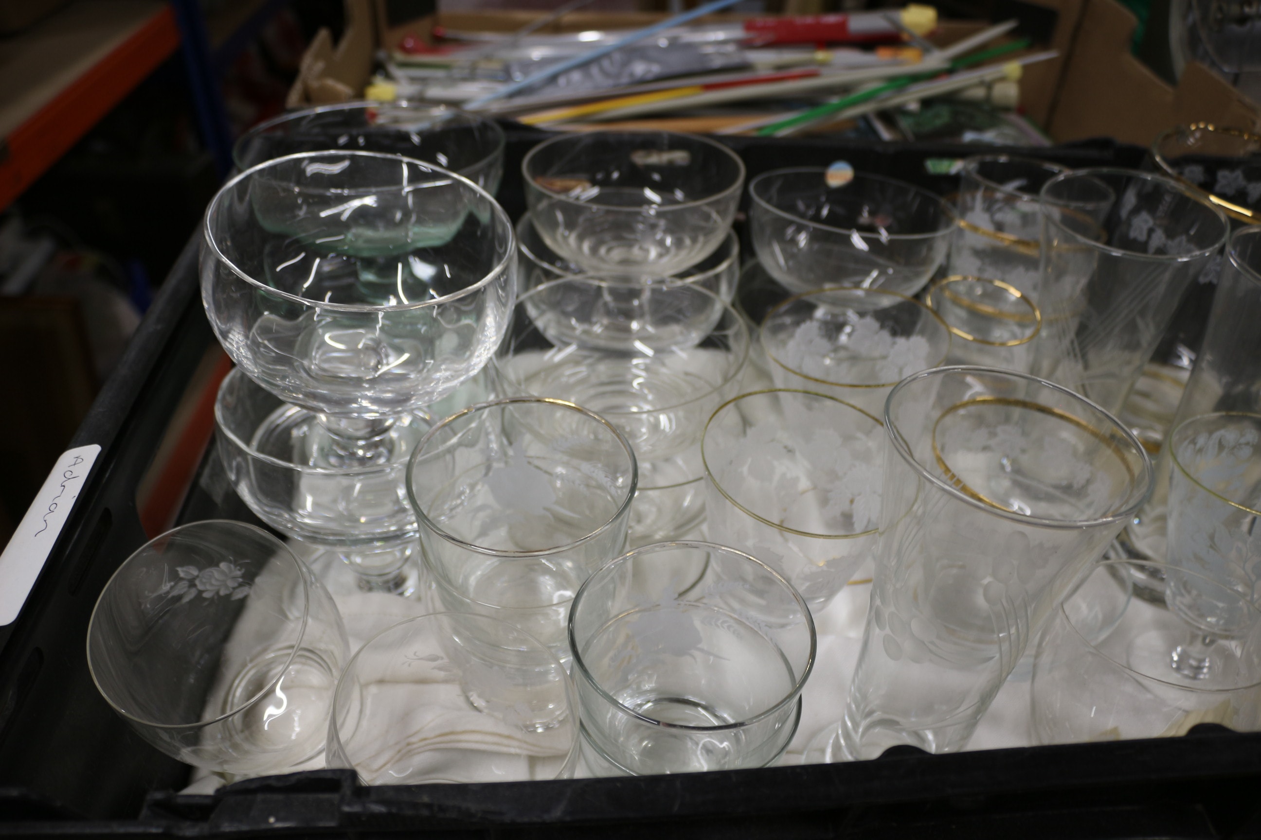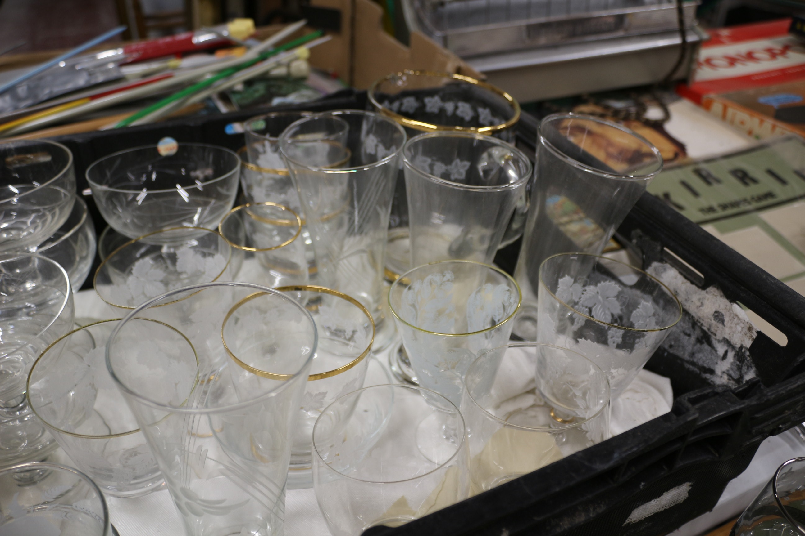 A large collection of approximately 30-40+ clear glass drinking glasses and bowls, with some featuring gold-coloured rims and others showcasing frosted floral or leaf patterns.