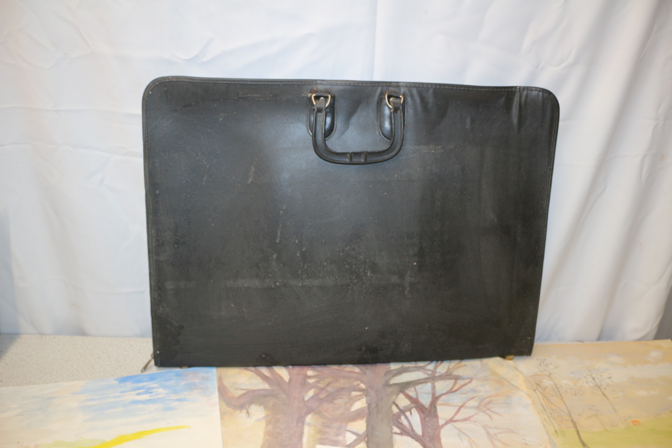 A black portfolio case containing numerous multi-colored artworks, some featuring text including ‘ASTER HAPPINESS’, ‘200 mg/ML’, and an ‘AG’ initial.
