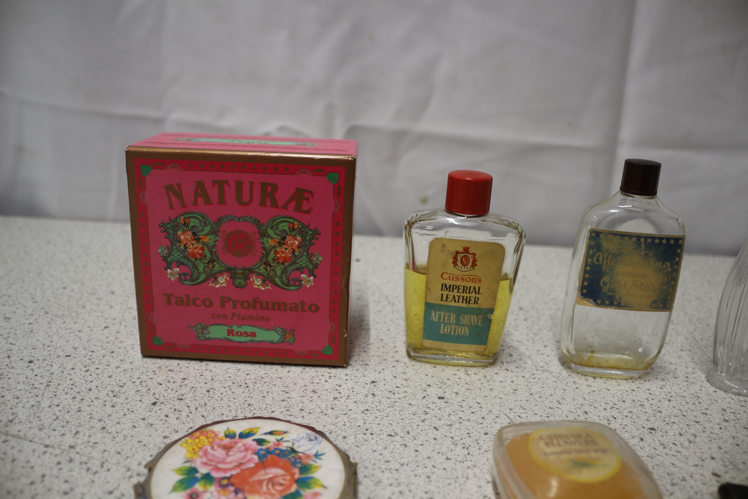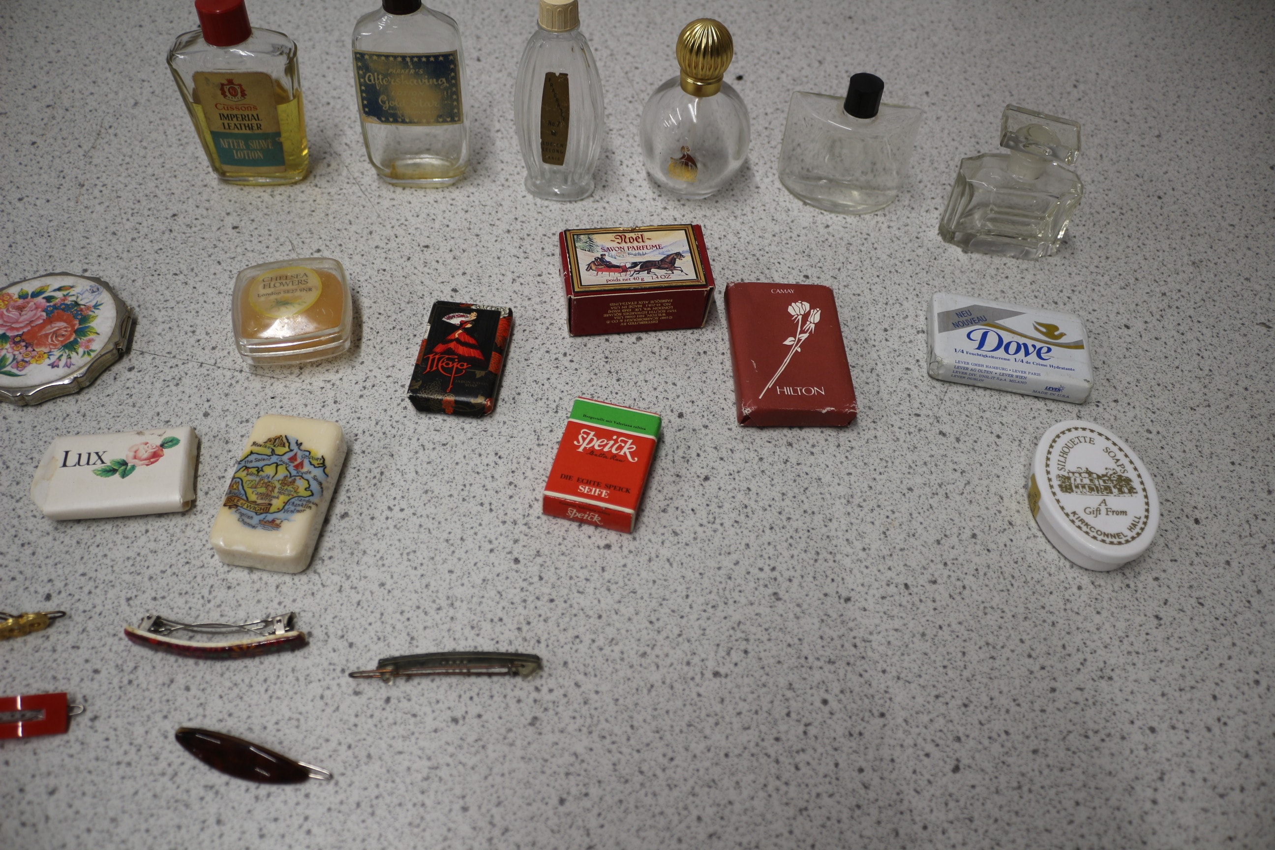 This lot includes small personal care items and accessories comprising one pink ‘NATURAE Talco Profumato Rosa’ talcum powder box, seven clear glass perfume/aftershave bottles (two with liquid including ‘Cussons Imperial Leather’ and one empty ‘Noel’), eight small soap bars or boxes (brands include ‘Lux’, ‘Dove’, ‘Camay’, ‘Noel Savon Parfumé’, ‘Tief’, and ‘Speick Seife’), a silver-toned floral compact, a white ‘SCRUBB’S AMMONIA’ container, and nine assorted hair clips/barrettes in various colours and designs.