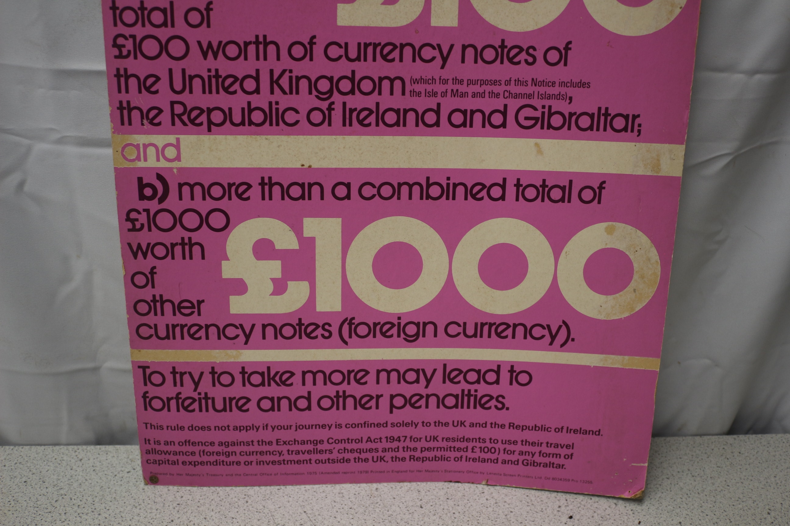 A pink and cream cardboard poster with magenta text, displaying a “Warning to all travellers” about currency restrictions, prepared by Her Majesty’s Treasury and the Central Office of Information 1975 (Amended reprint 1978). 51.5x76cm