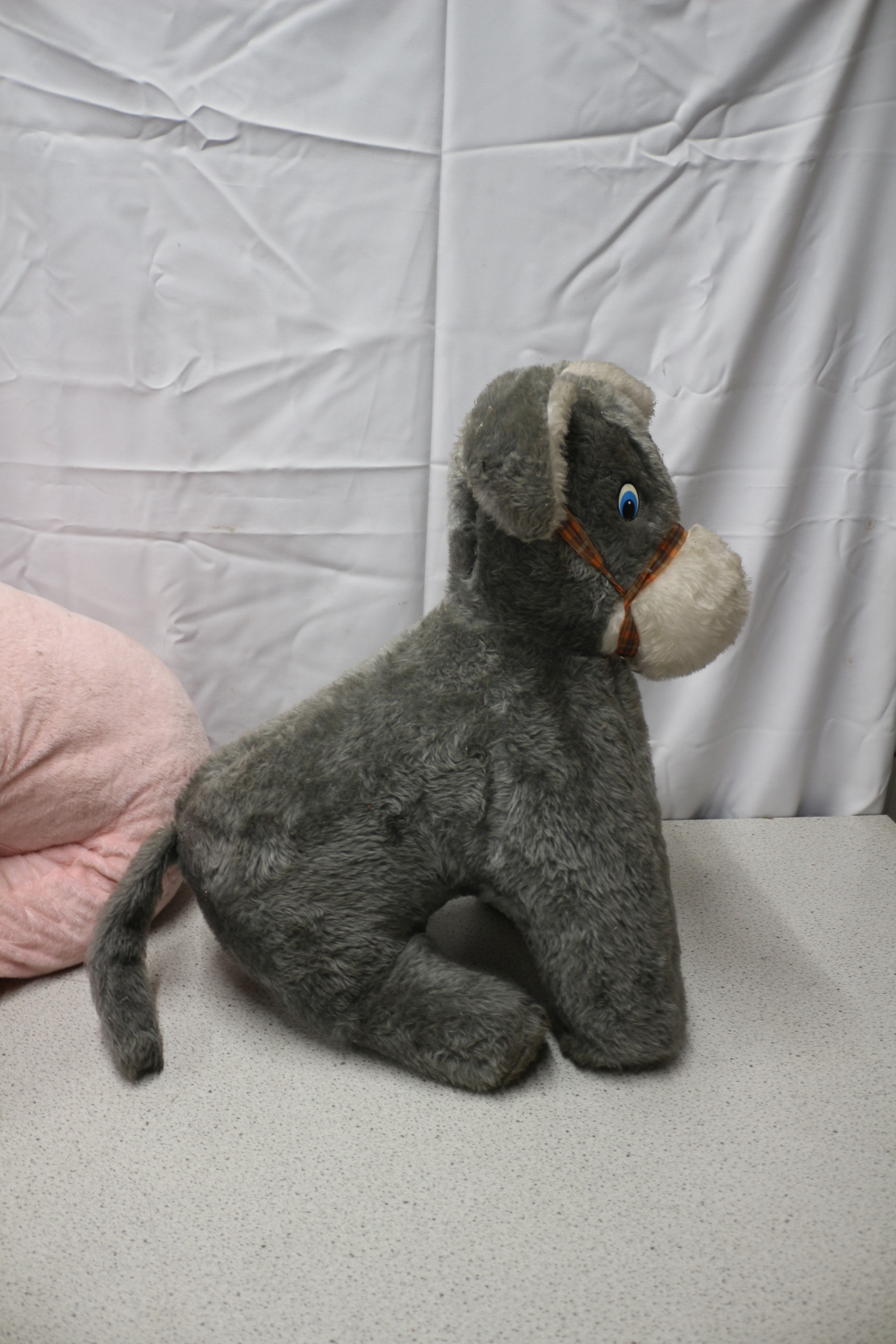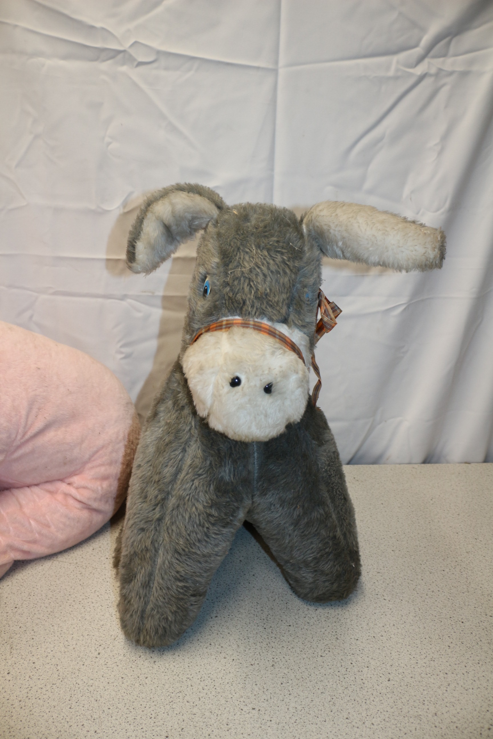 A pink elephant plush toy and a grey donkey plush toy with an orange and white plaid harness detail.