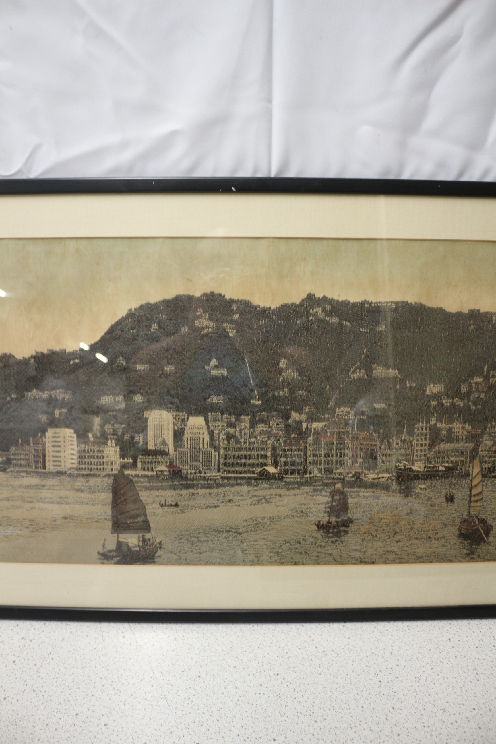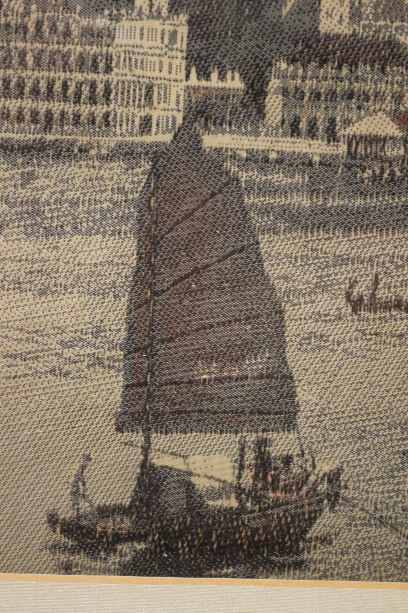A 20th Century framed panoramic tapestry panel depicting a harbour scene with a city skyline and boats, primarily in muted tones of green, blue, brown, and beige, with a black frame and off-white matting. 77.5x50cm