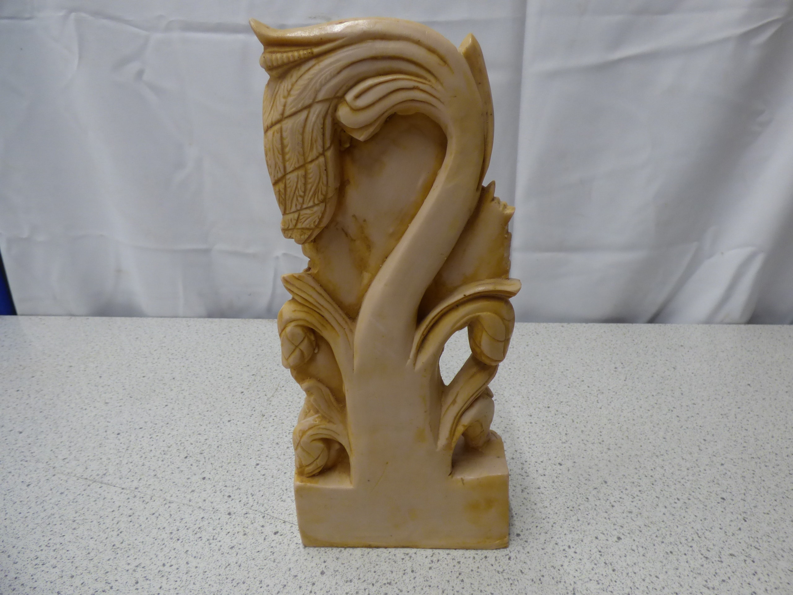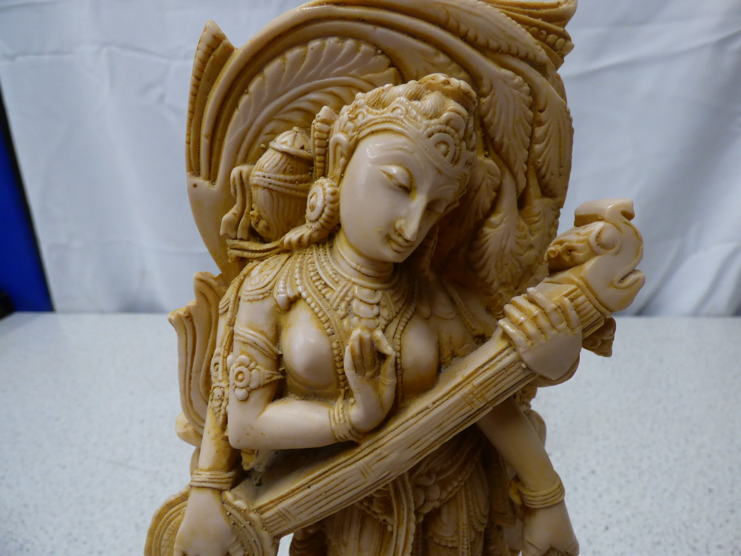 A creamy beige or ivory-coloured statue depicting the Hindu goddess Saraswati, goddess of knowledge, music, art and wisdom, playing a veena, with no visible labels or inscriptions. 29cm tall