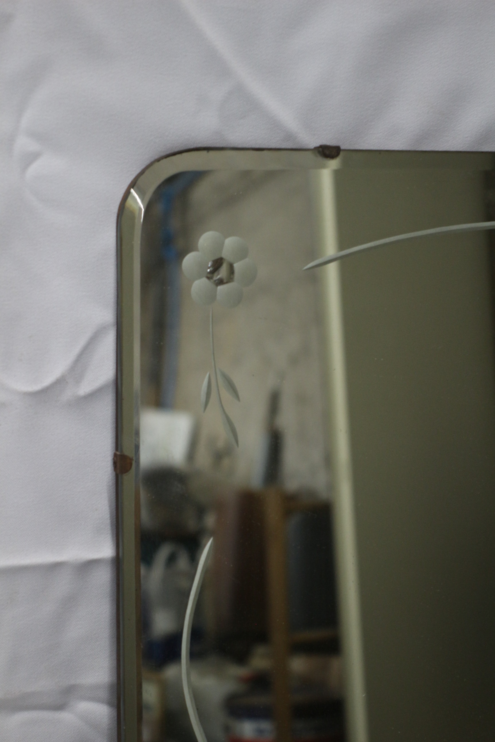 Two rectangular silver/clear mirrors, one etched with white floral and scroll designs, the other plain. Largest 61x41cm