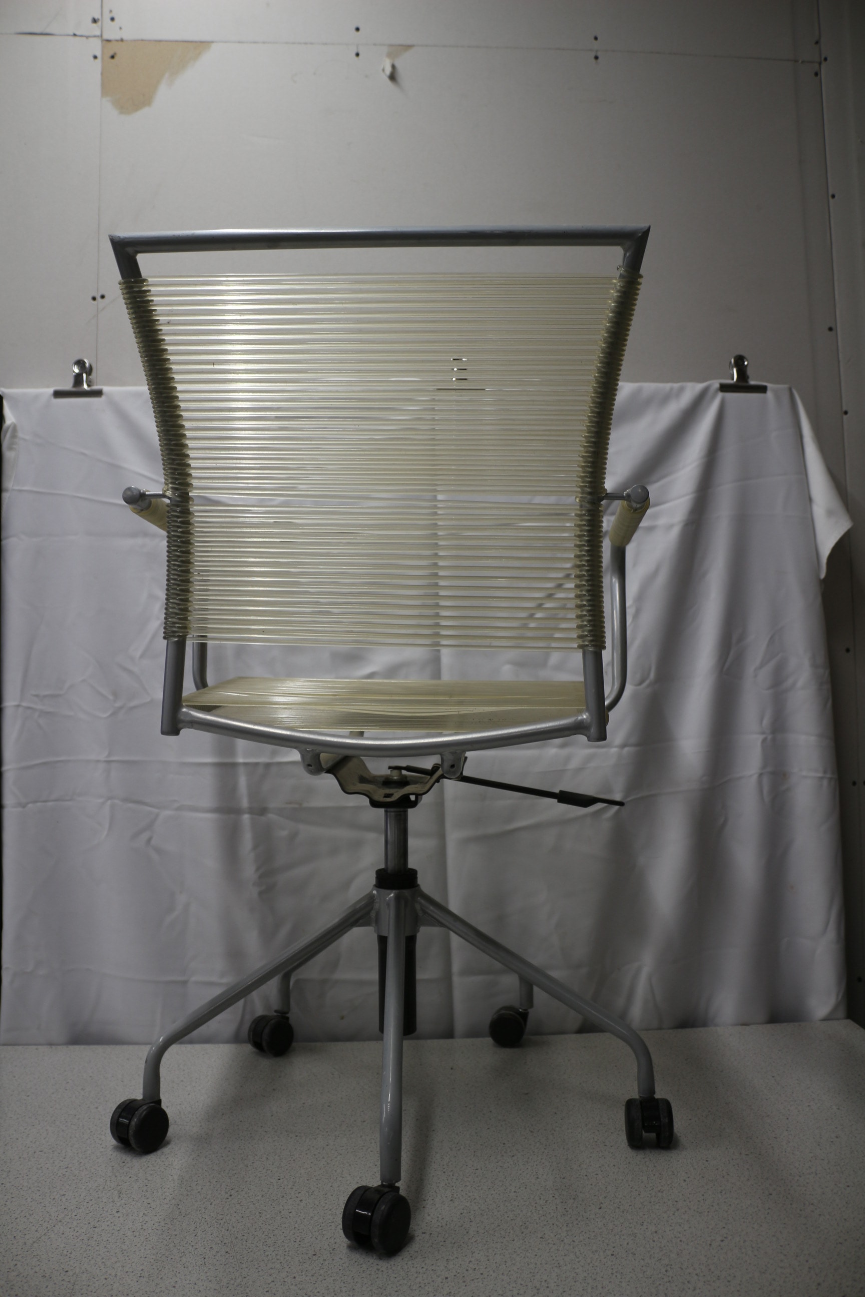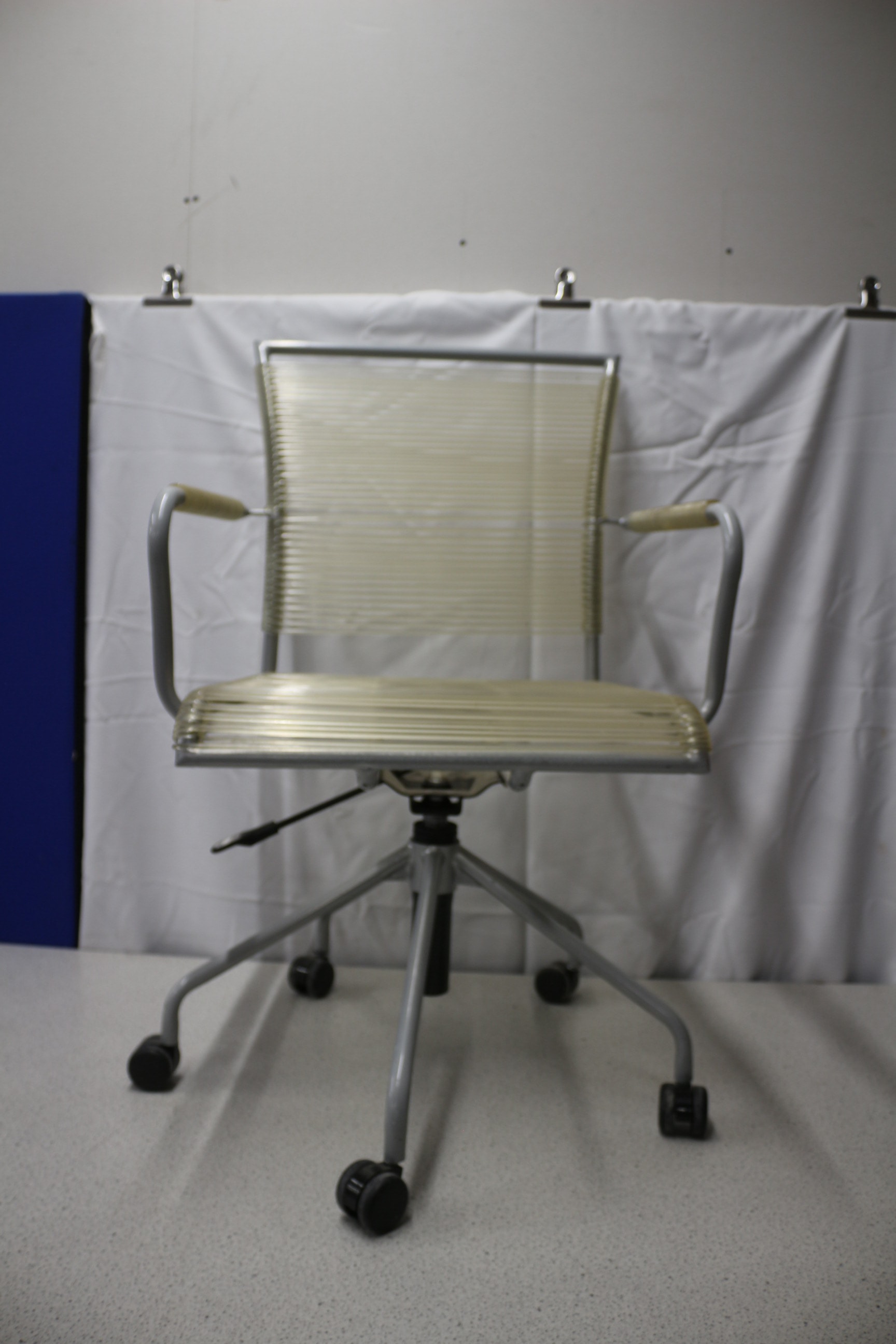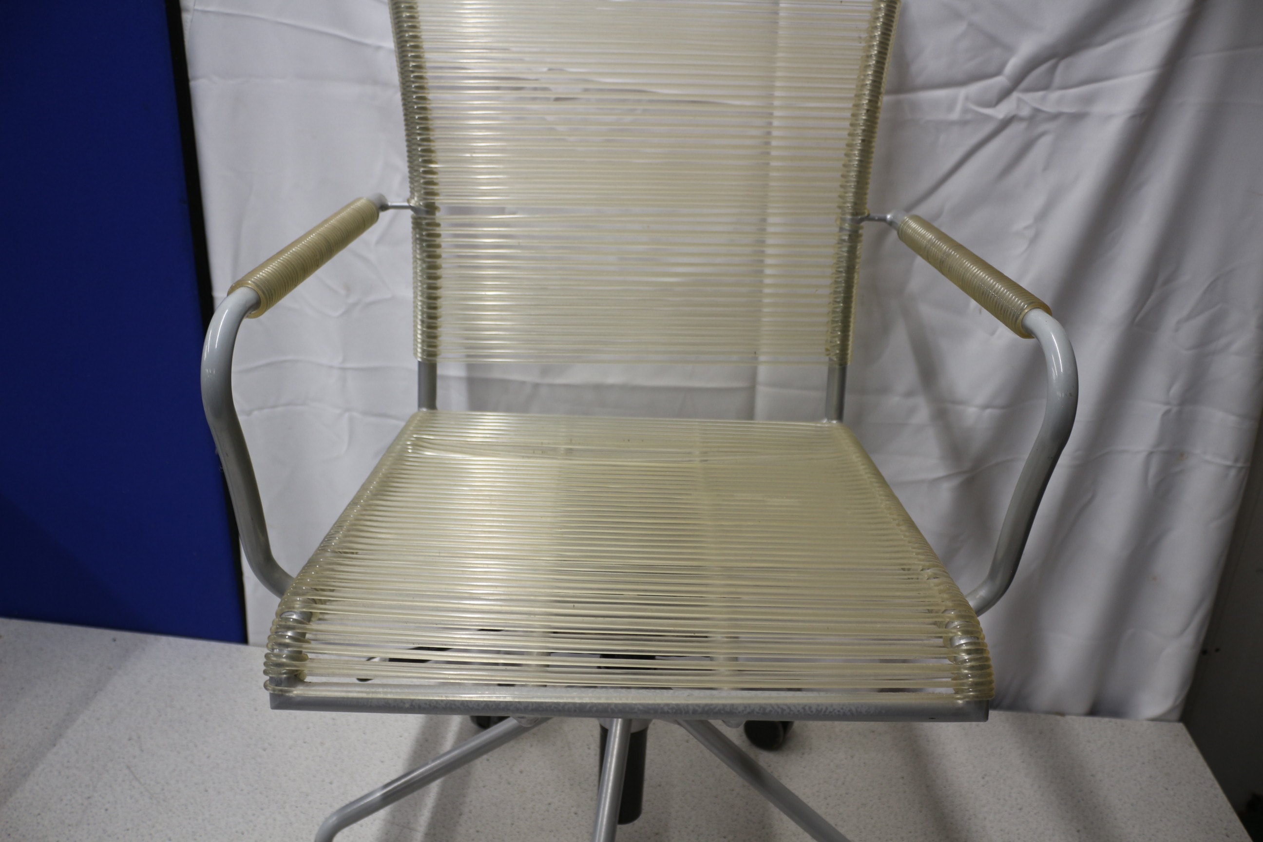 An office chair with a grey metal frame and translucent light yellow/cream corded seat, backrest, and armrests. 1 wheel AF