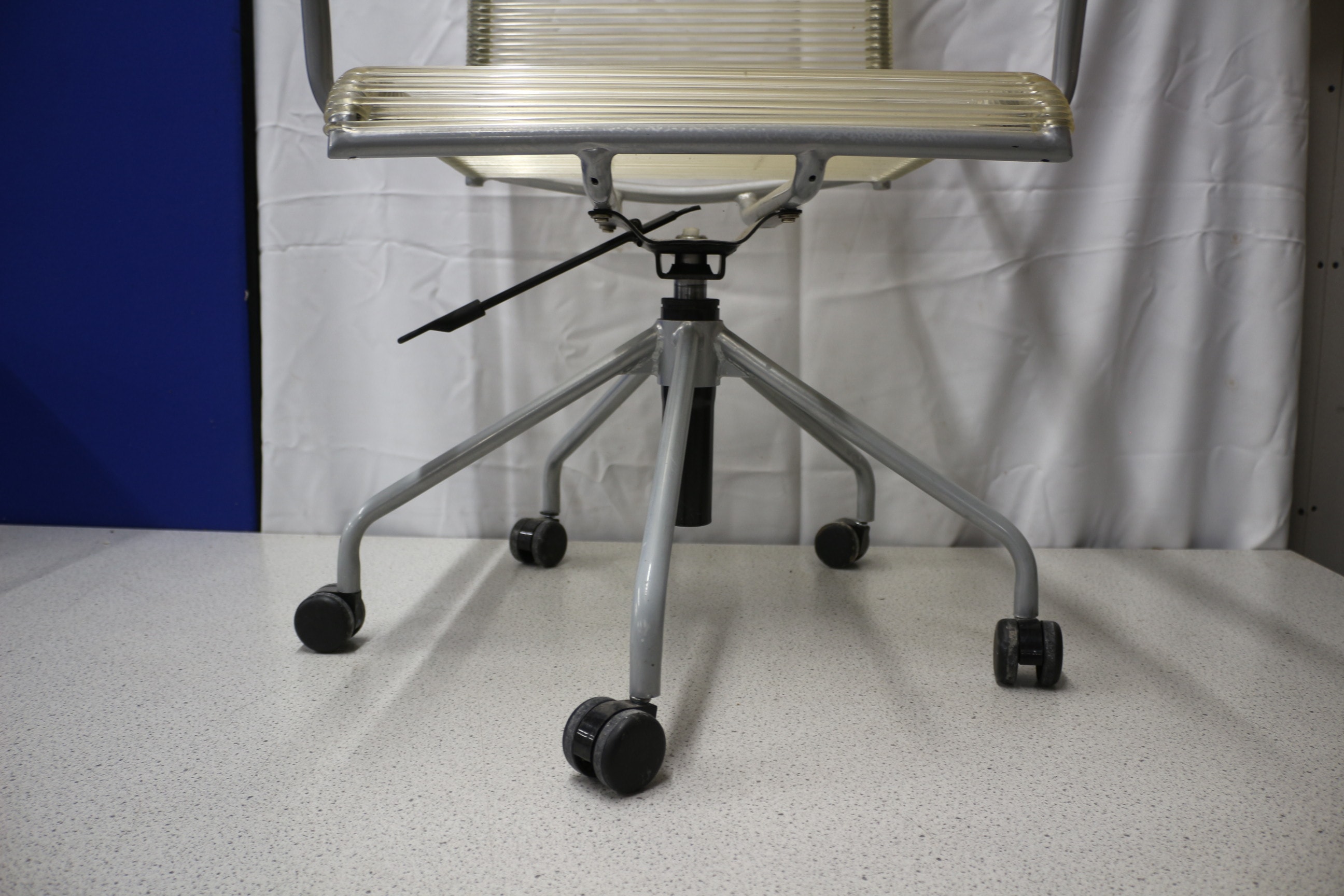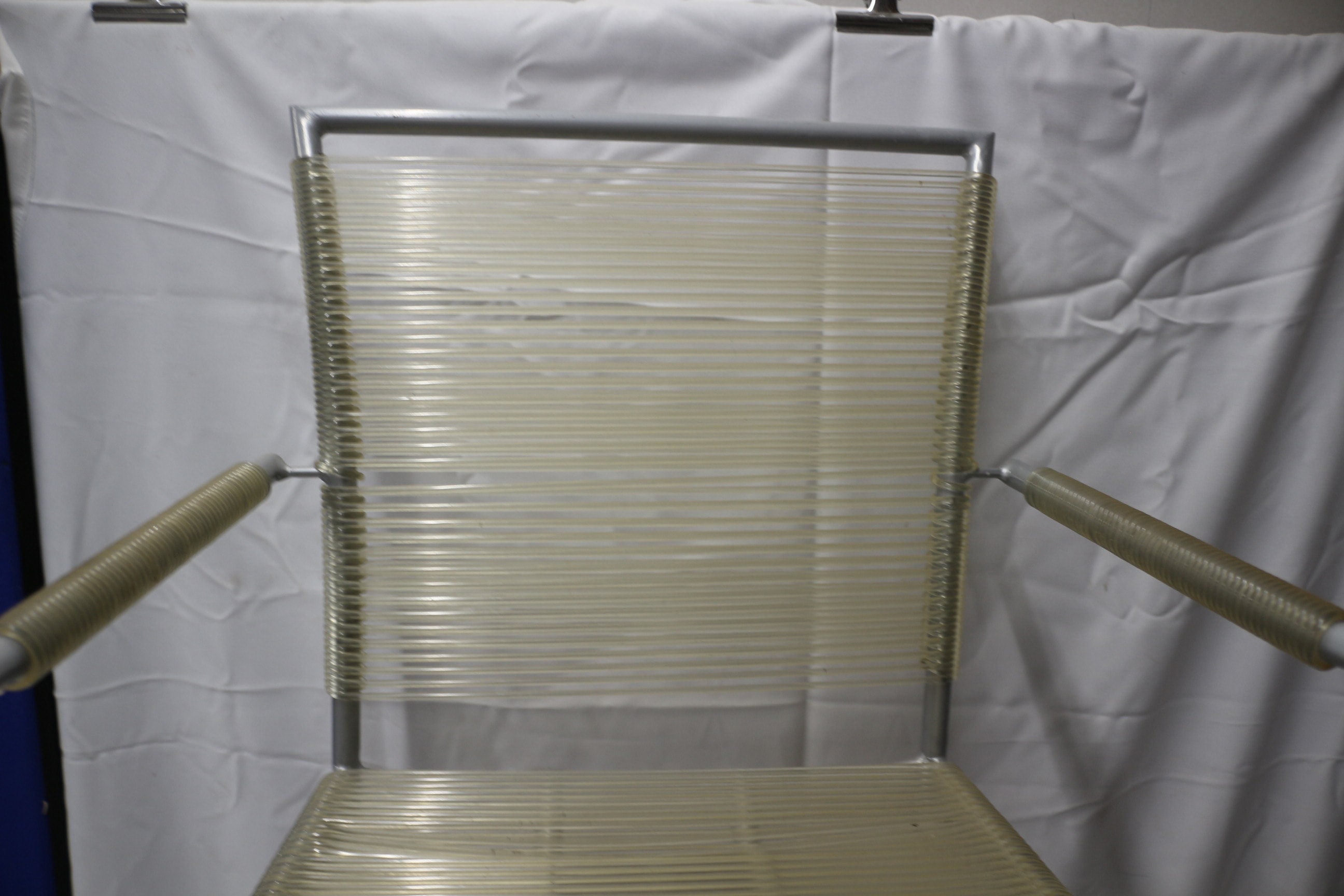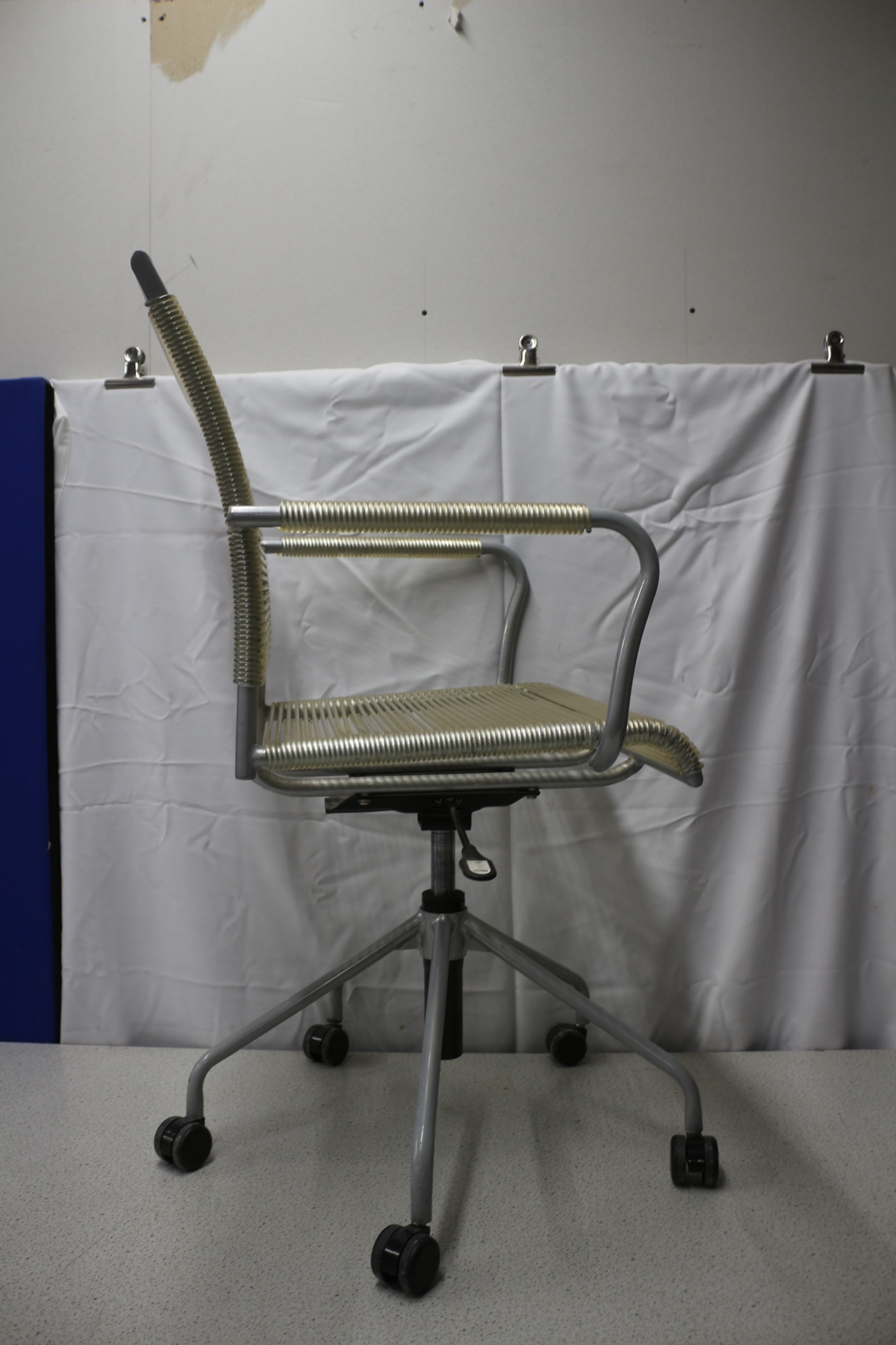 An office chair with a grey metal frame and translucent light yellow/cream corded seat, backrest, and armrests. 1 wheel AF