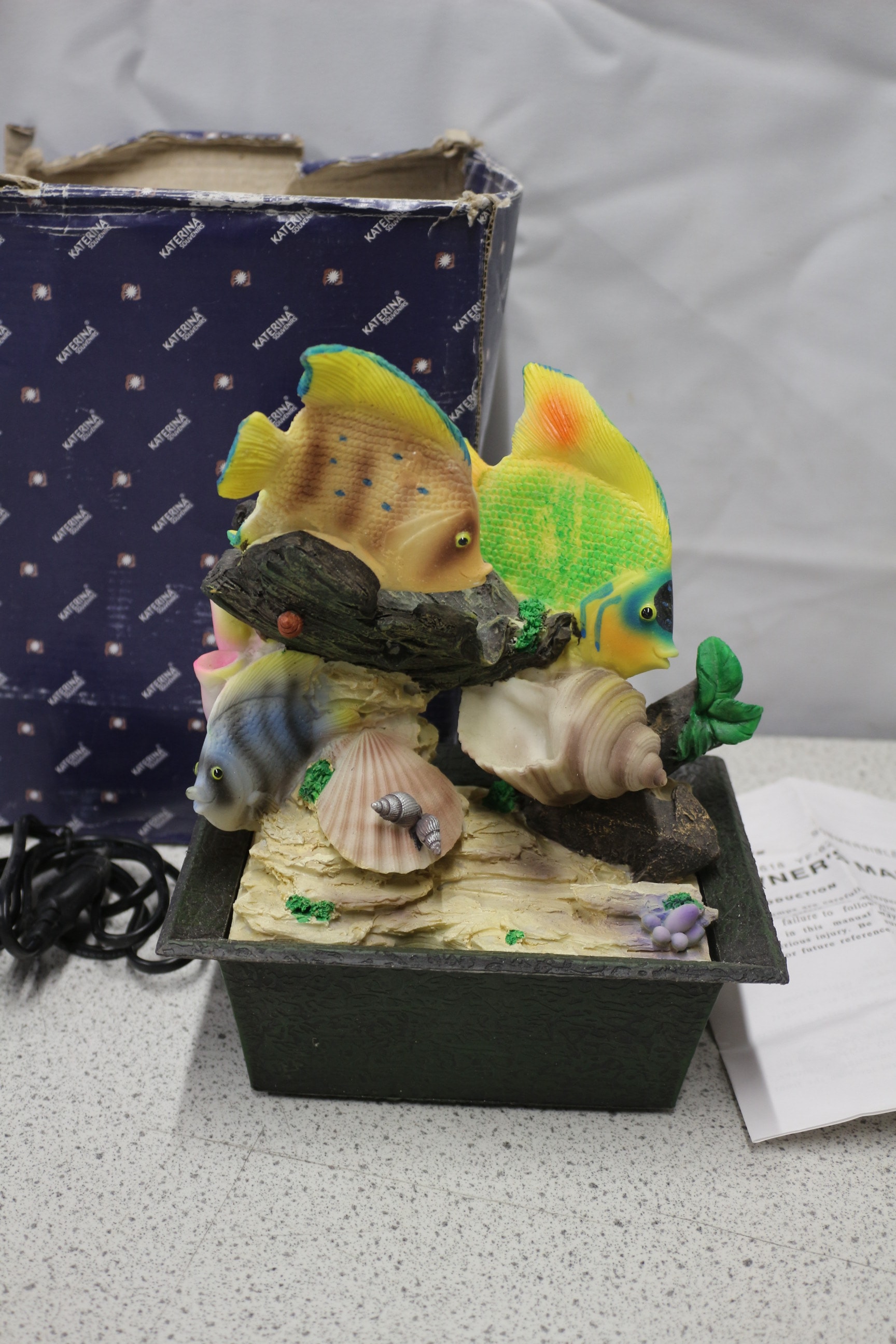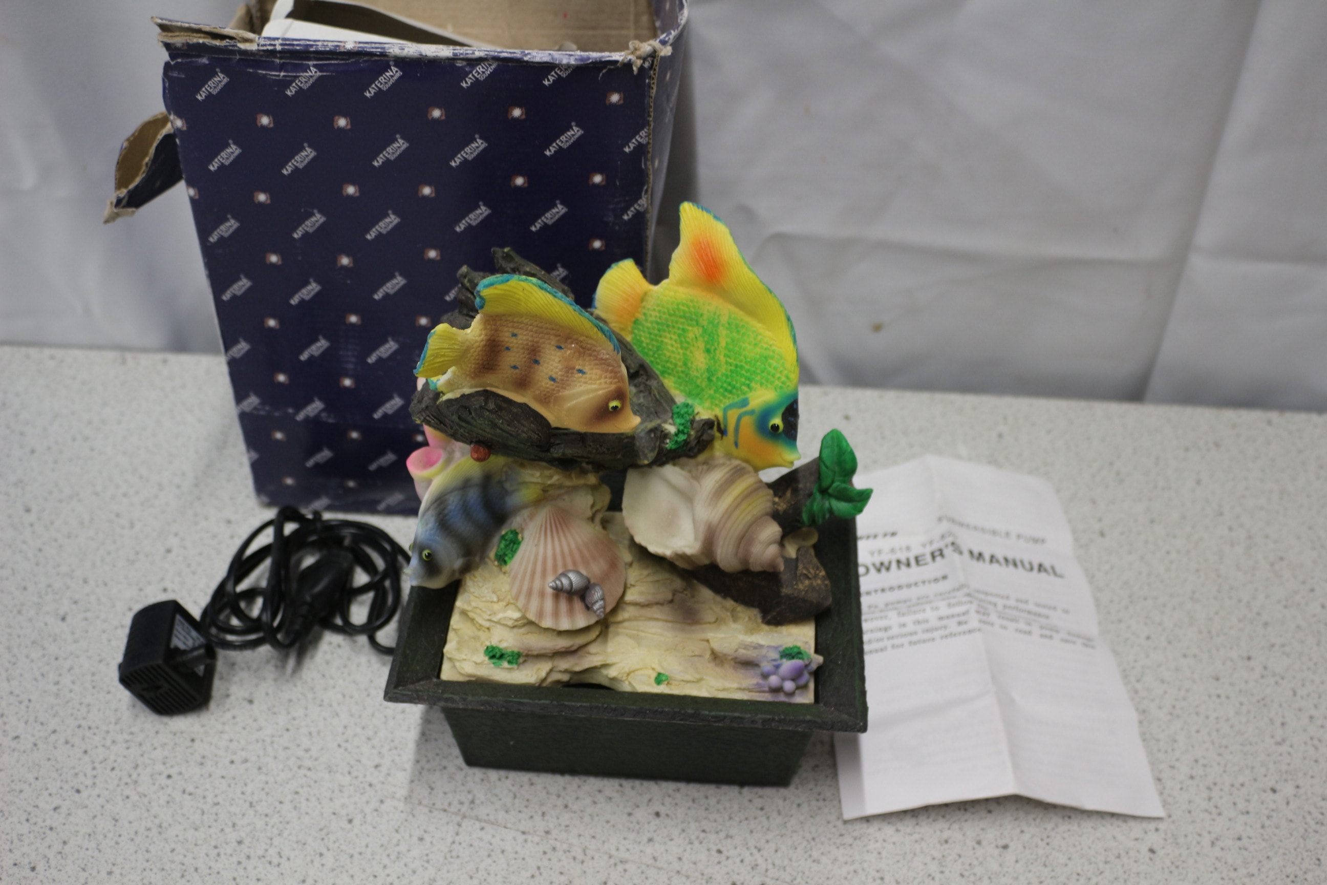 A decorative fish tank fountain with three multi-coloured fish (yellow, green, blue) and natural-coloured seashells on a sand-coloured base, accompanied by a black power adapter, a KATERNA branded box, and an owner’s manual for a pump. Untested