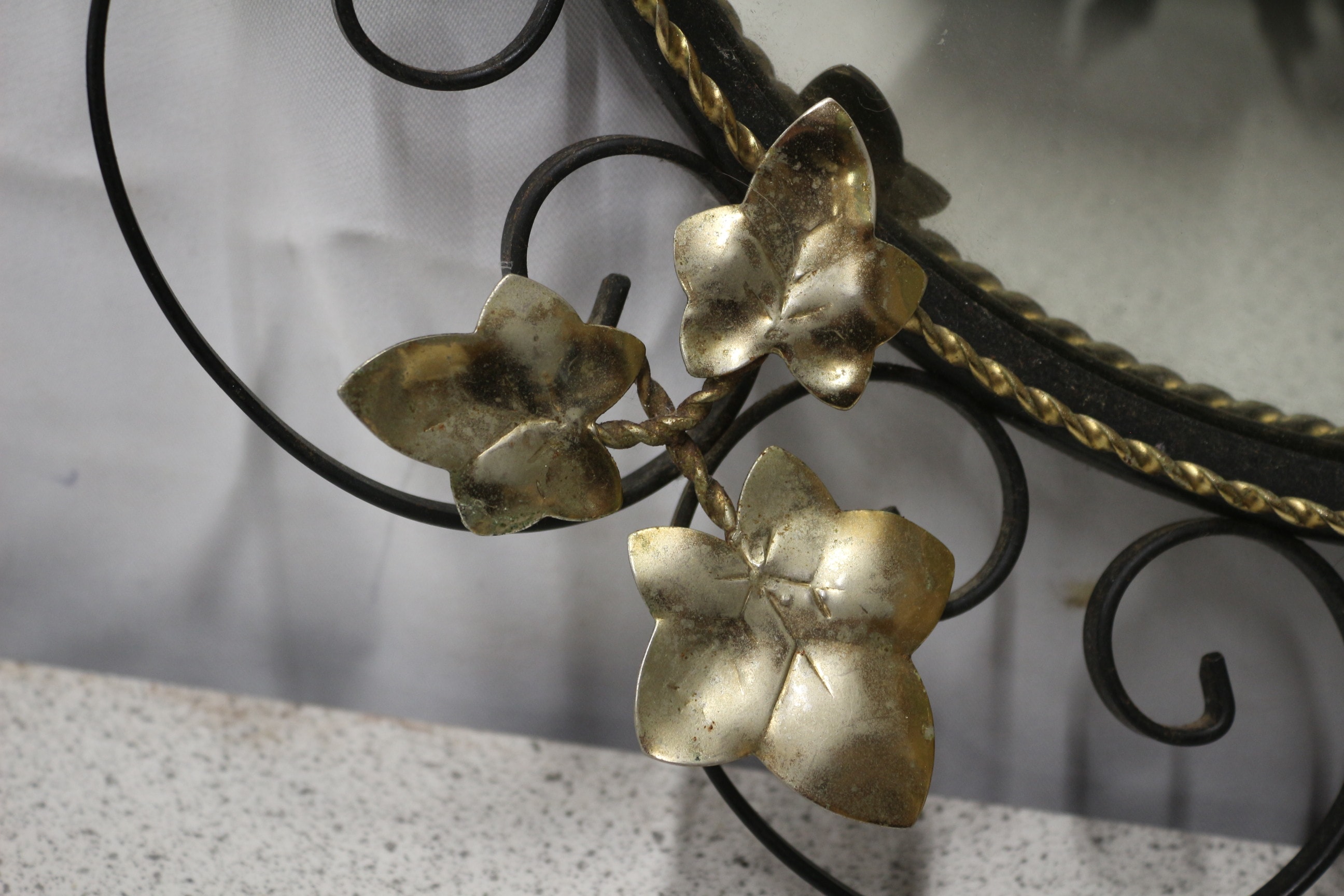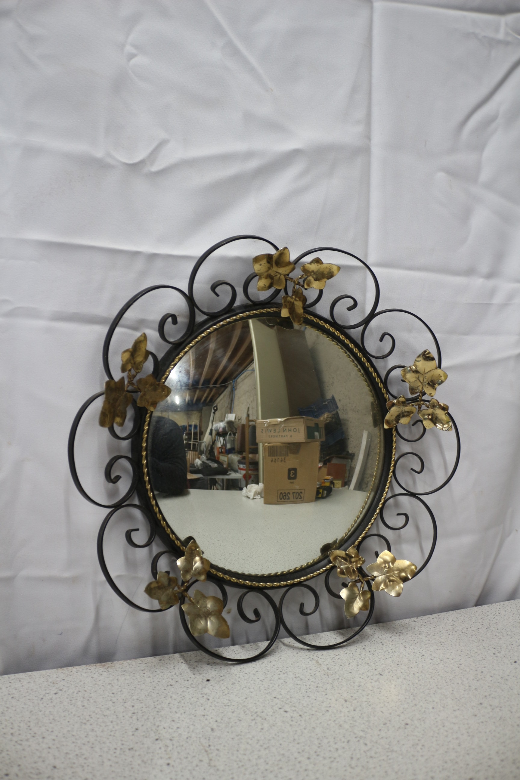 A black wrought iron scrollwork convex wall mirror with gold leaf accents, featuring a round convex central mirror. 44cm wide