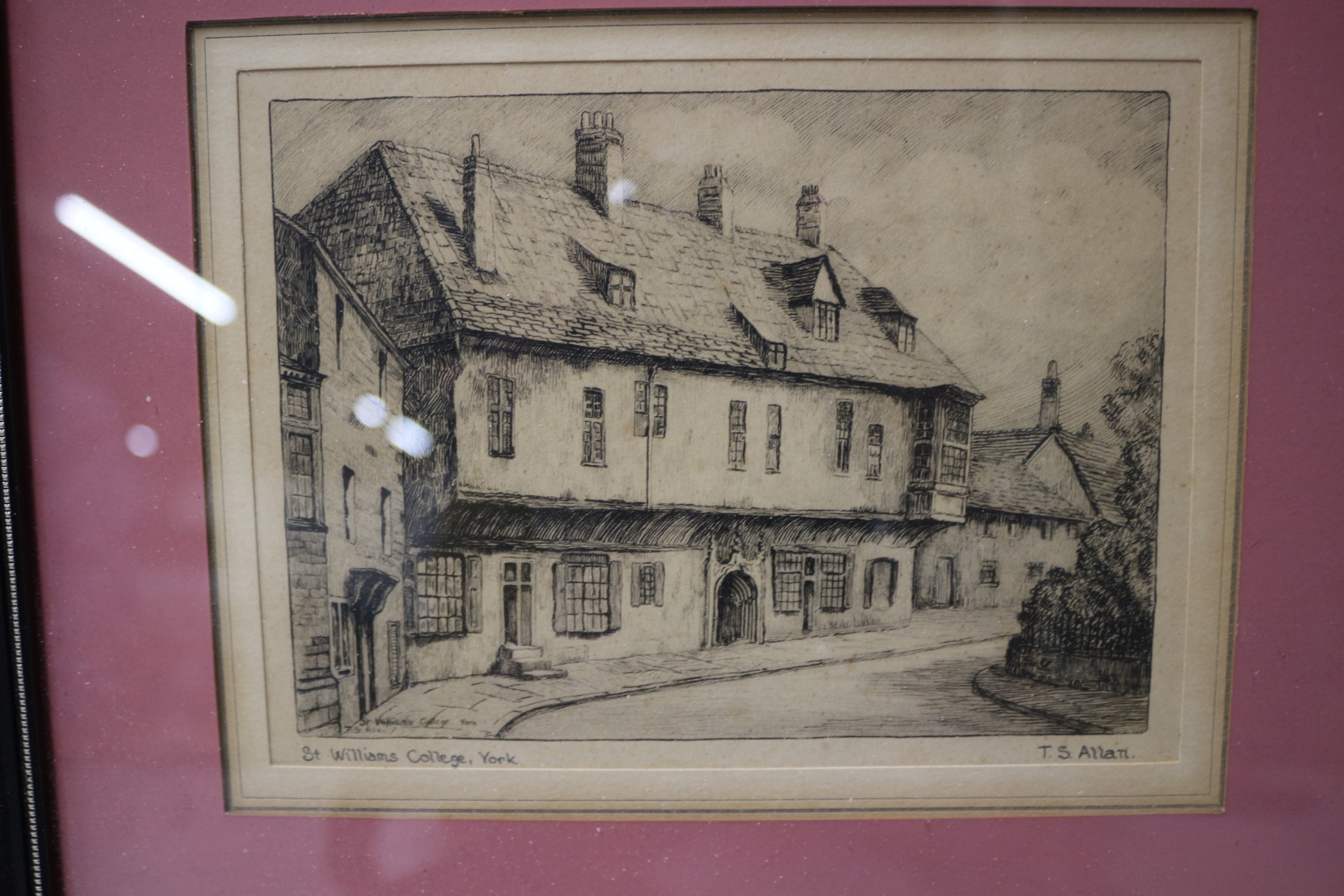 A pair of framed black and white architectural prints by T.S. Allan, titled ‘Stow-on-the-Wold’ and ‘St Williams College, York’, matted in dark pink and framed in dark brown/black. 26.5cmsq