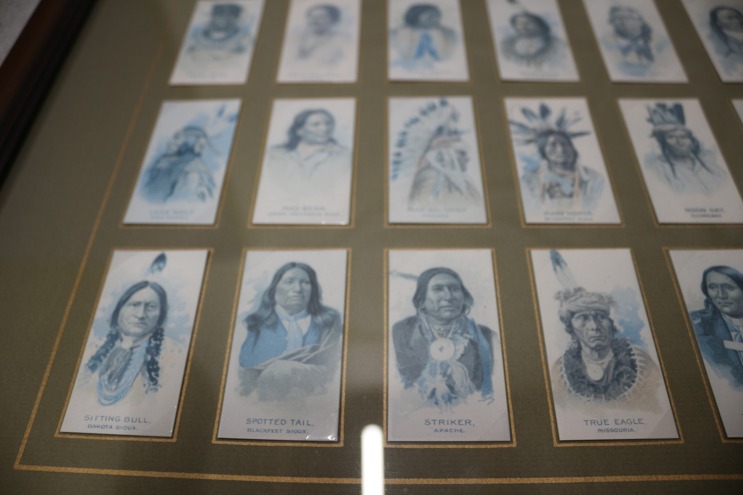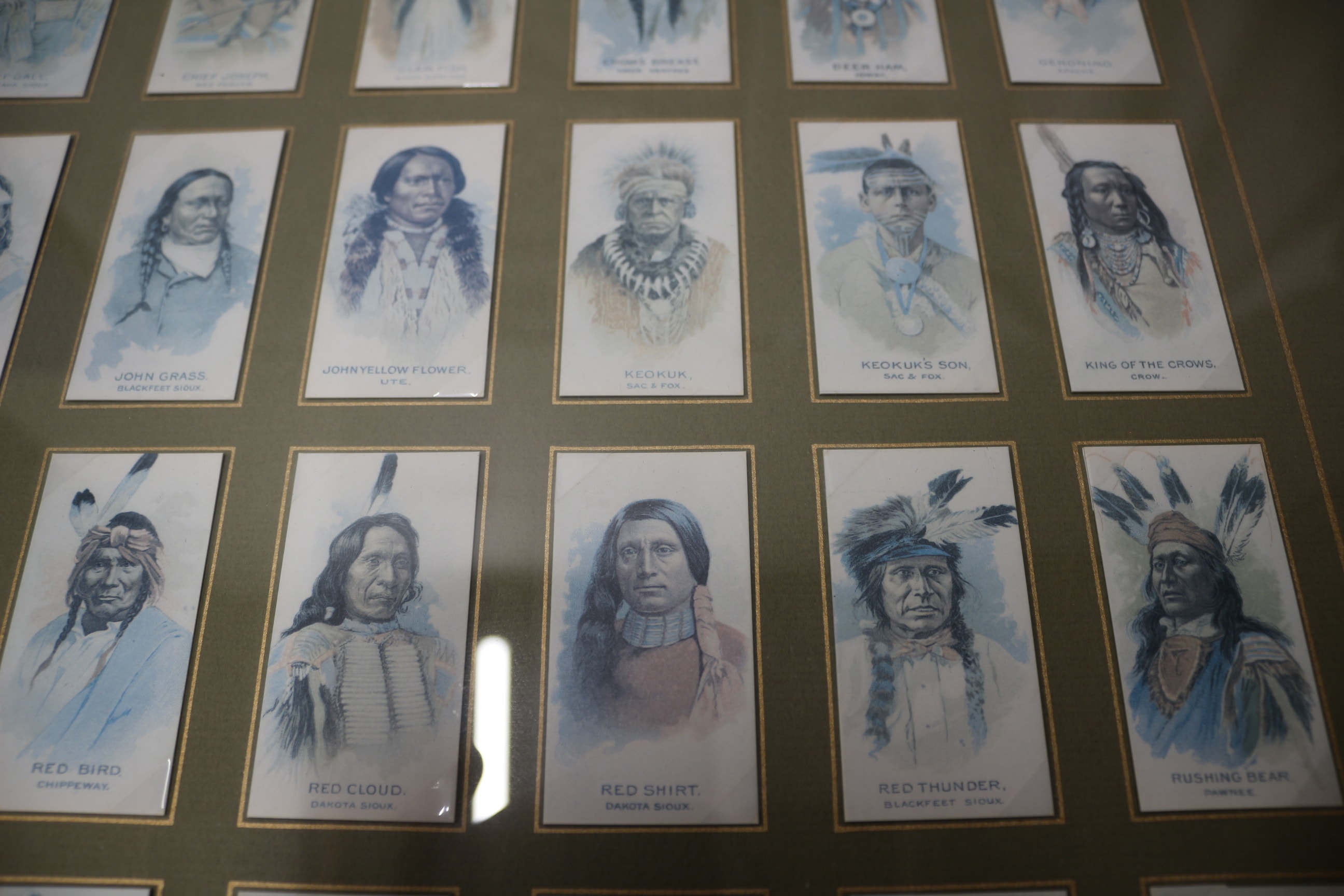 A dark brown framed collection of 50 blue/grey and white cigarette portrait cards of Native American figures, with an ‘American Indians 1888’ plaque, noted as an authorized re-issue set. 68.5x58cm