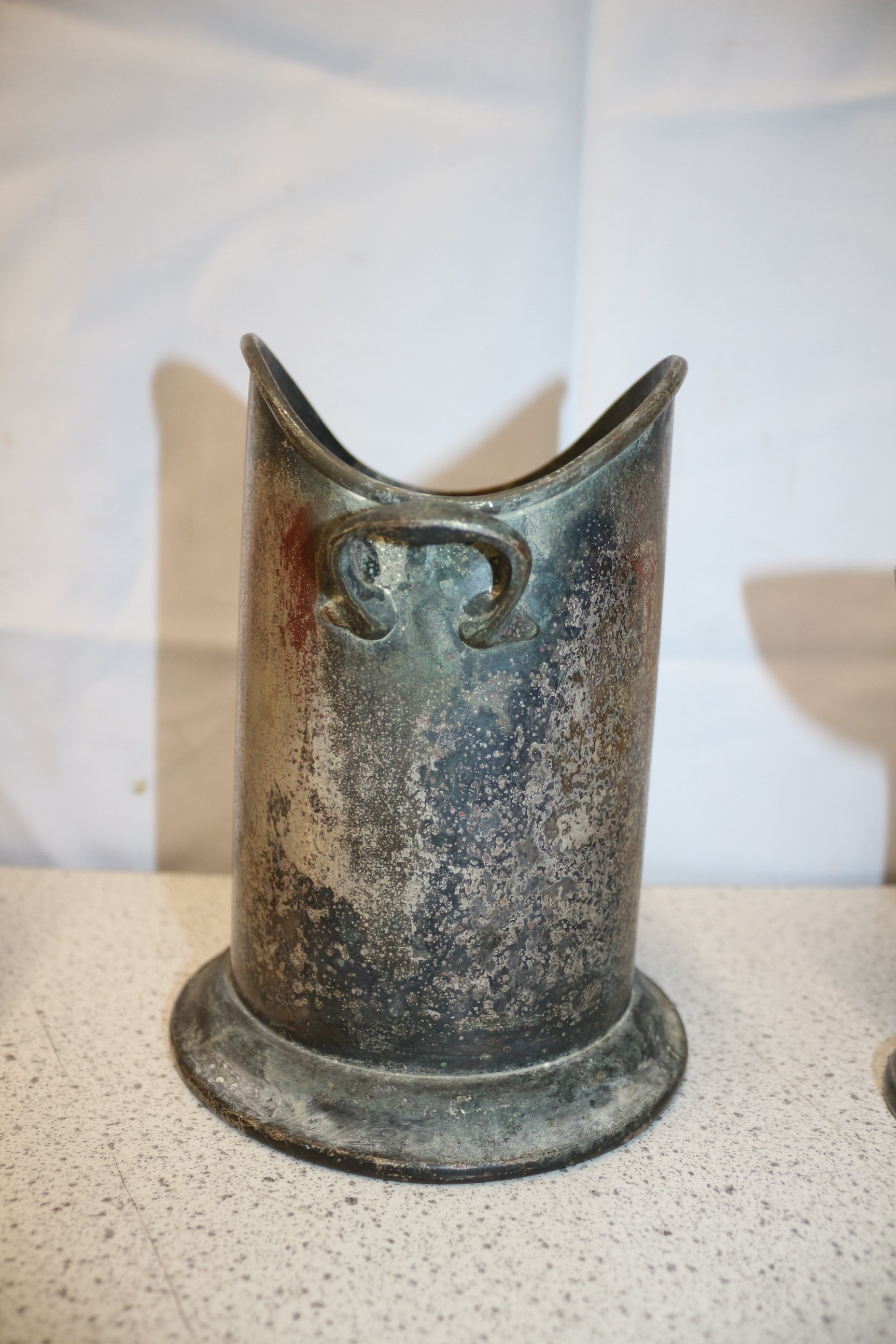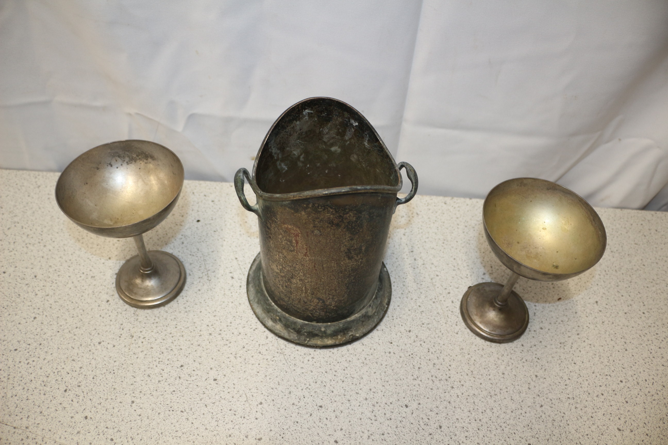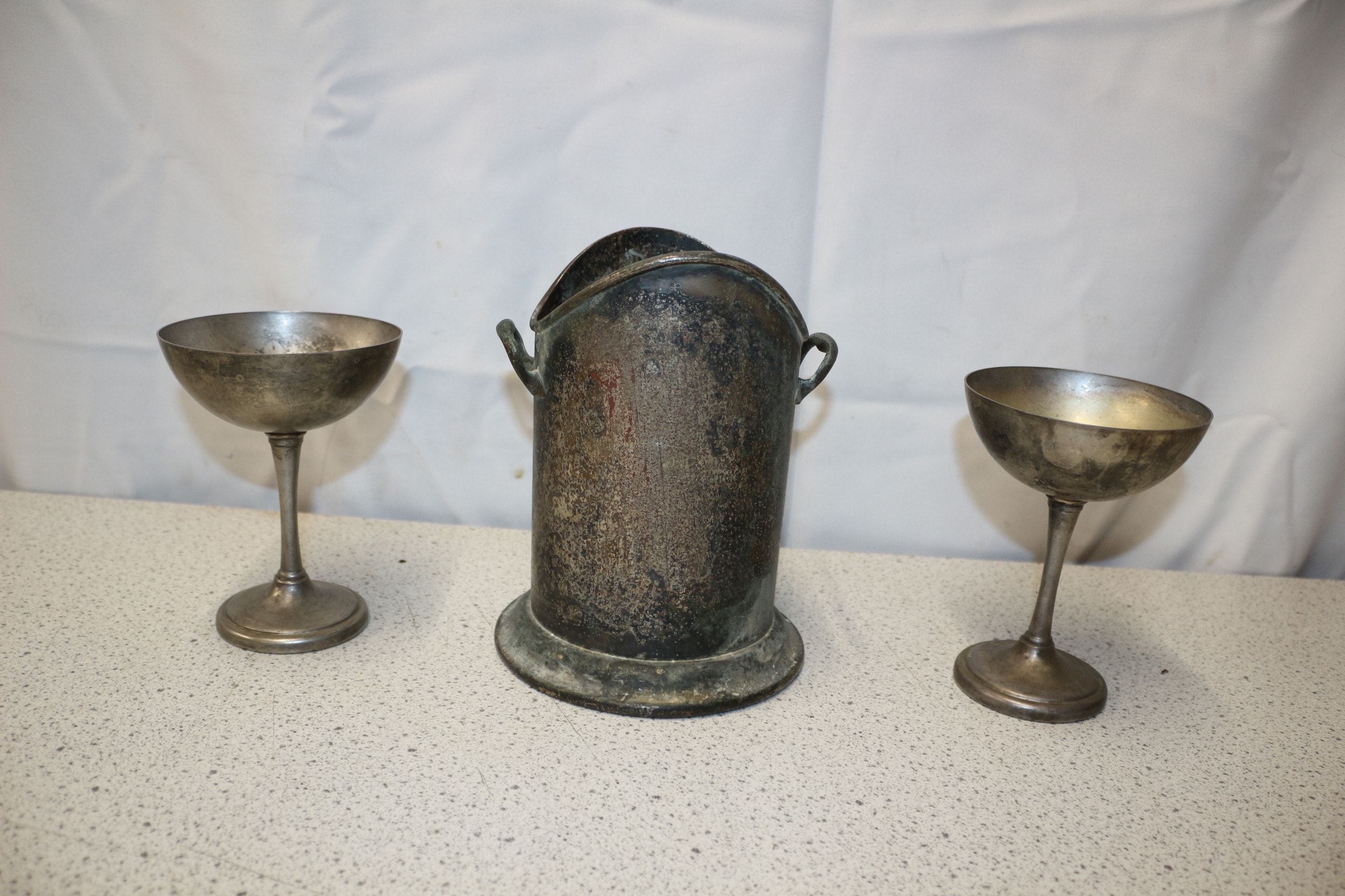 Two tarnished silver plated stemmed metal goblets, one marked “Arthur Price of England”, accompany a heavily tarnished dark grey wine cooler with side handles and a scooped top,