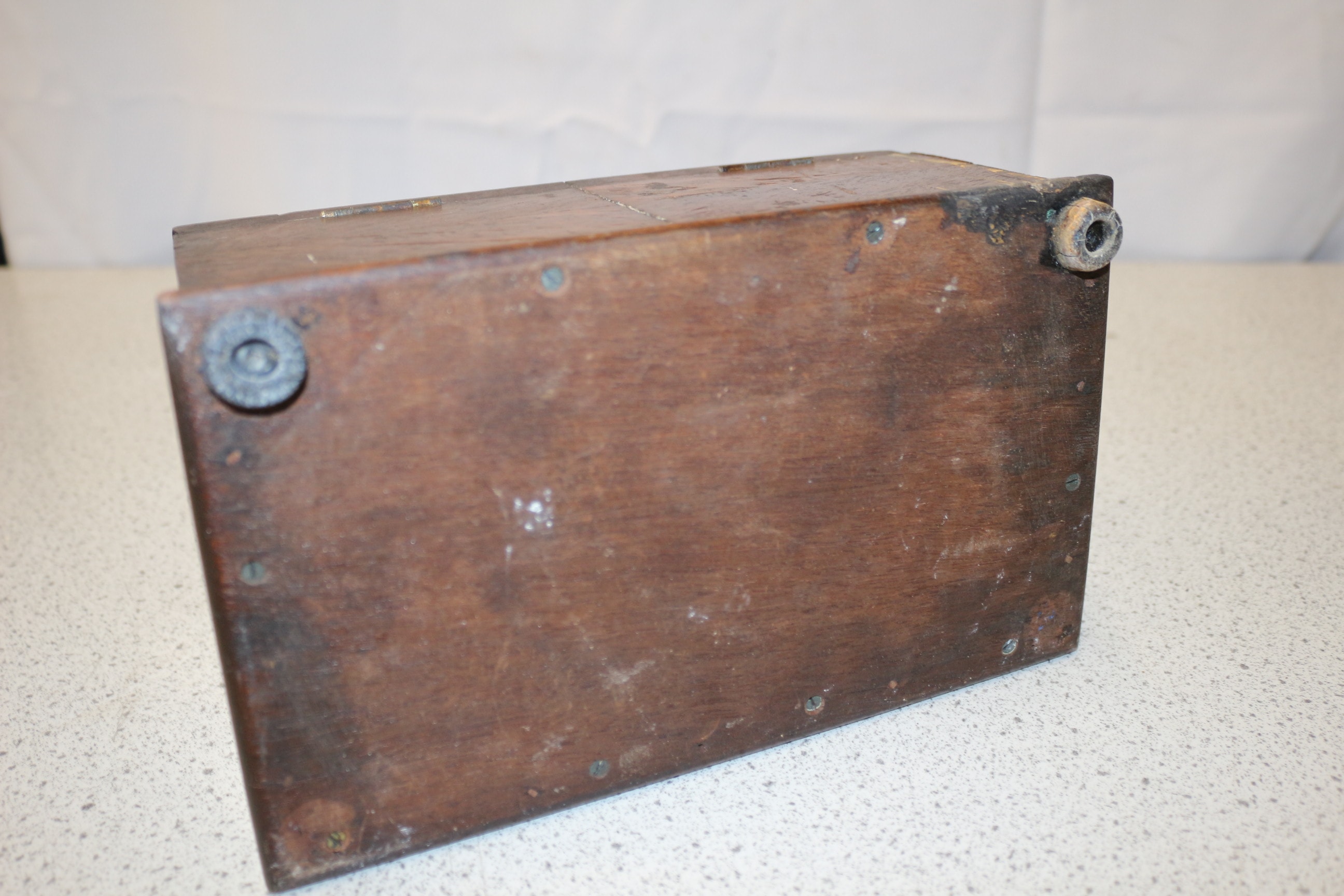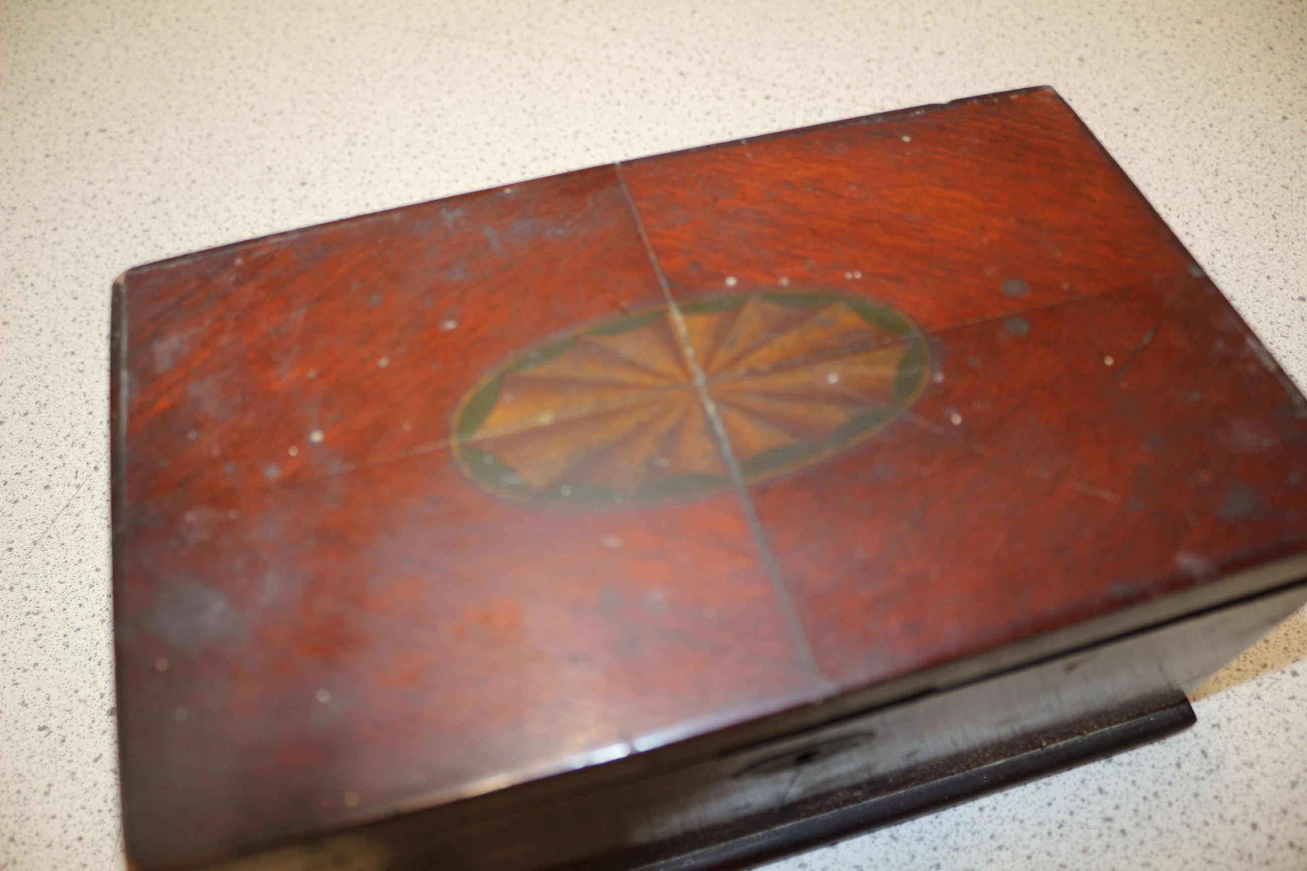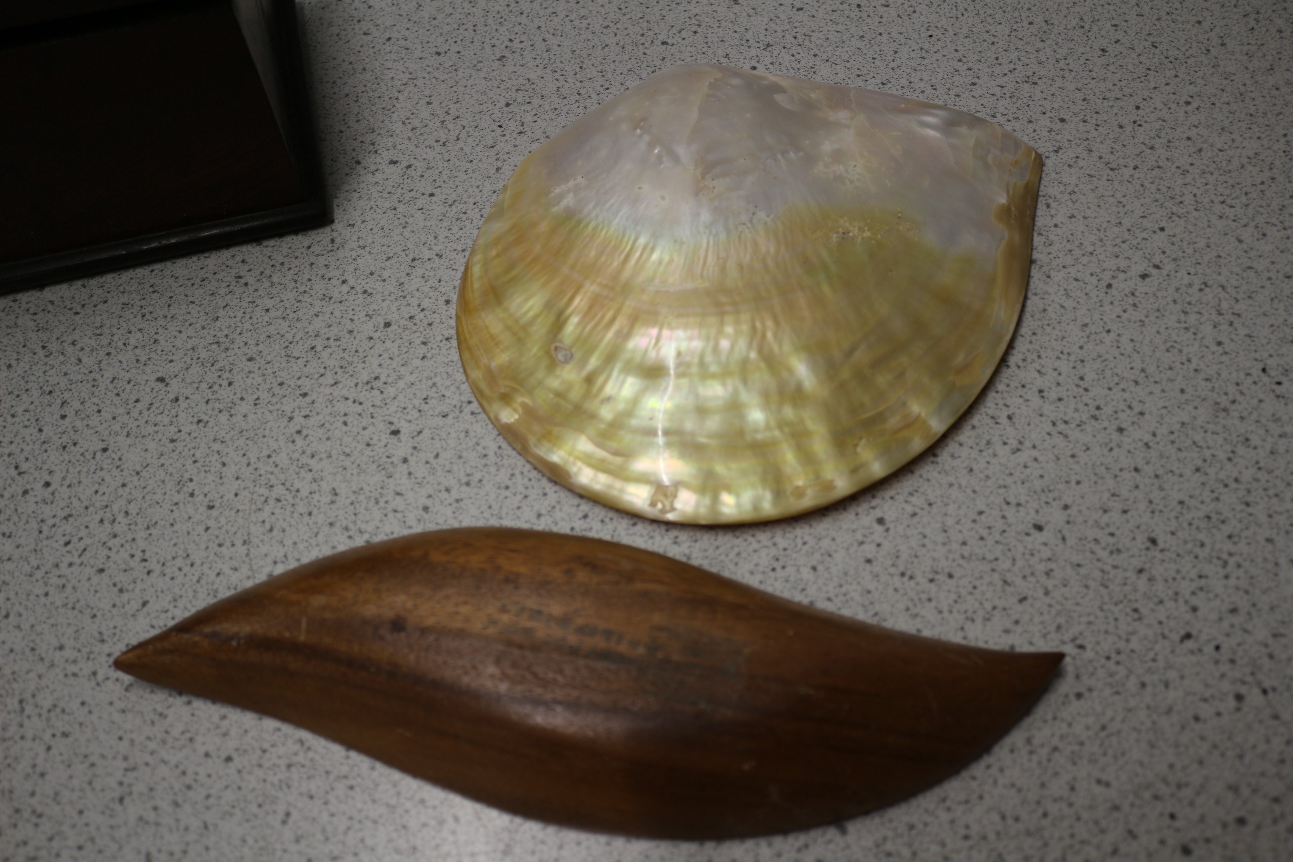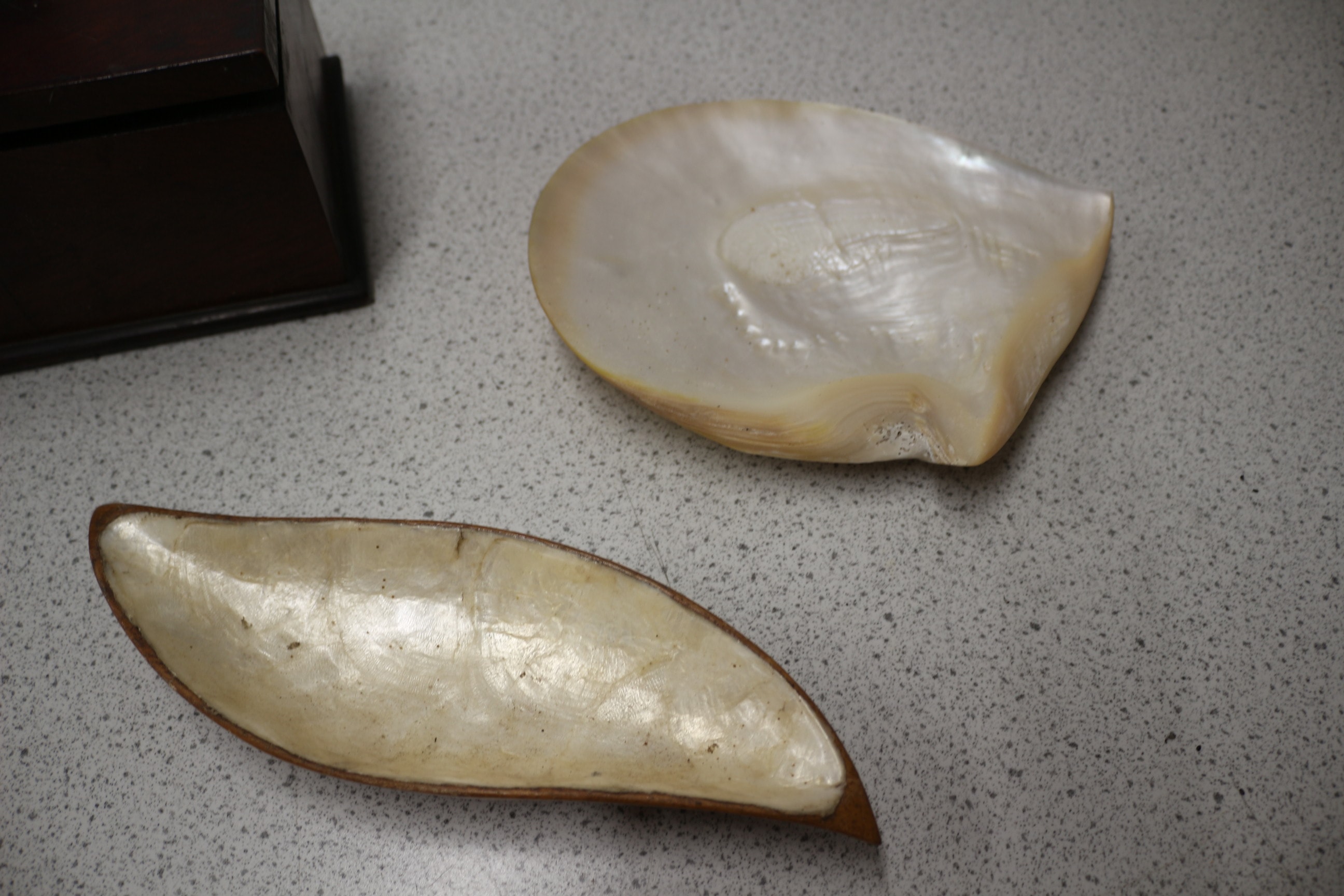 A dark reddish-brown wooden box with a green and light wood oval inlay design on the lid and a blue fabric interior (AF). Accompanied by one large iridescent off-white and yellowish shell and one smaller elongated off-white mother of pearl piece with a brown wooden base. Wooden box 11x23x13cm