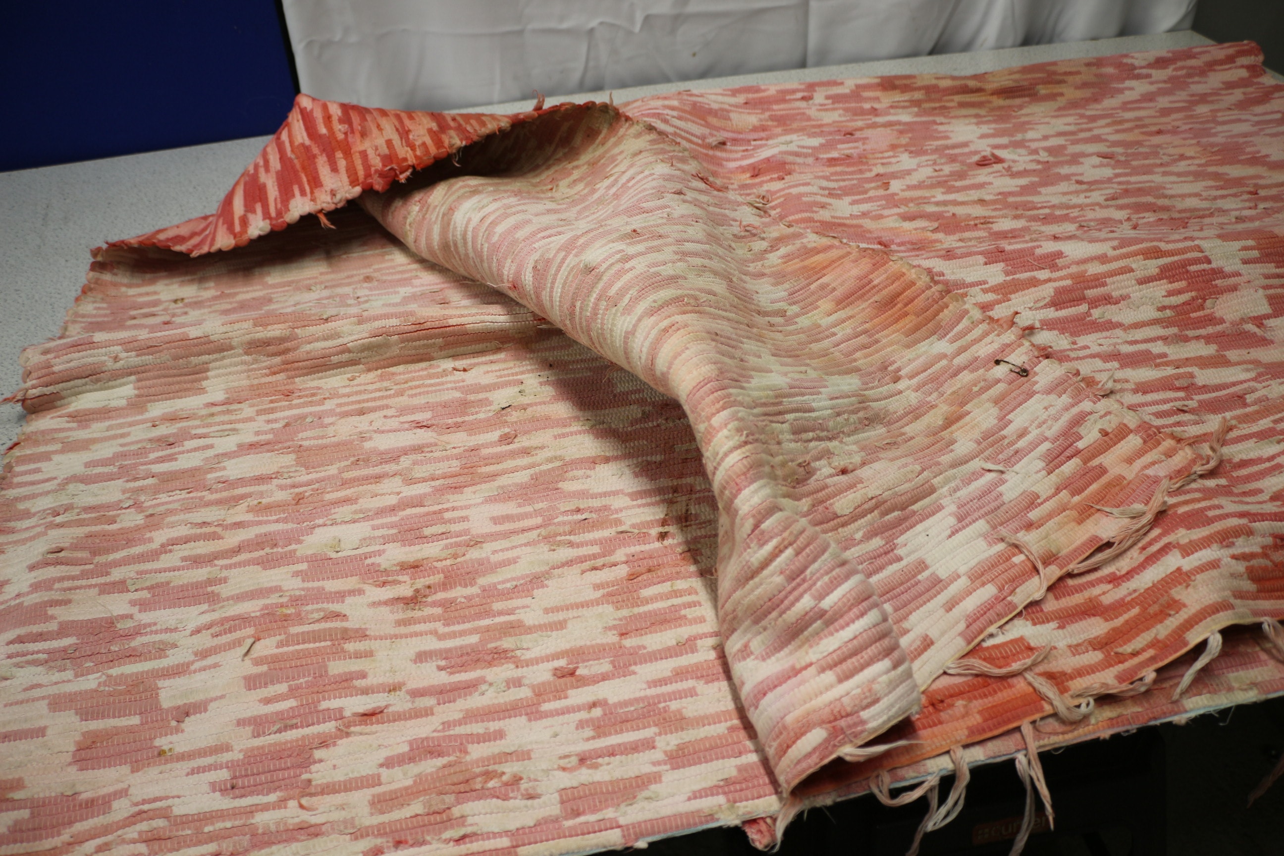 A large Woven rug primarily coloured in shades of pink, and cream with a striped pattern. (AF) 145x188cm
