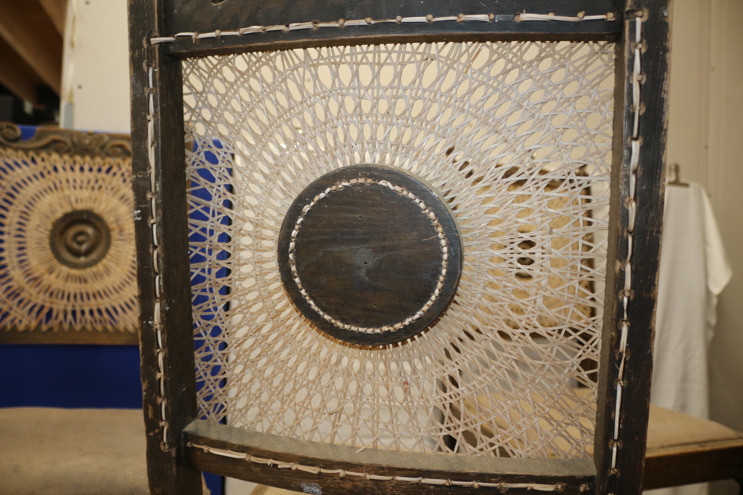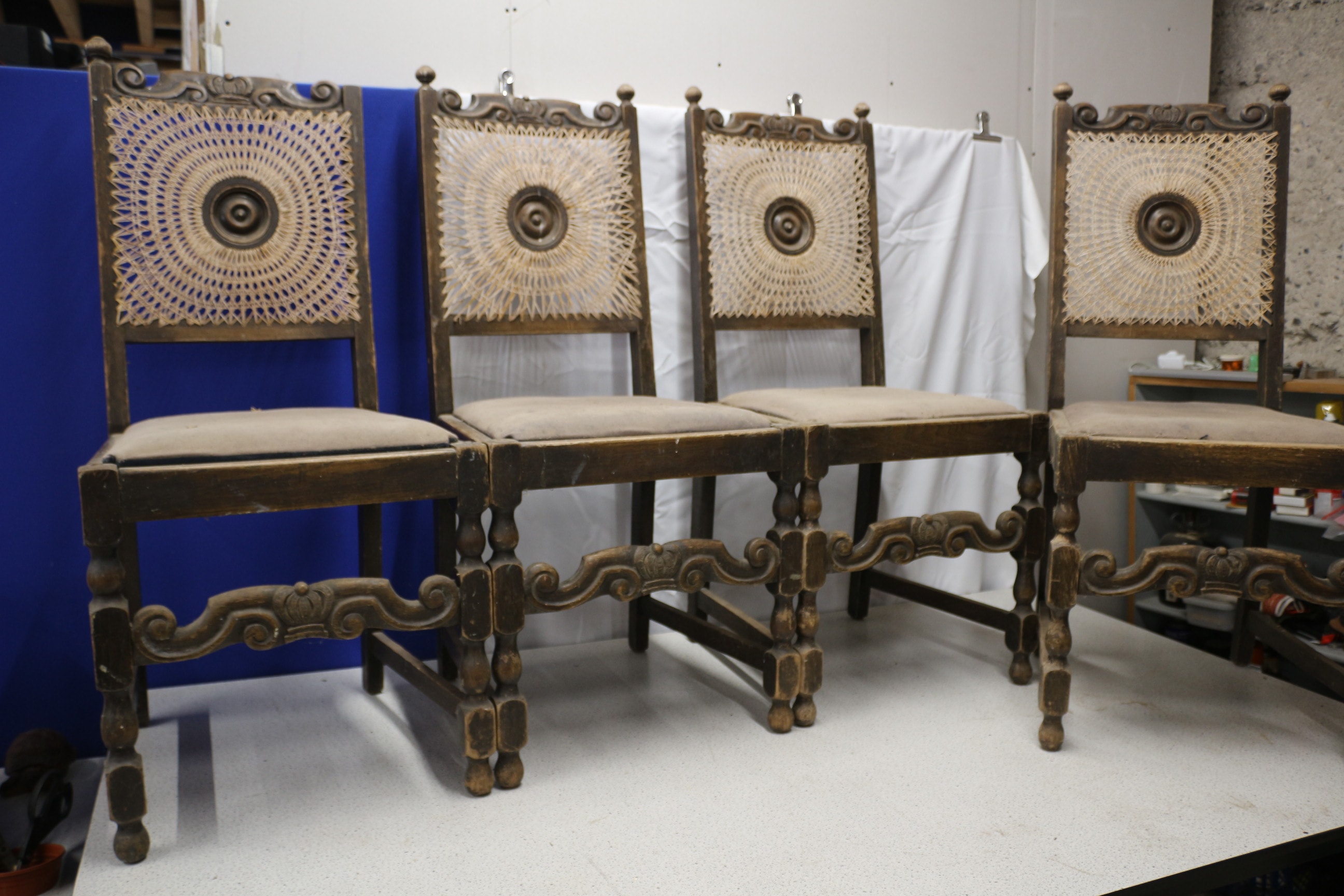 A set of four French Oak Breton Styled chairs with carved dark wood frames, woven cane backs featuring a central medallion, and upholstered seats. AF