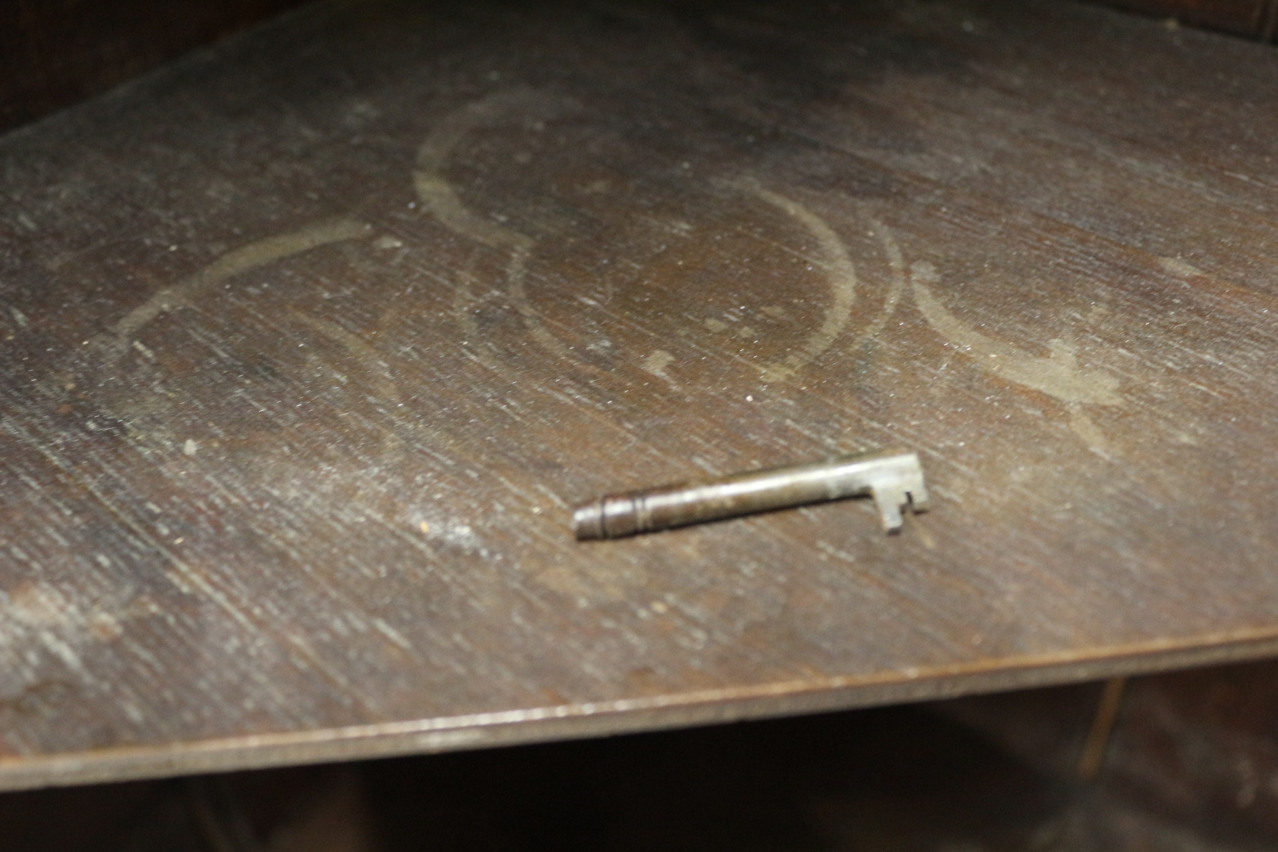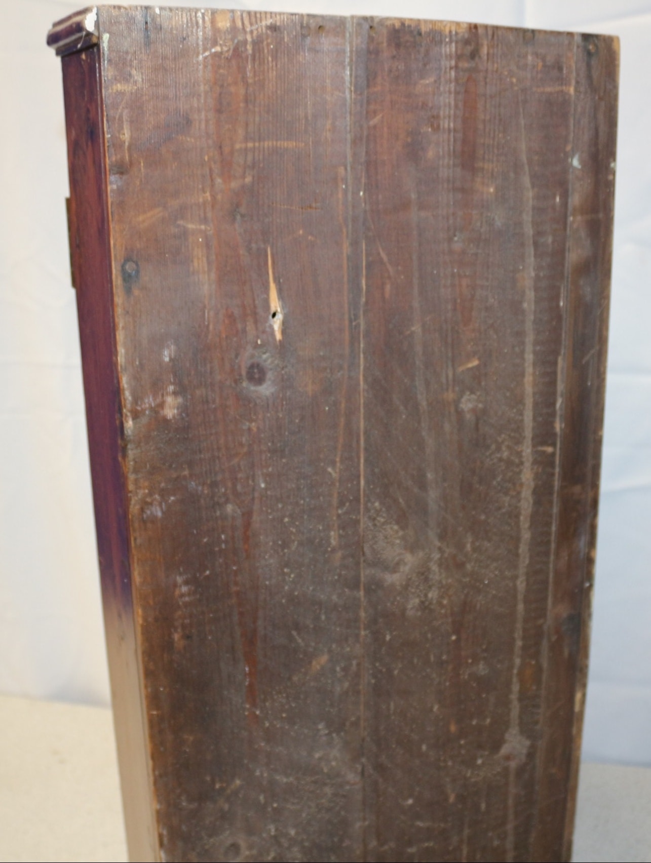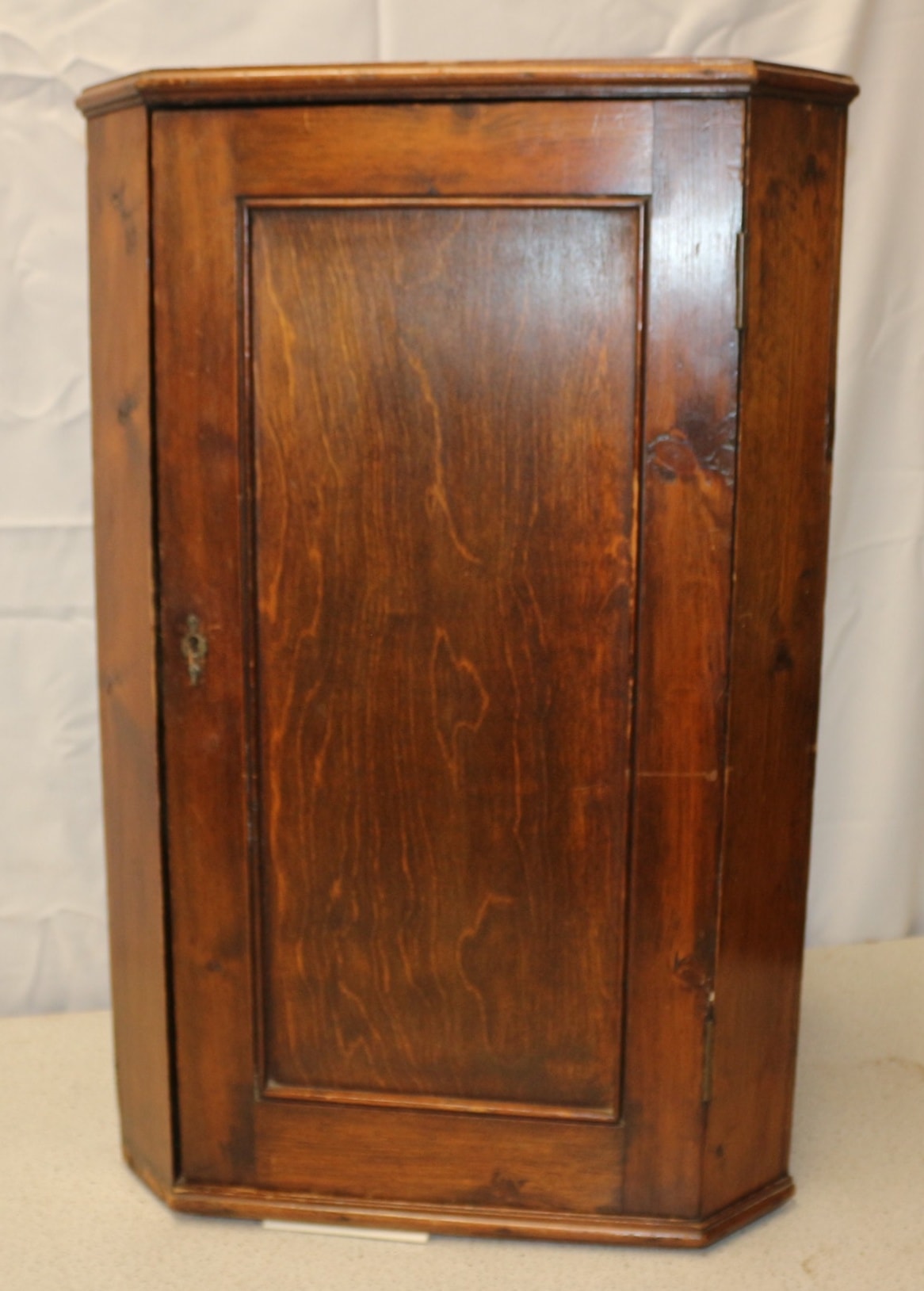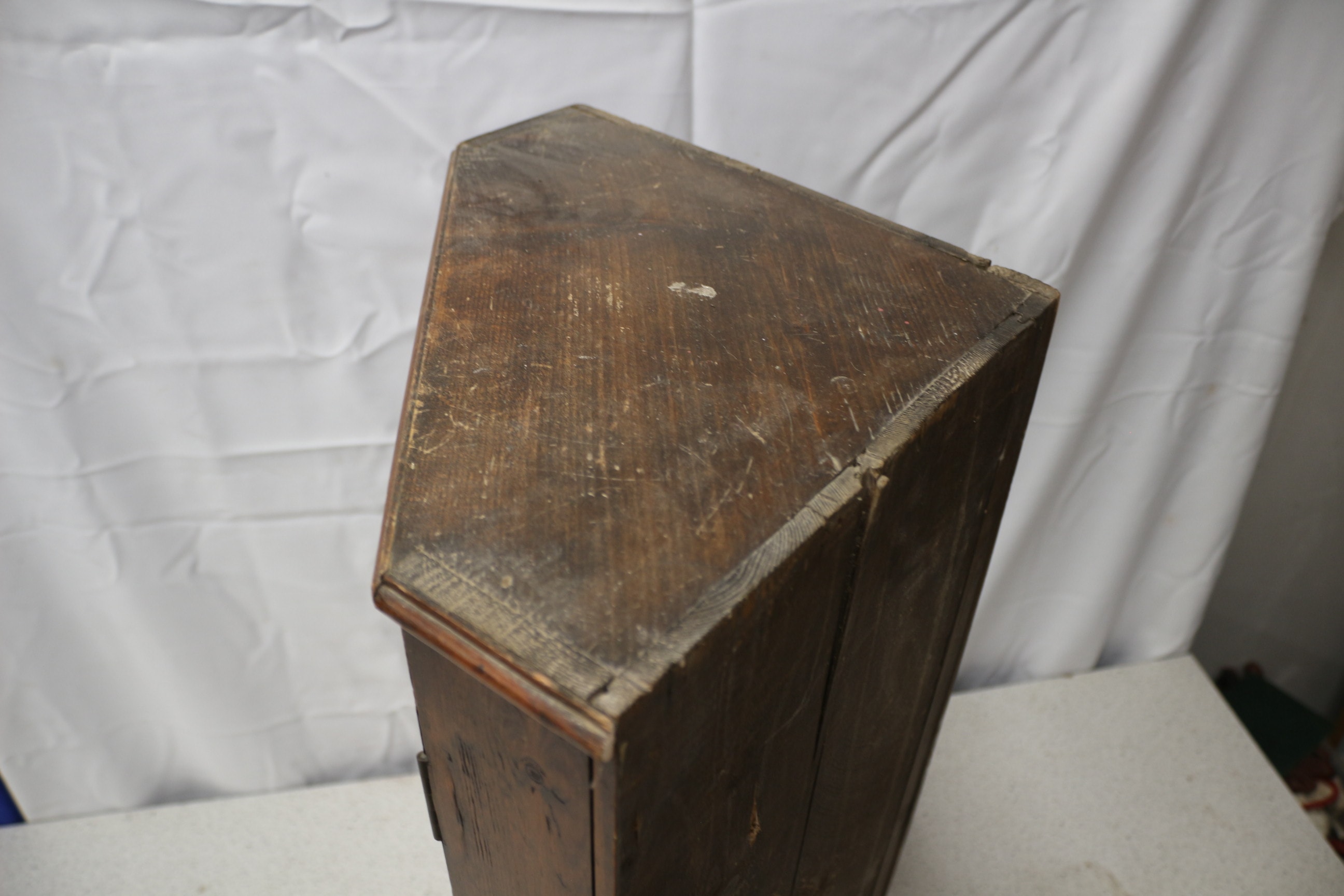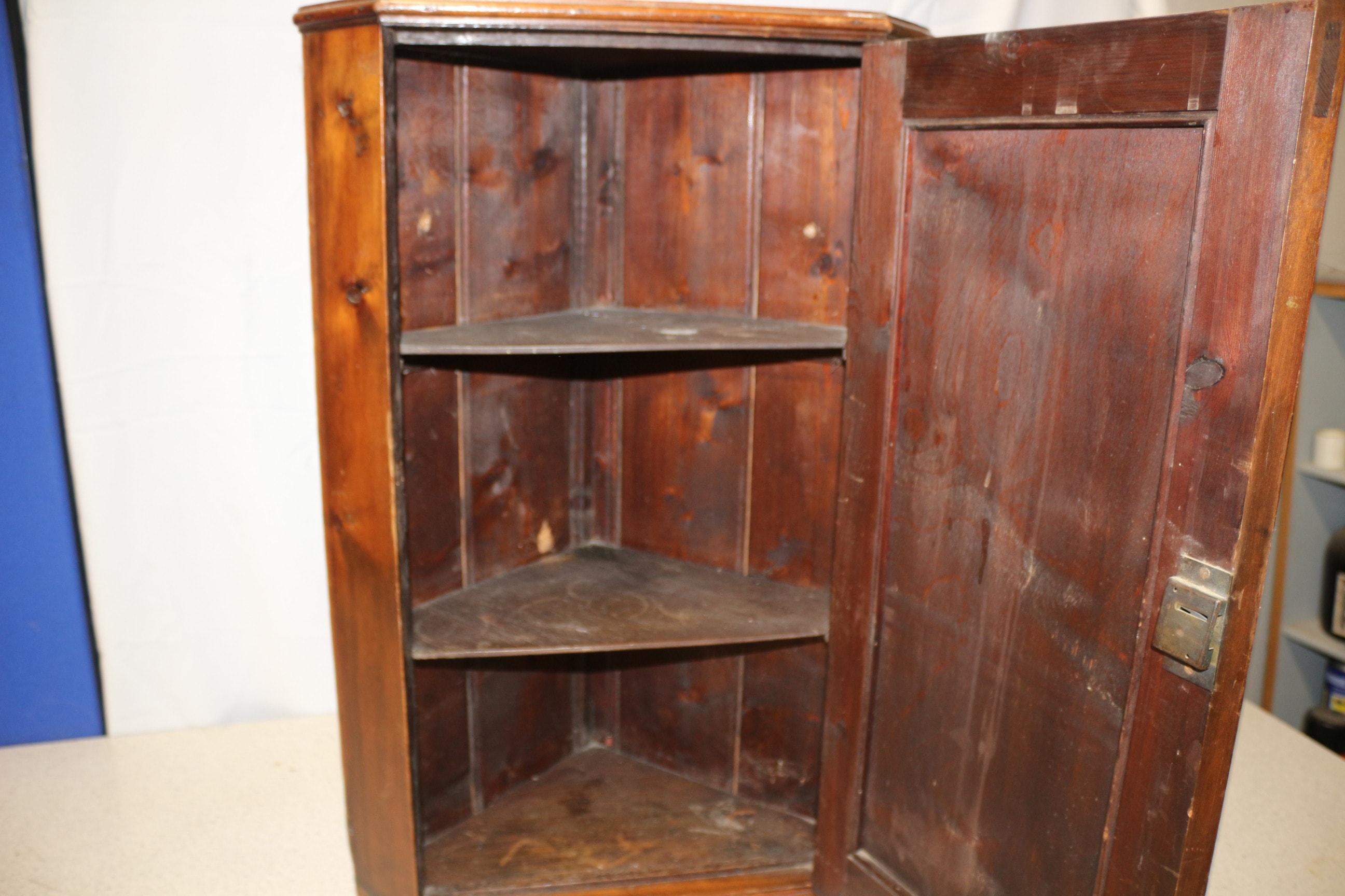 A brown wooden Wall Hanging corner cabinet with a single door, featuring an internal locking mechanism and two interior shelves. Lock and key in need of repair. 70cm Tall