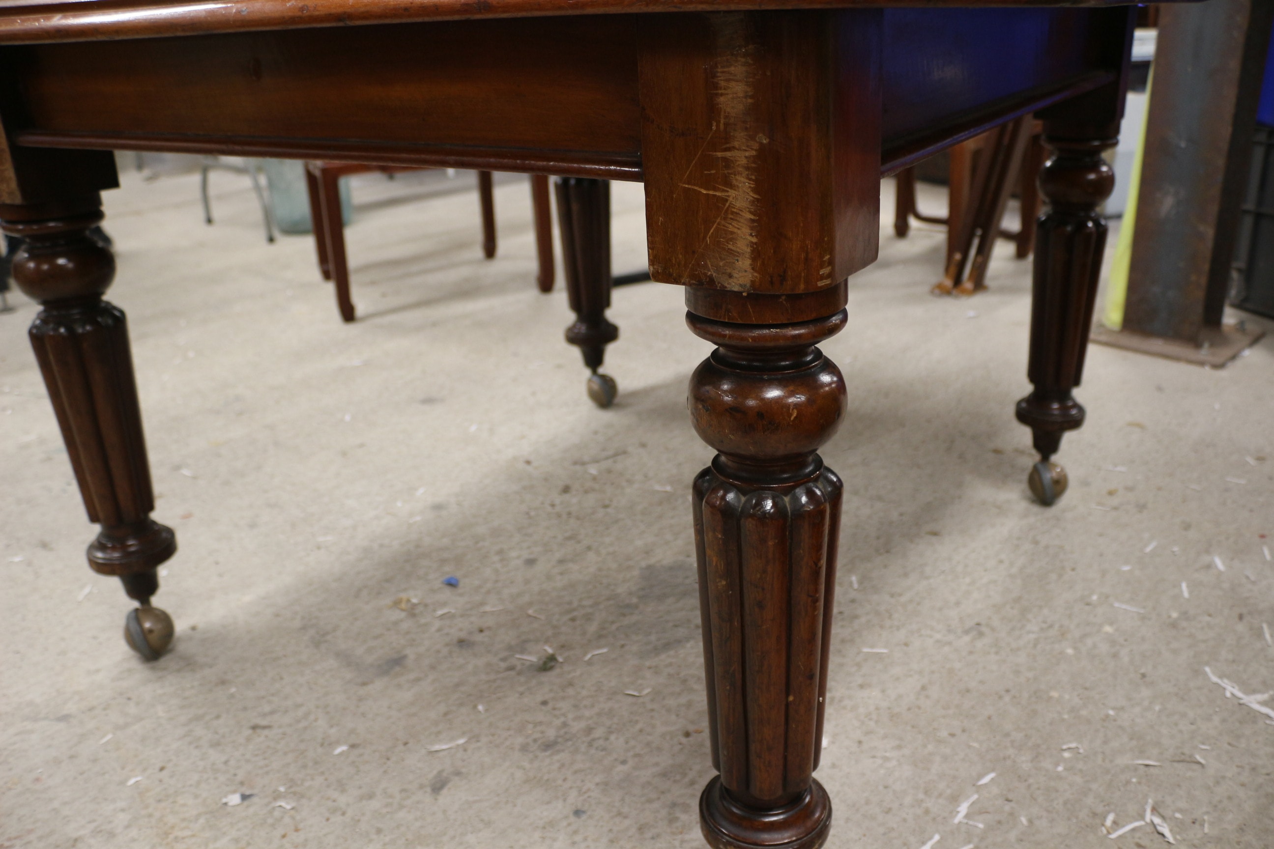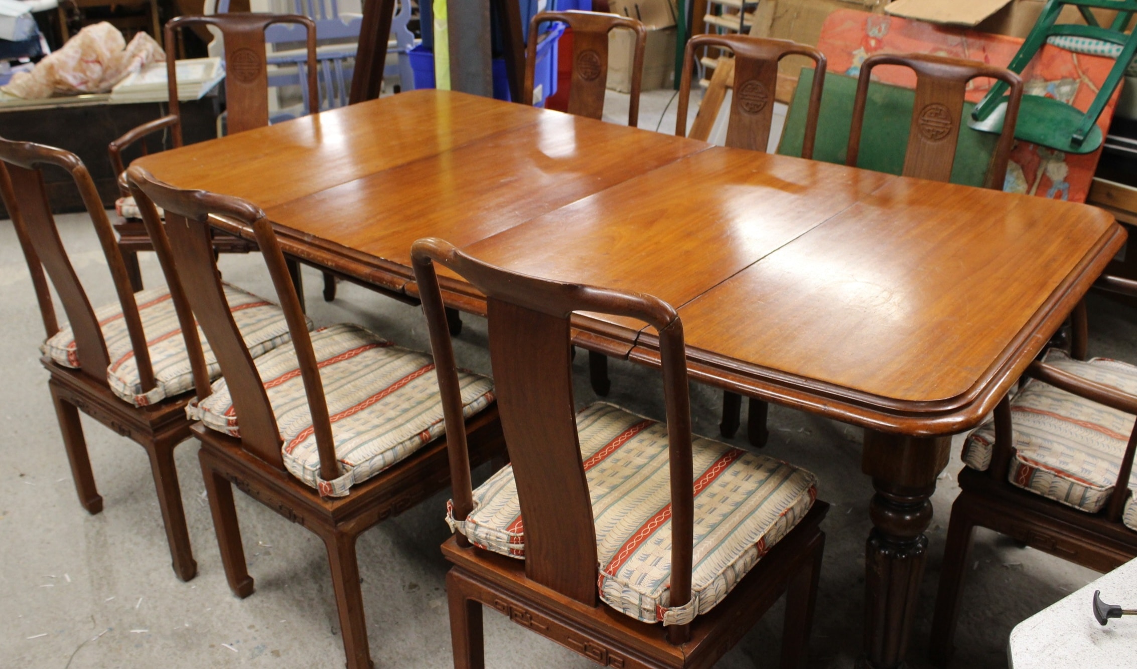 An extendable Early Victorian age wooden dining table with turned legs in a reddish-brown finish with central extension sections, accompanied by eight matching wooden dining chairs in reddish-brown, featuring carved “Shou” character motifs on their backrests and geometric “leiwen” patterns on the aprons, with cream-coloured cushions displaying blue and red striped patterns. Some chairs have had a basic repair. Extended 207x 115cm