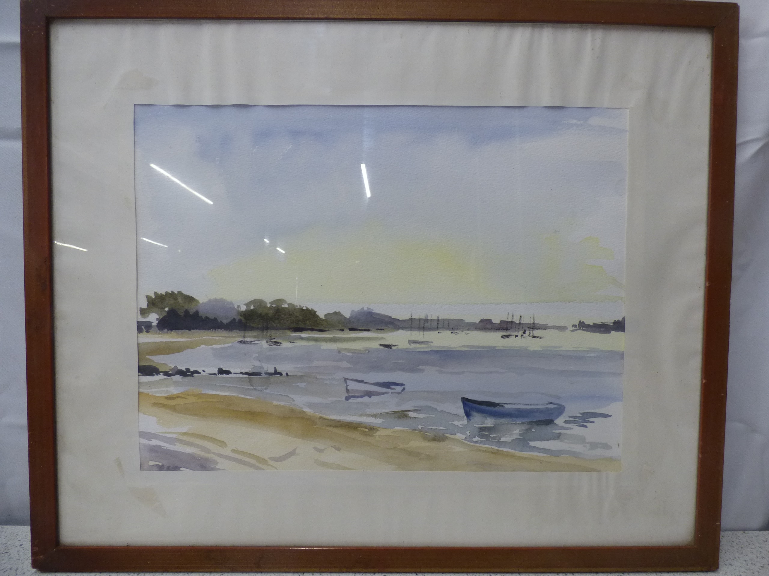 A framed watercolour painting depicting a coastal landscape with several boats in hues of blue, green, yellow, and brown. 54x44cm
