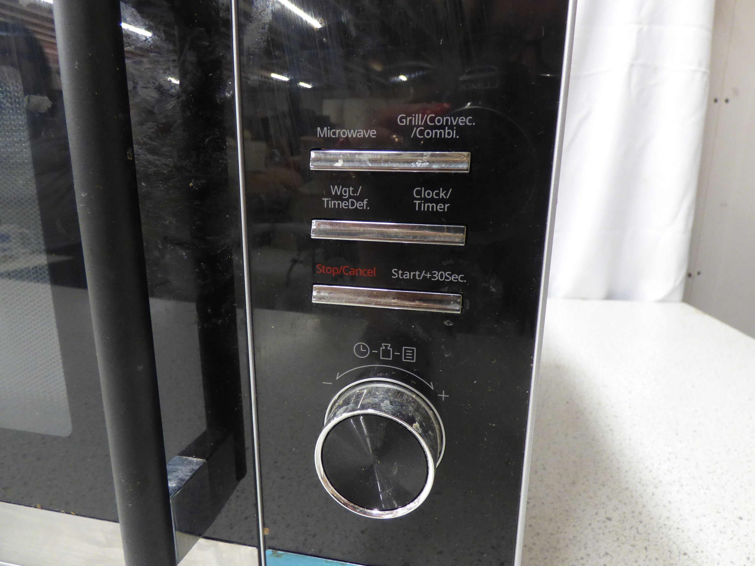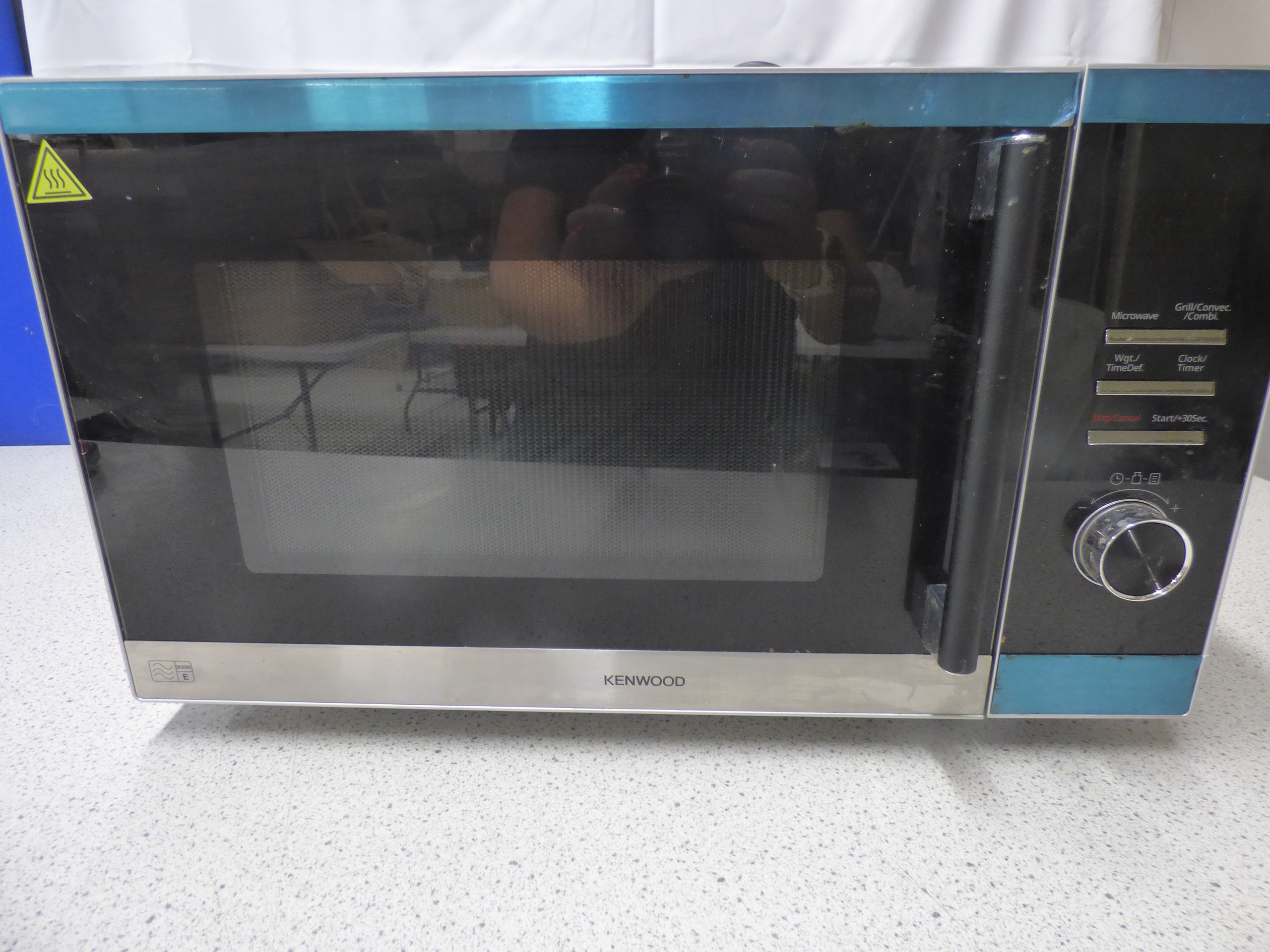 A black and silver/stainless steel KENWOOD microwave oven, featuring a control panel with functions including Microwave, Grill/Convec./Combi., and Clock/Timer. Untested