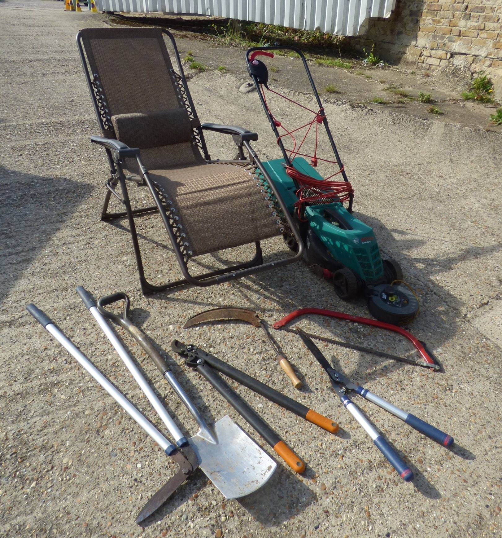 A brown mesh and black metal framed reclining garden chair, a green and black Bosch Rotak 32-12 electric lawnmower with a red power cord, and a group of garden tools consisting of one pickaxe, one shovel, one pair of black and orange loppers, one rusty sickle with a wooden handle, one red and silver bow saw, and one pair of blue and silver hedge shears.